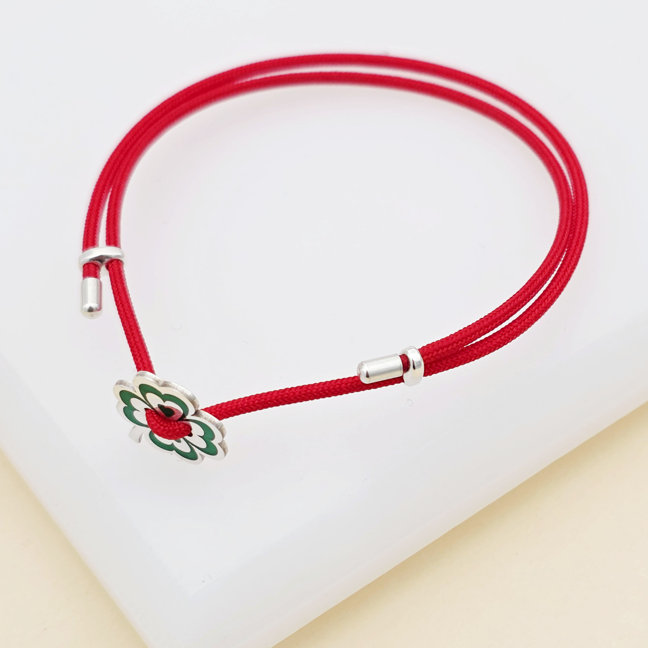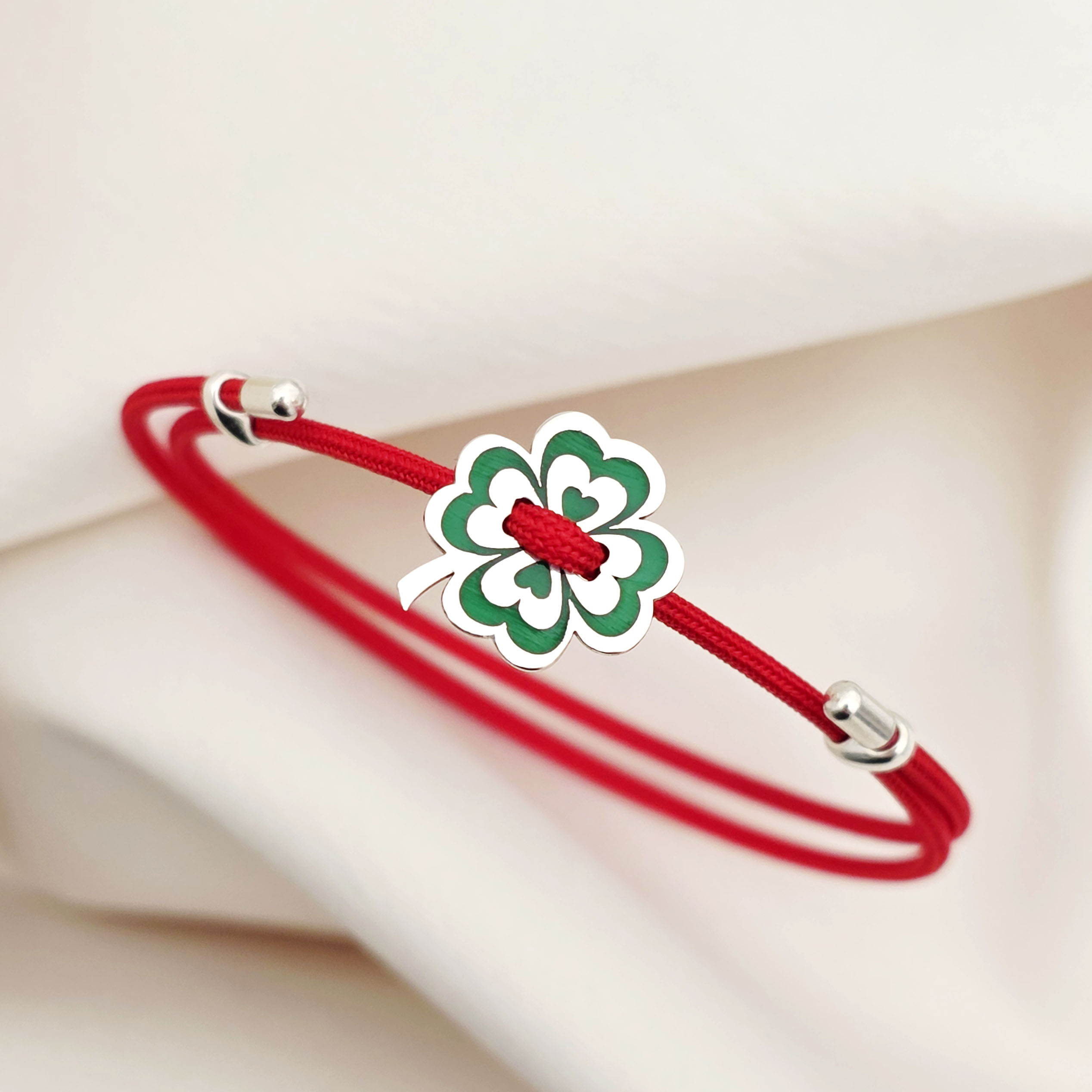 Brățara Trifoi cu patru foi si email verde - Șnur rosu Gros - Argint 925