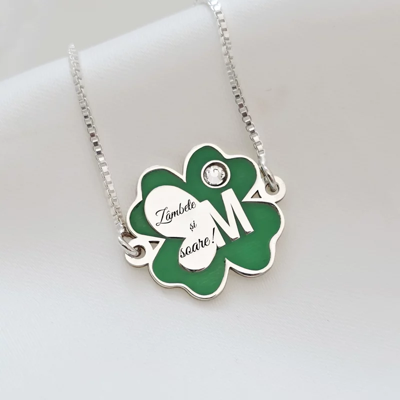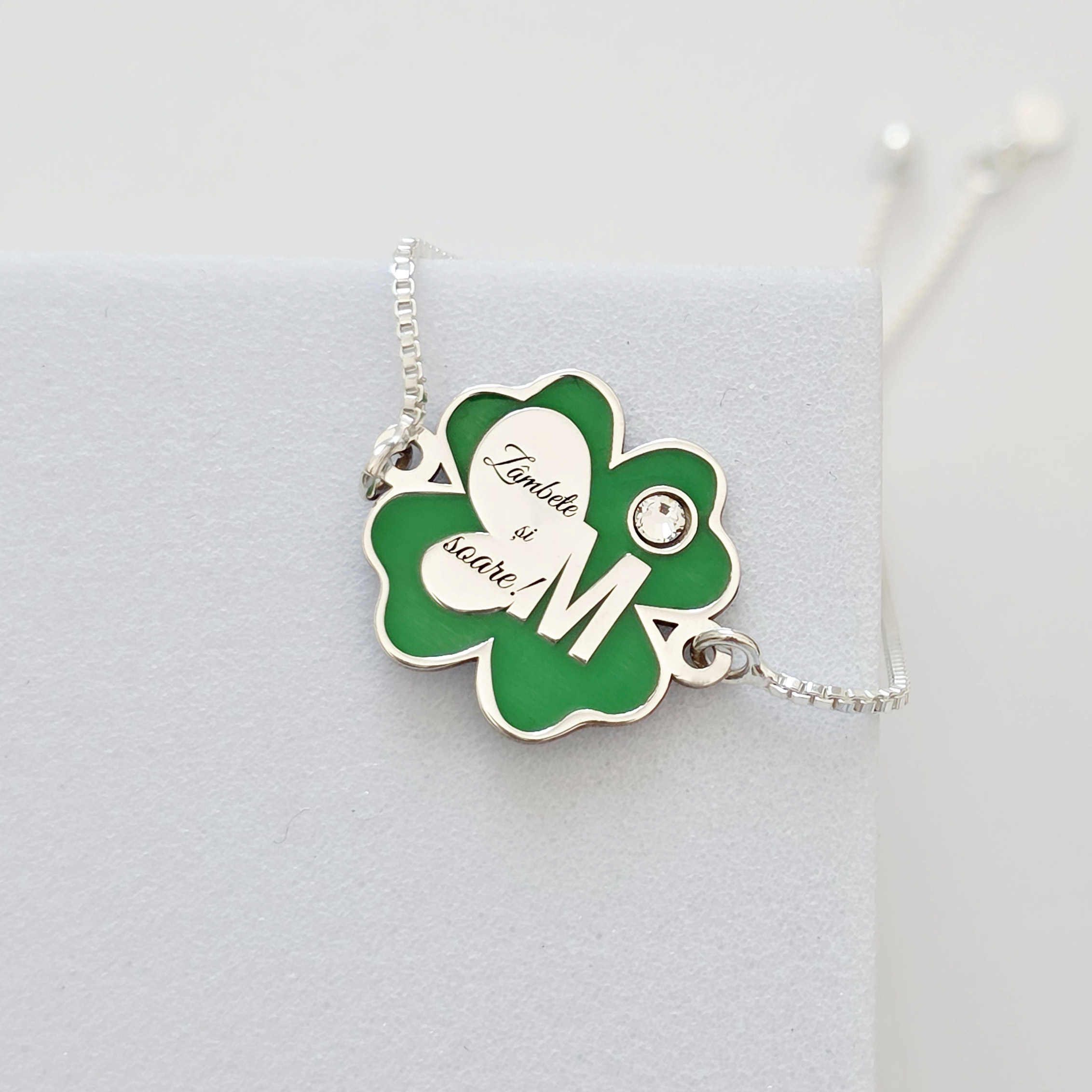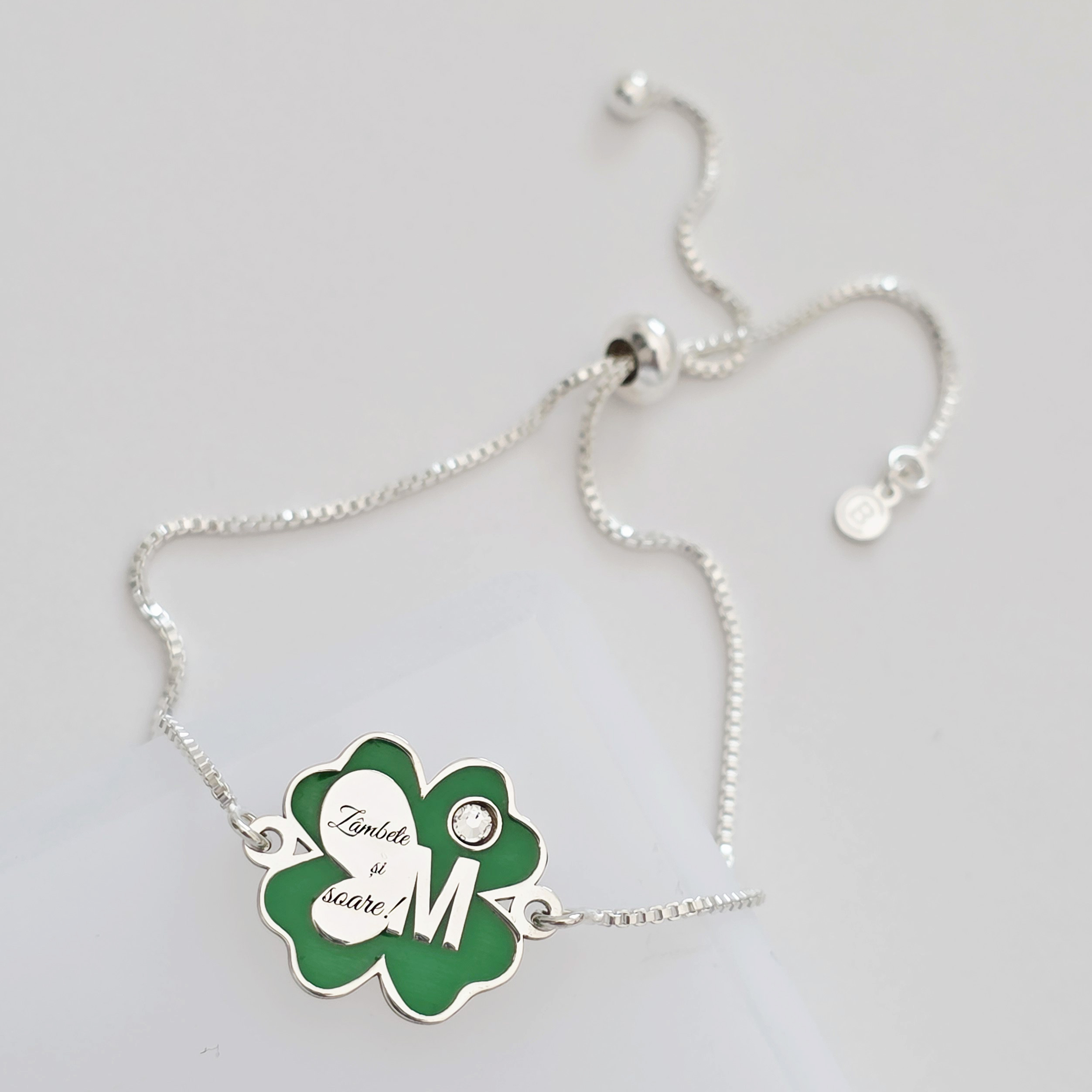 Brățara Trifoi cu Zambete – Initiala personalizata - Pandantiv si lant glisant din Argint 925 - Email verde & Cristal Swarovski