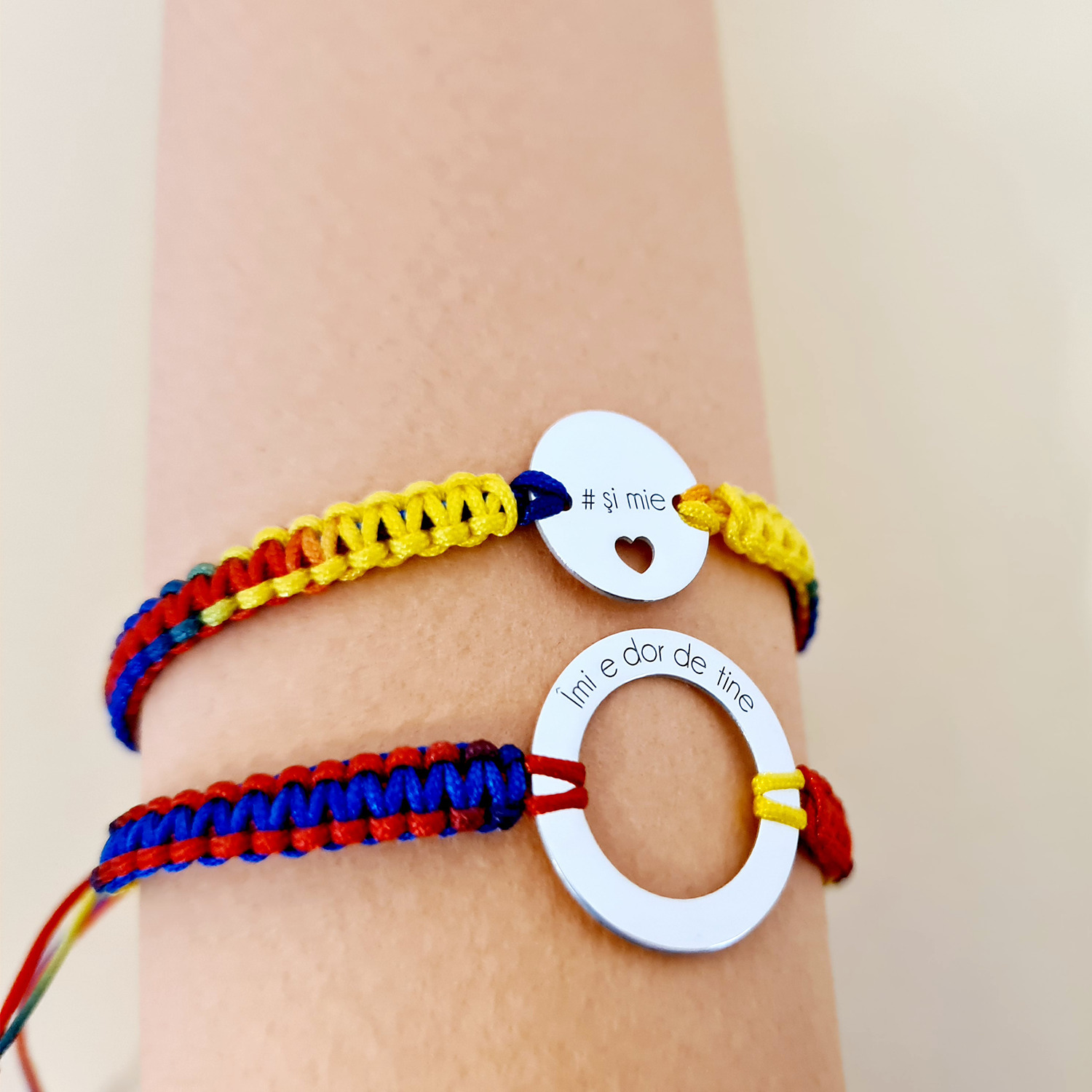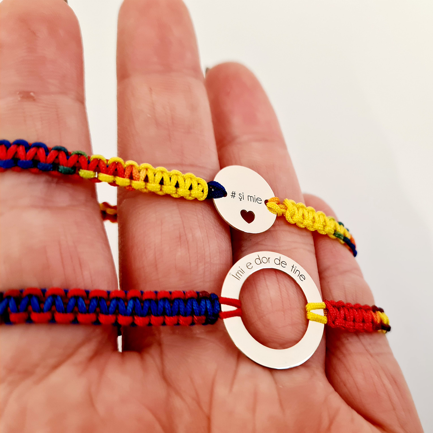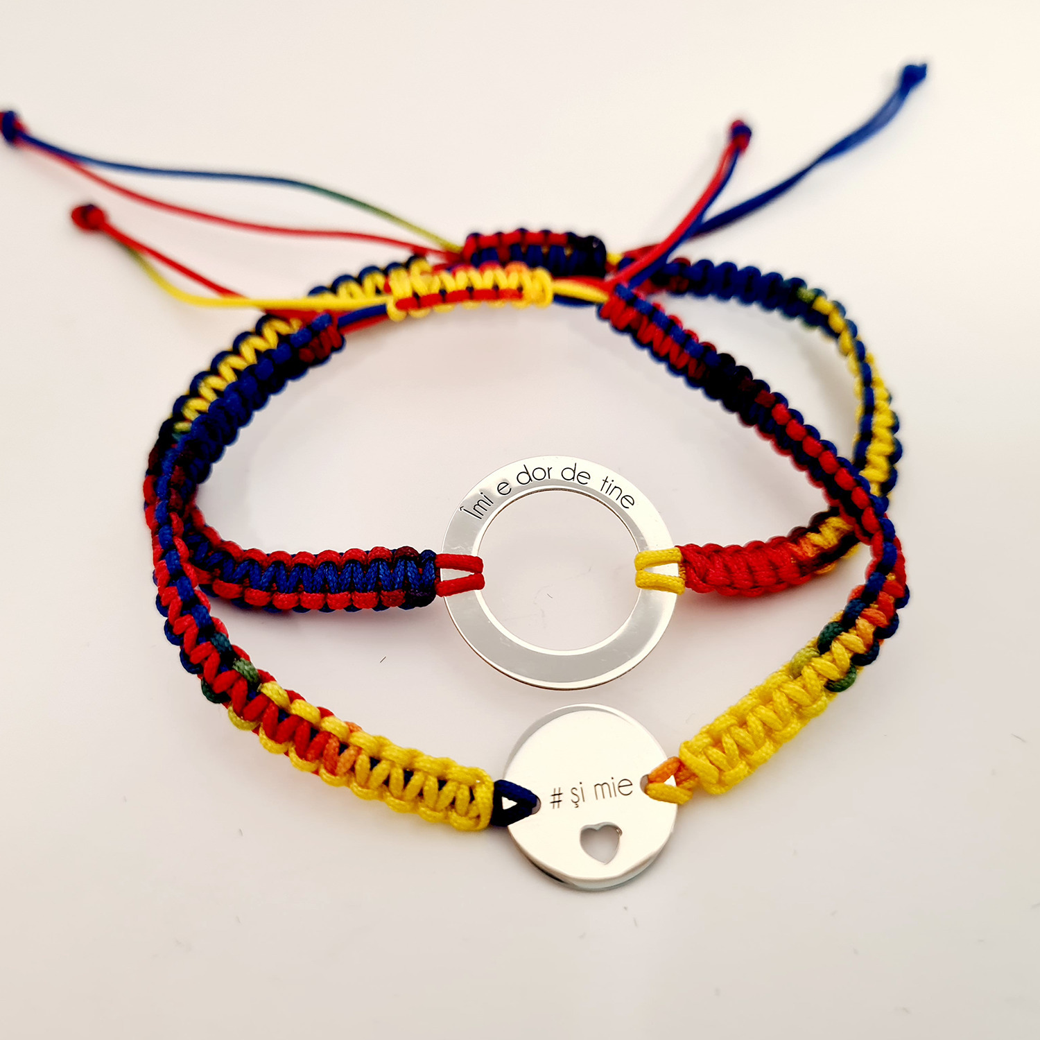 Set 2 bratari personalizate - Dor de tine - Disc si banut cu inima decupata - Argint 925 - Snur impletit tricolor