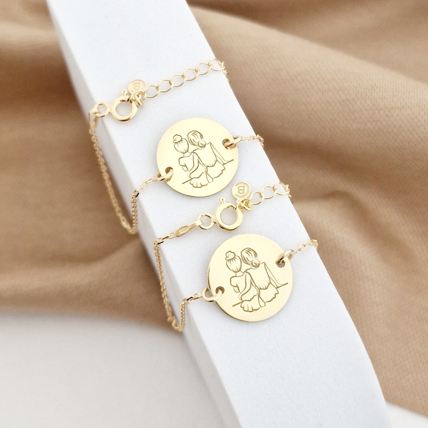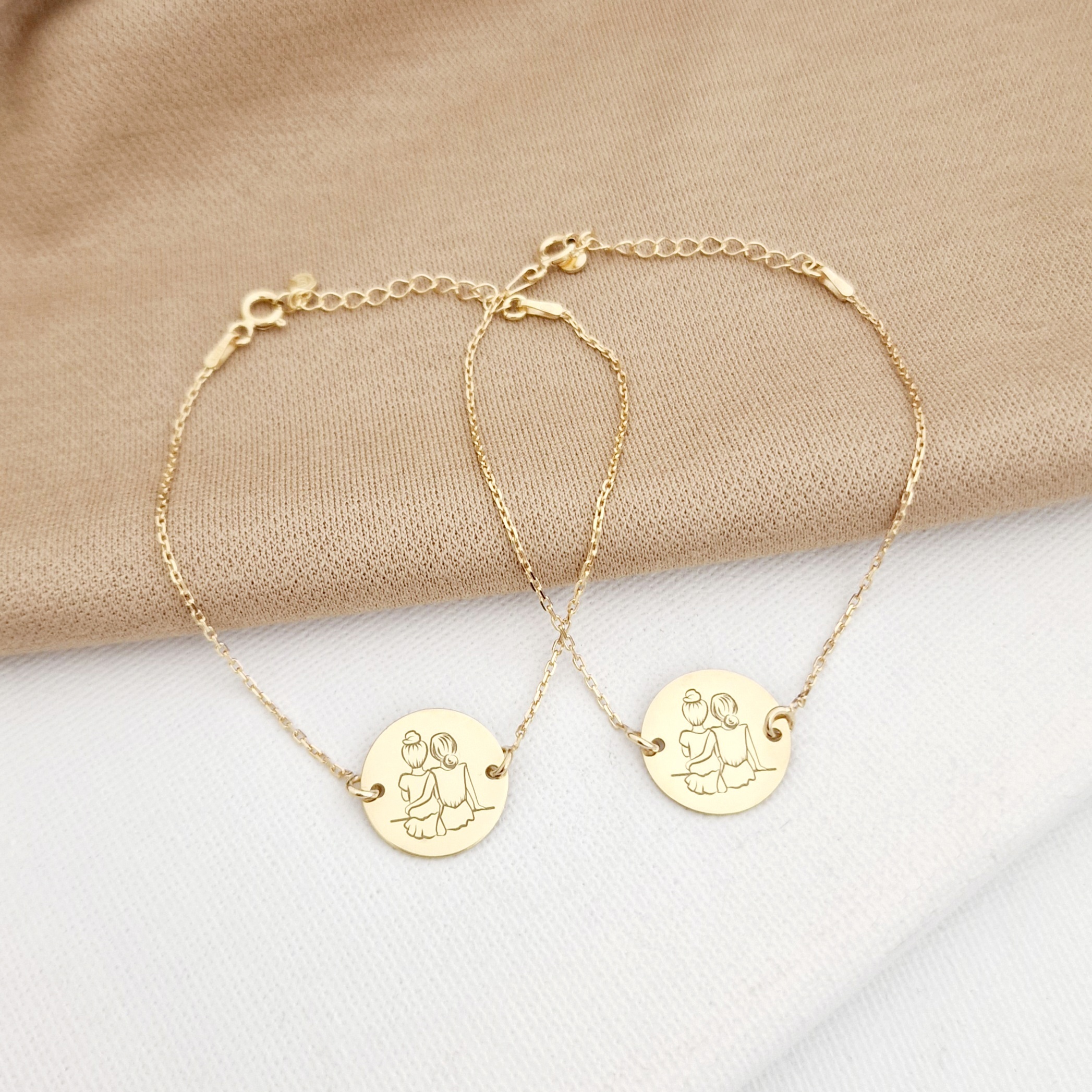 Bratarile din set sunt create din Argint 925 placat cu Aur Galben 18K prin taiere si gravare laser, avand diametrul banutului de 15 mm si fiind atasate de un lantisor din Argint 925 placat cu Aur Galben 18K. Pretul afisat este pentru ambele bratari si gravarea inclusa.