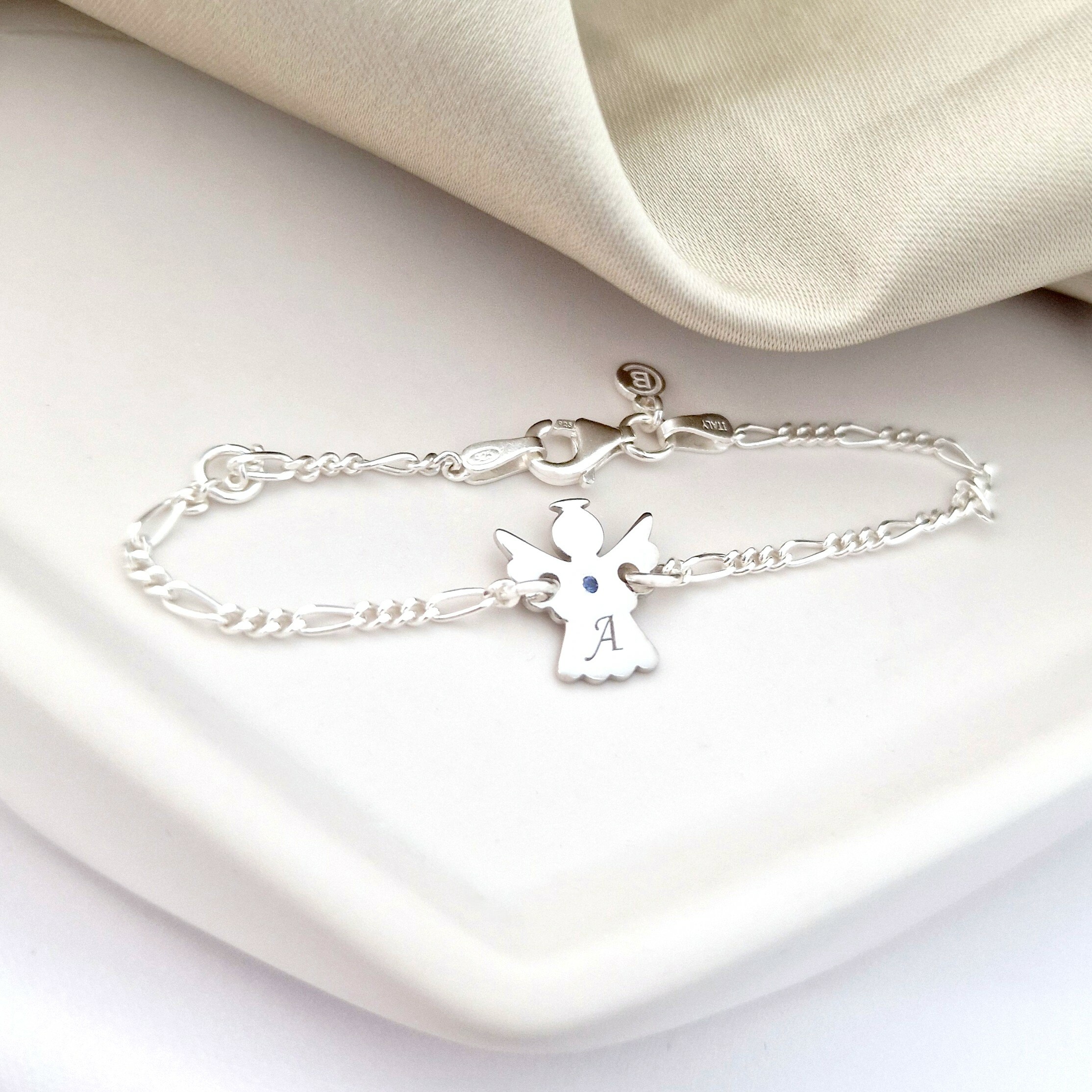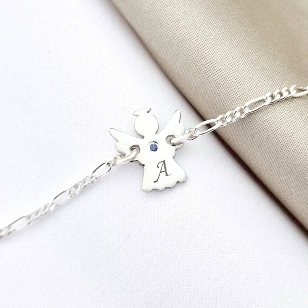 Bratara ingeras - personalizat cu initiala si Piatra pretioasa - Argint 925 Rodiat - Cu lantisor fata/baiat