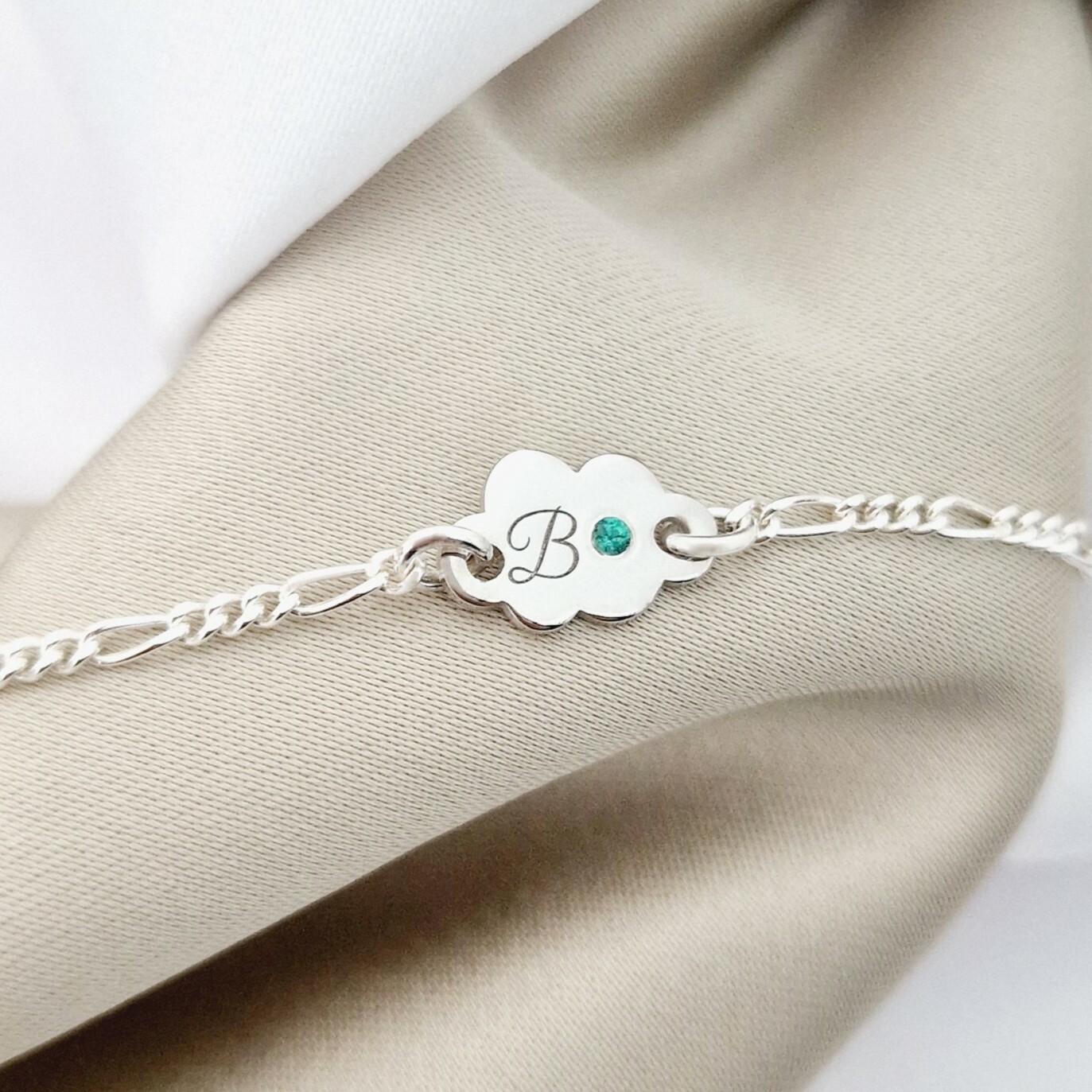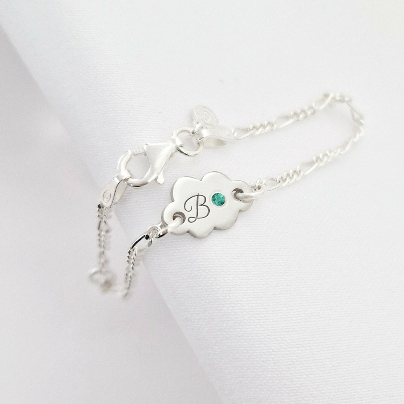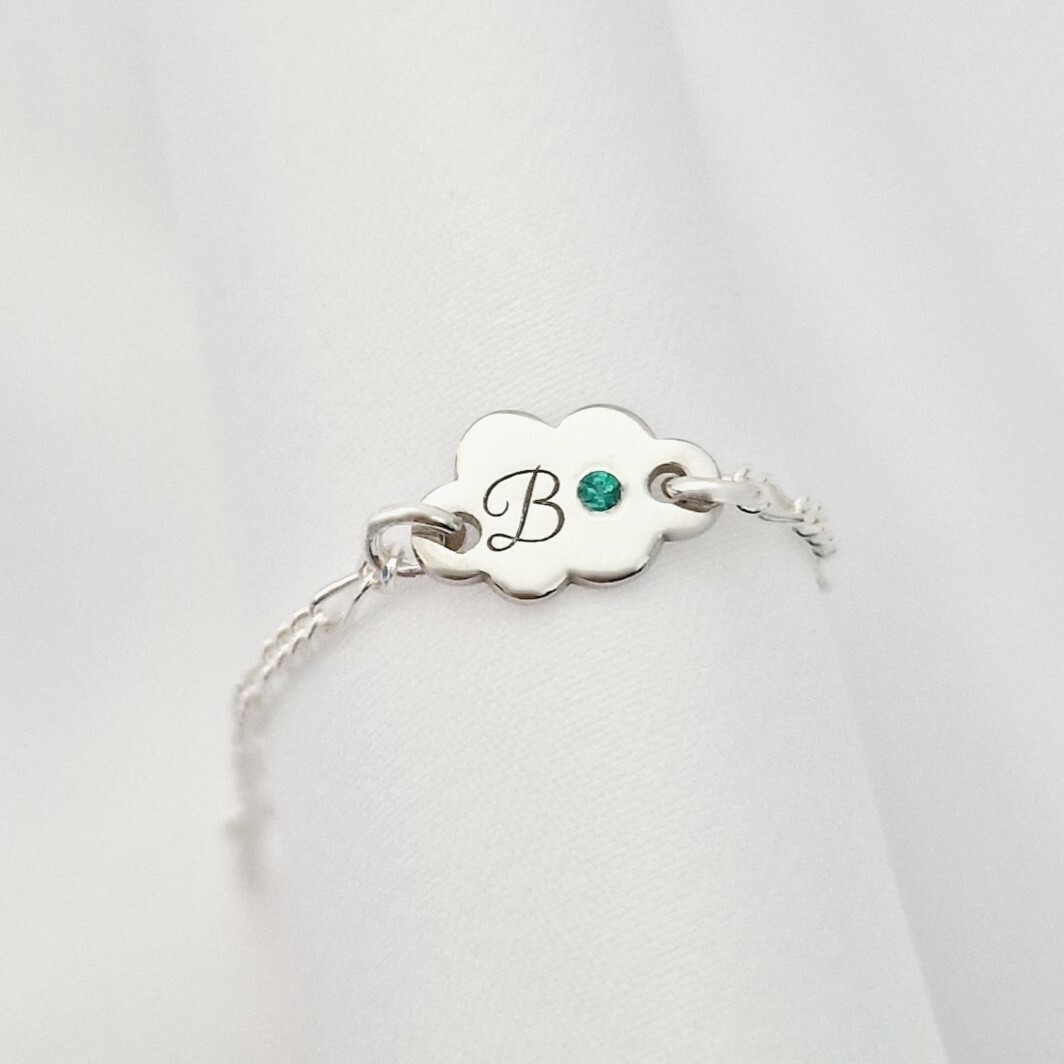 Această brățară delicată în formă de nor este realizată din Argint 925 Rodiat și personalizată cu inițiala ta preferată. Este înfrumusețată cu un Smarald natural, cunoscut ca simbol al iubirii, renașterii și înțelepciunii. Designul fin și lanțul reglabil o fac perfectă pentru orice vârstă și orice ocazie.