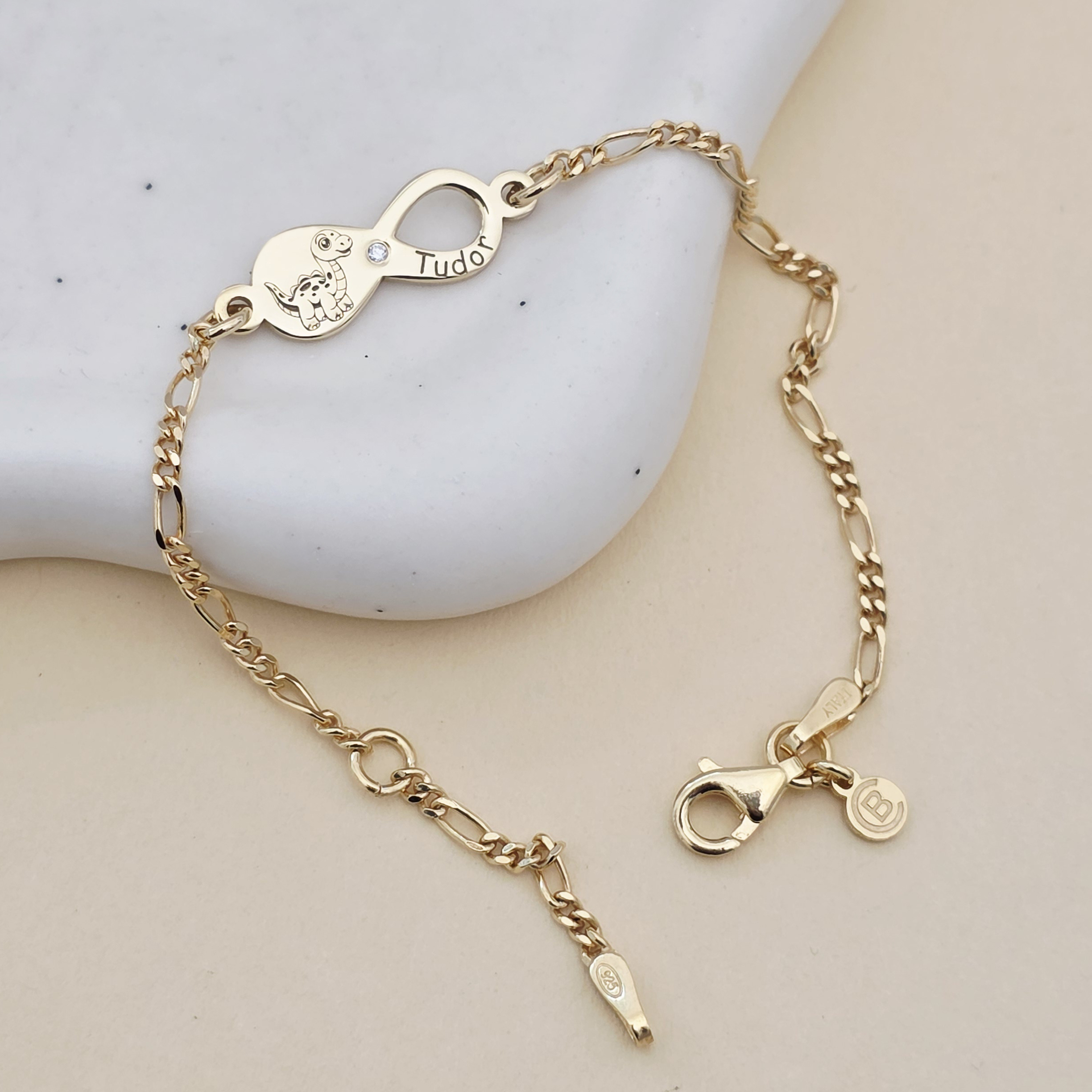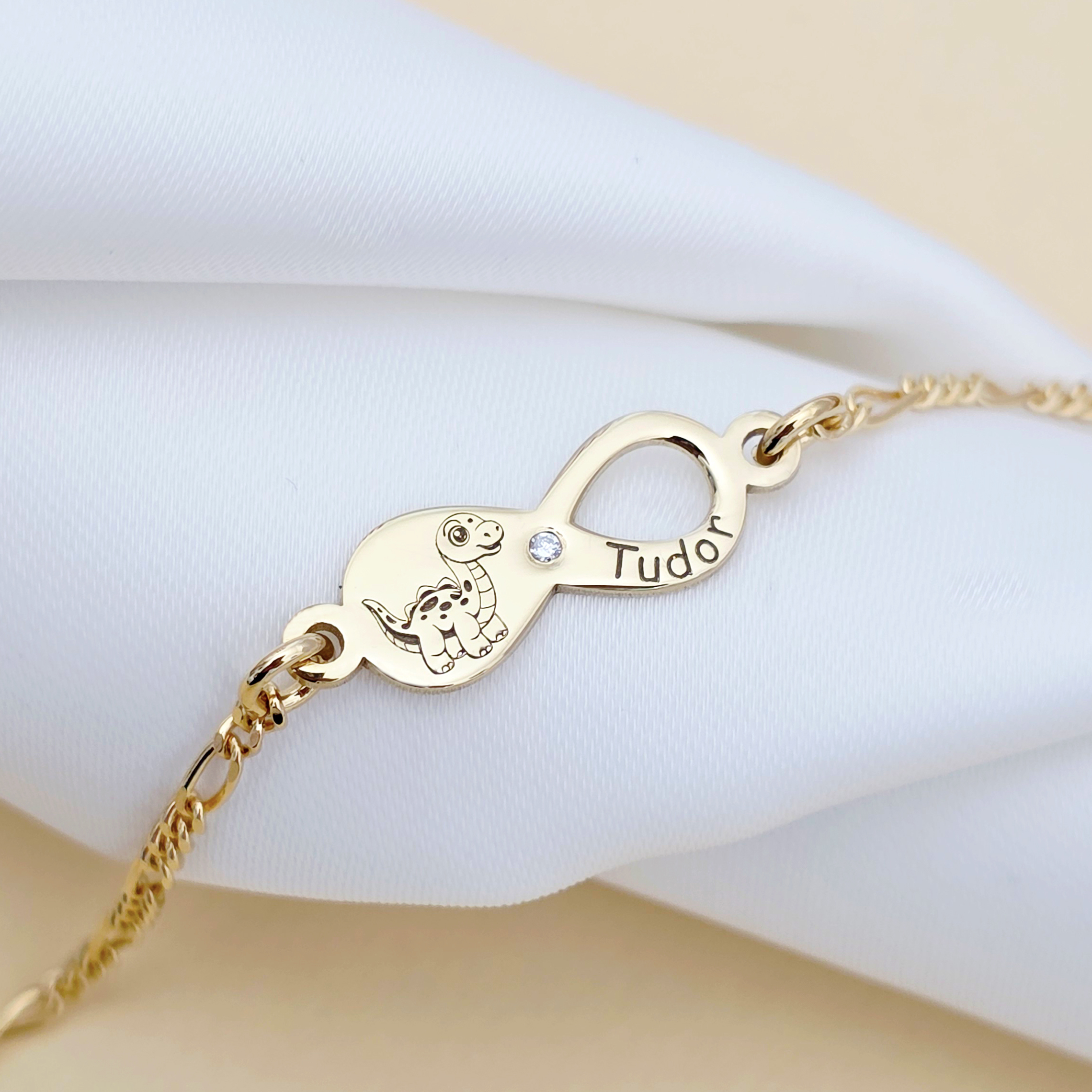 Brățară personalizata cu simbolul infinitului,dinozaur și nume – Diamant natural - Argint 925 placat cu Aur Galben 18K - Cu lantisor fata/baiat