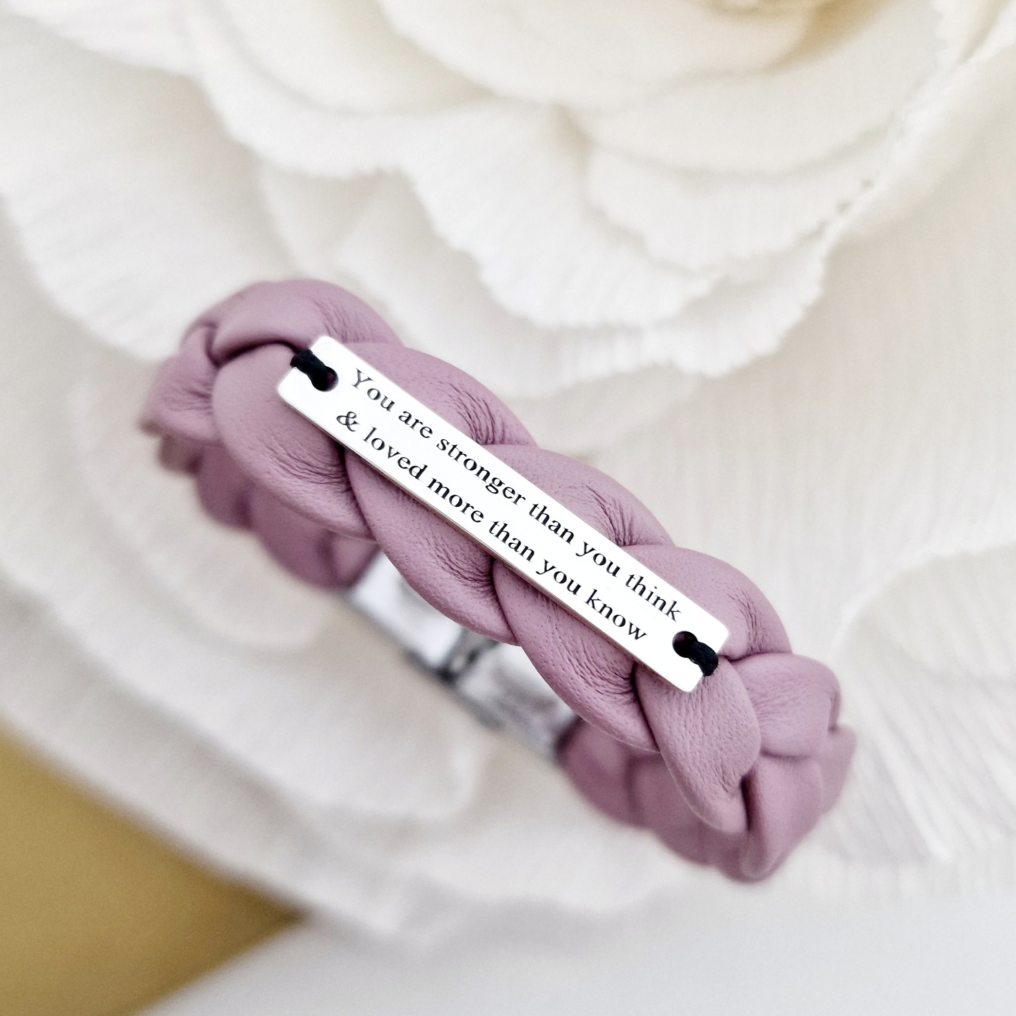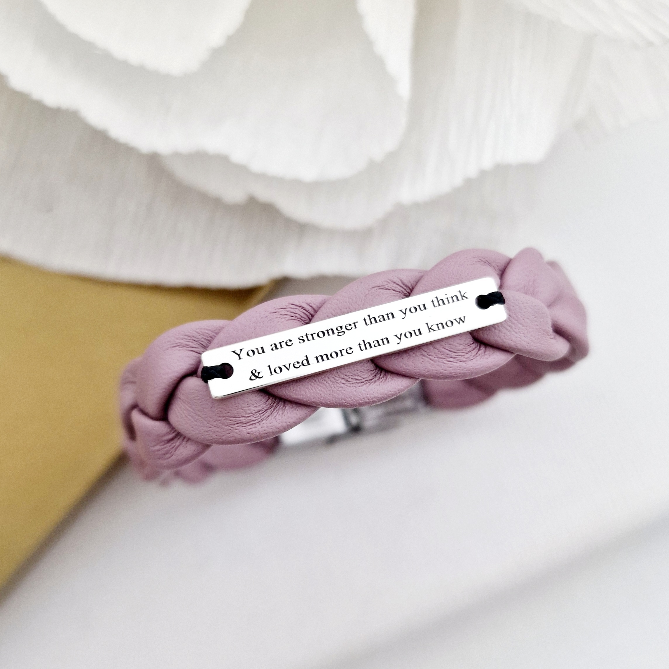 Bratara eleganta cu piele lata impletita - Placuta ingusta dreptunghiulara cu gravura personalizata - Argint 925 - Inchizatoare clips inox