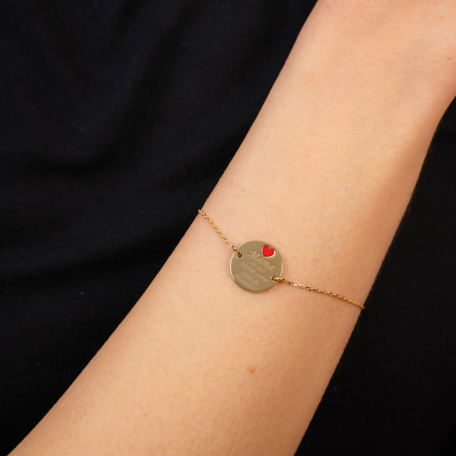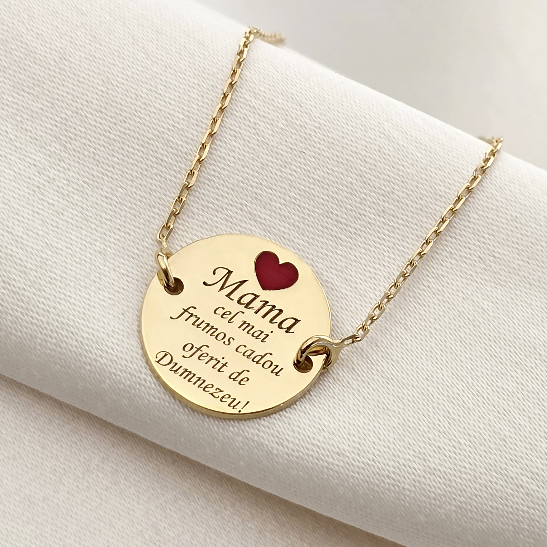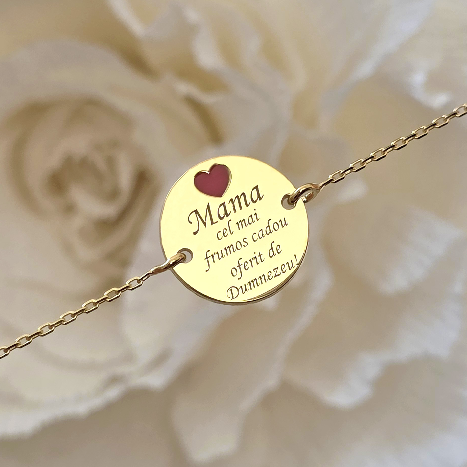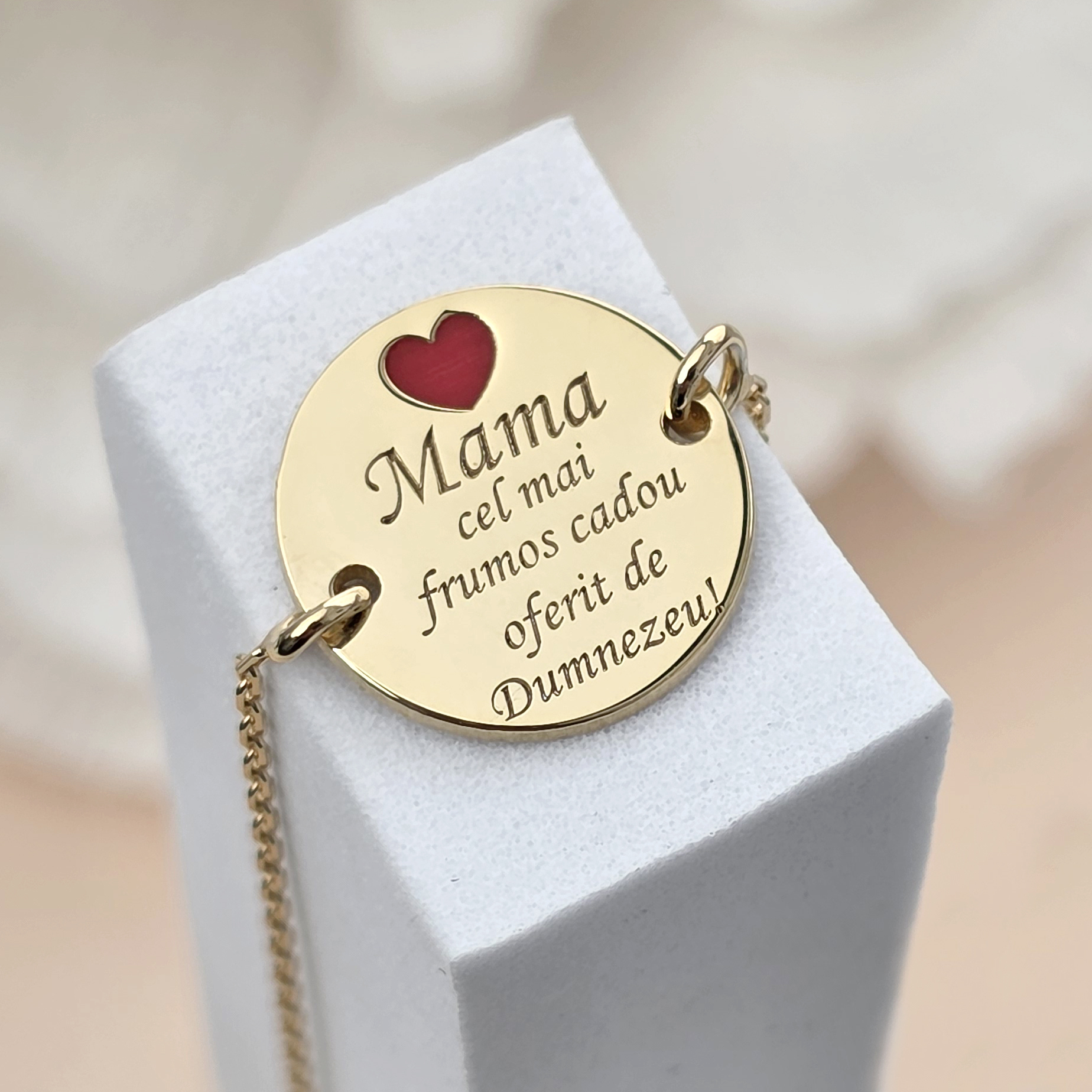 Bratara Mama, cadou de la Dumnezeu - Argint 925 placat cu Aur Galben 18K si inima cu email rosu - cu lantisor