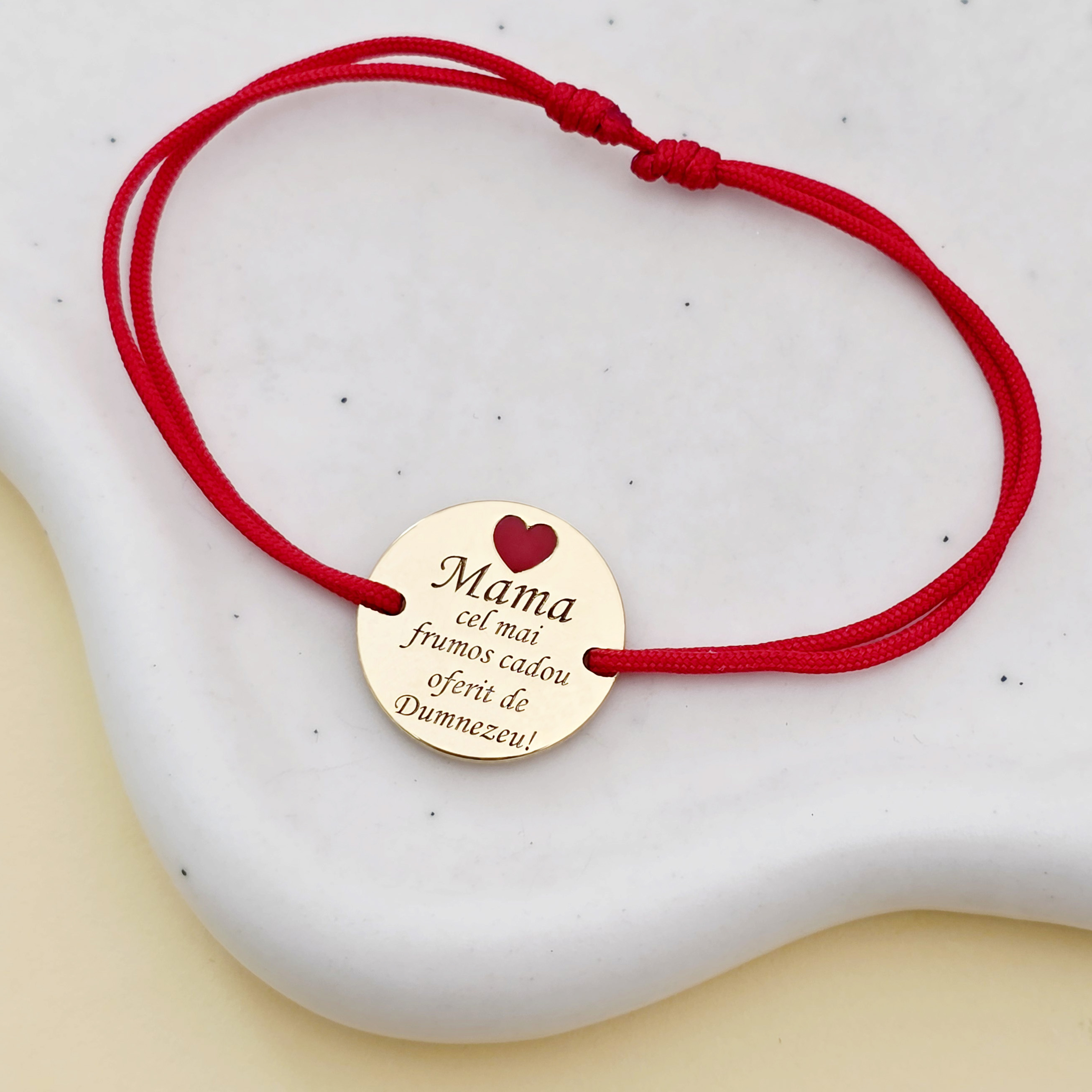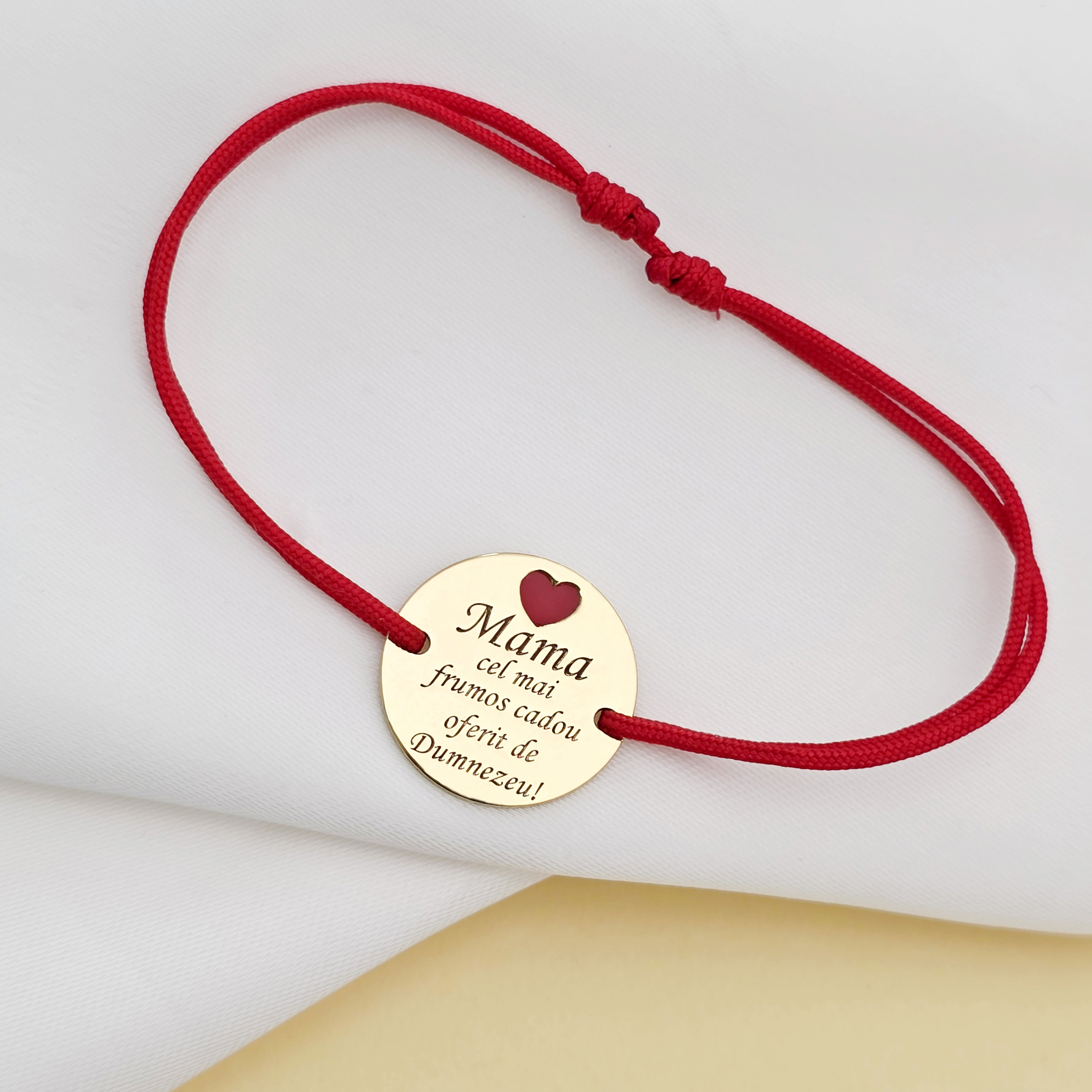 Bratara Mama, cadou de la Dumnezeu - Argint 925 placat cu Aur Galben 18K si inima cu email rosu - Snur reglabil, diverse culori
