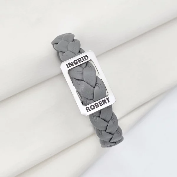 Bratara personalizata cu Charm placuta si nume gravate - Piele impletita gri - Argint 925 - Inchizatoare clips din otel inoxidabil