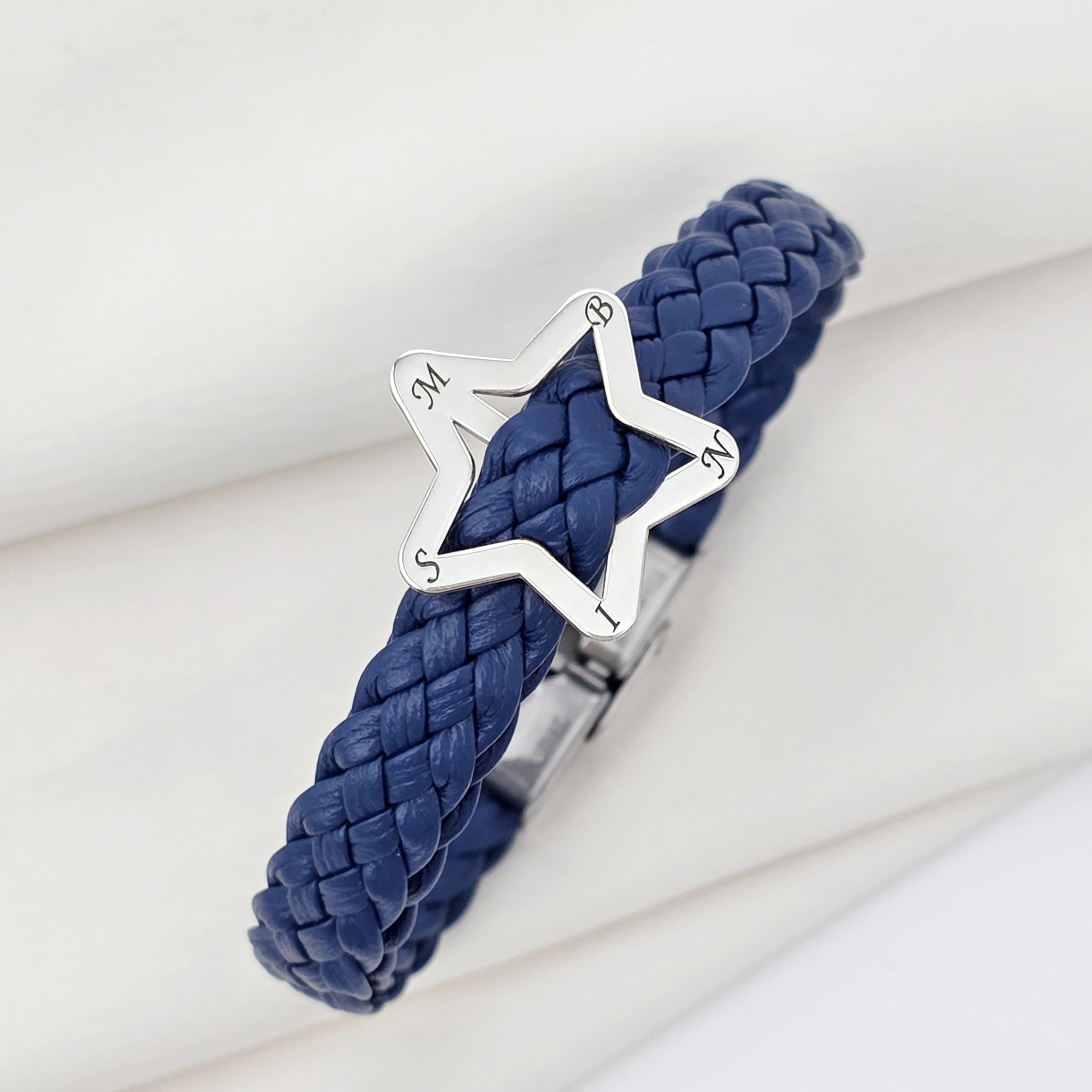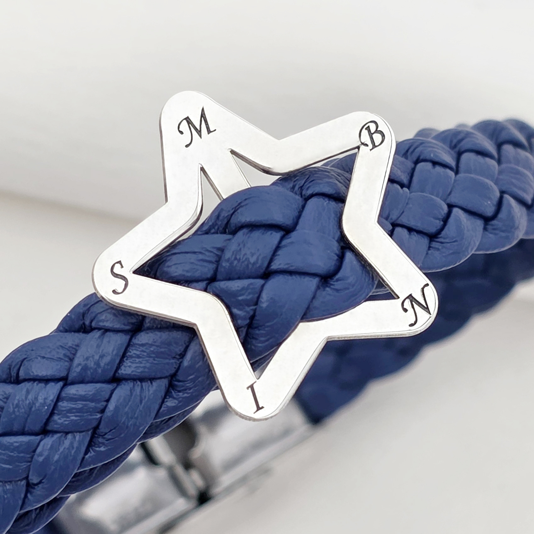 Bratara personalizata cu Charm stea si initiale gravate - Piele impletita albastra - Argint 925 - Inchizatoare clips din otel inoxidabil