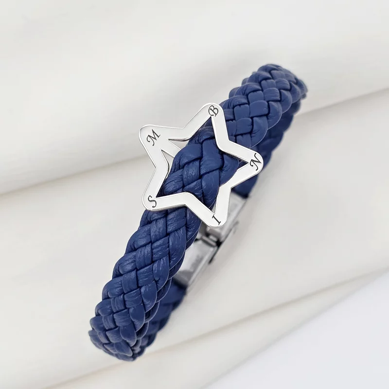 Această brățară personalizată este realizată din piele împletită albastră, oferind un contrast rafinat cu charm-ul stea din Argint 925. Inițialele gravate adaugă o notă personală, transformând accesoriul într-un simbol unic. Închiderea cu clips din oțel inoxidabil asigură durabilitate și siguranță la purtare.