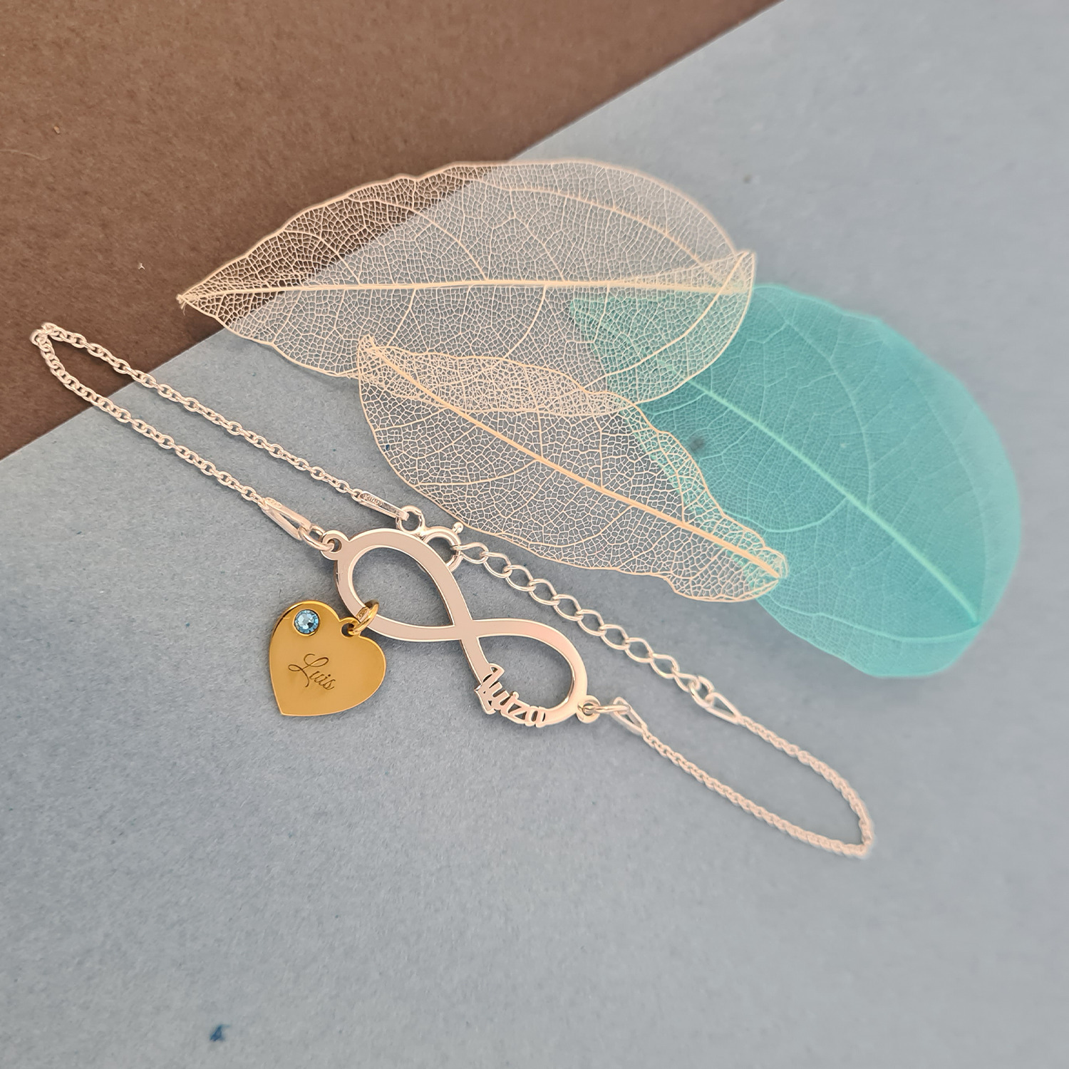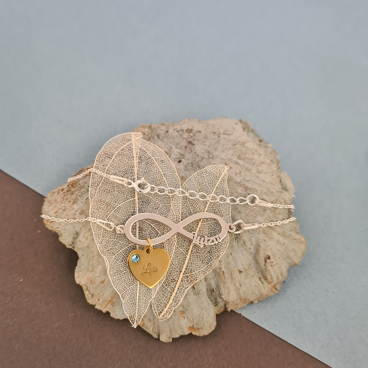 Bratara personalizata cu lantisor si pandantiv infinit cu 1 nume din Argint 925 - Charm inimioara gravata din Argint 925 placat cu Aur Galben 18K