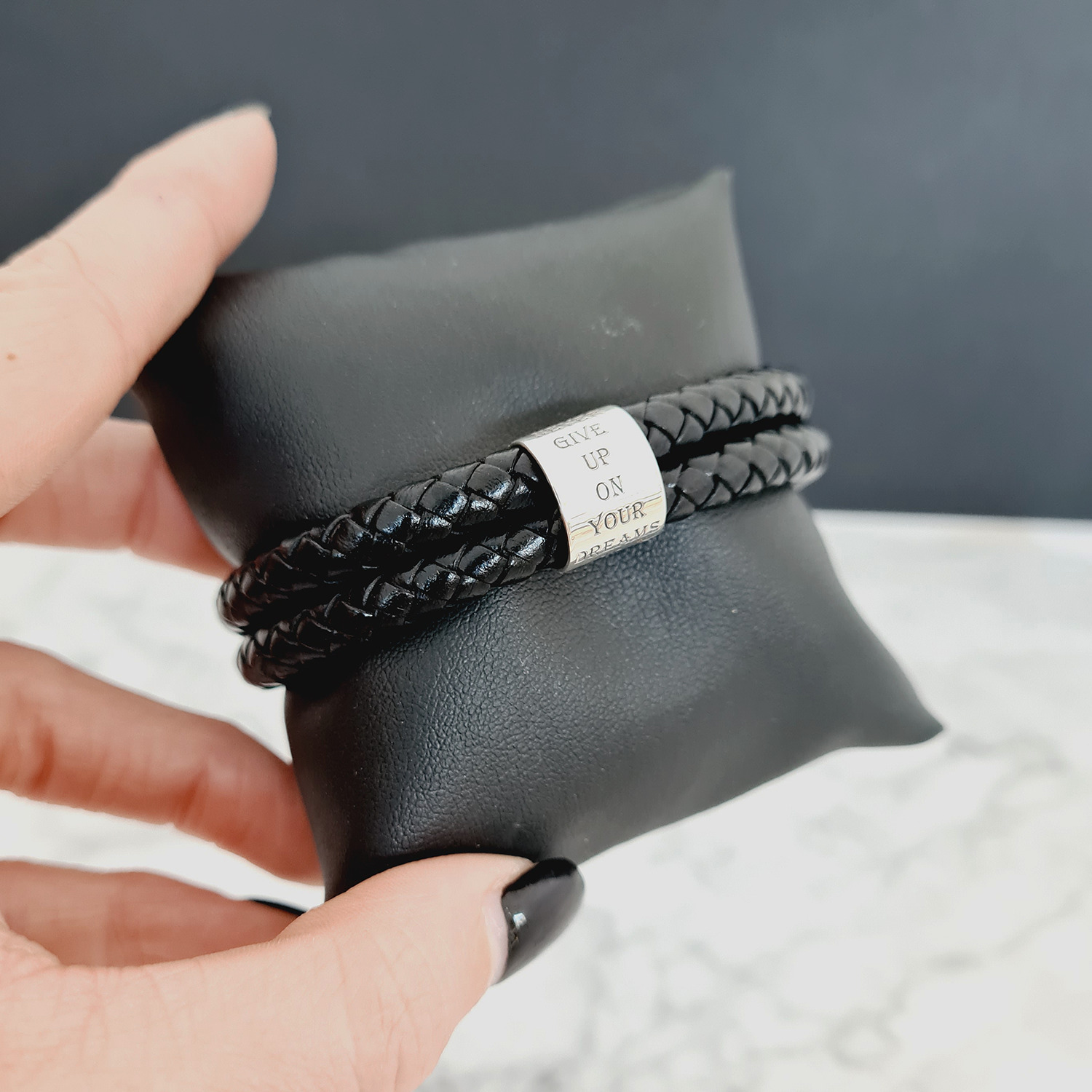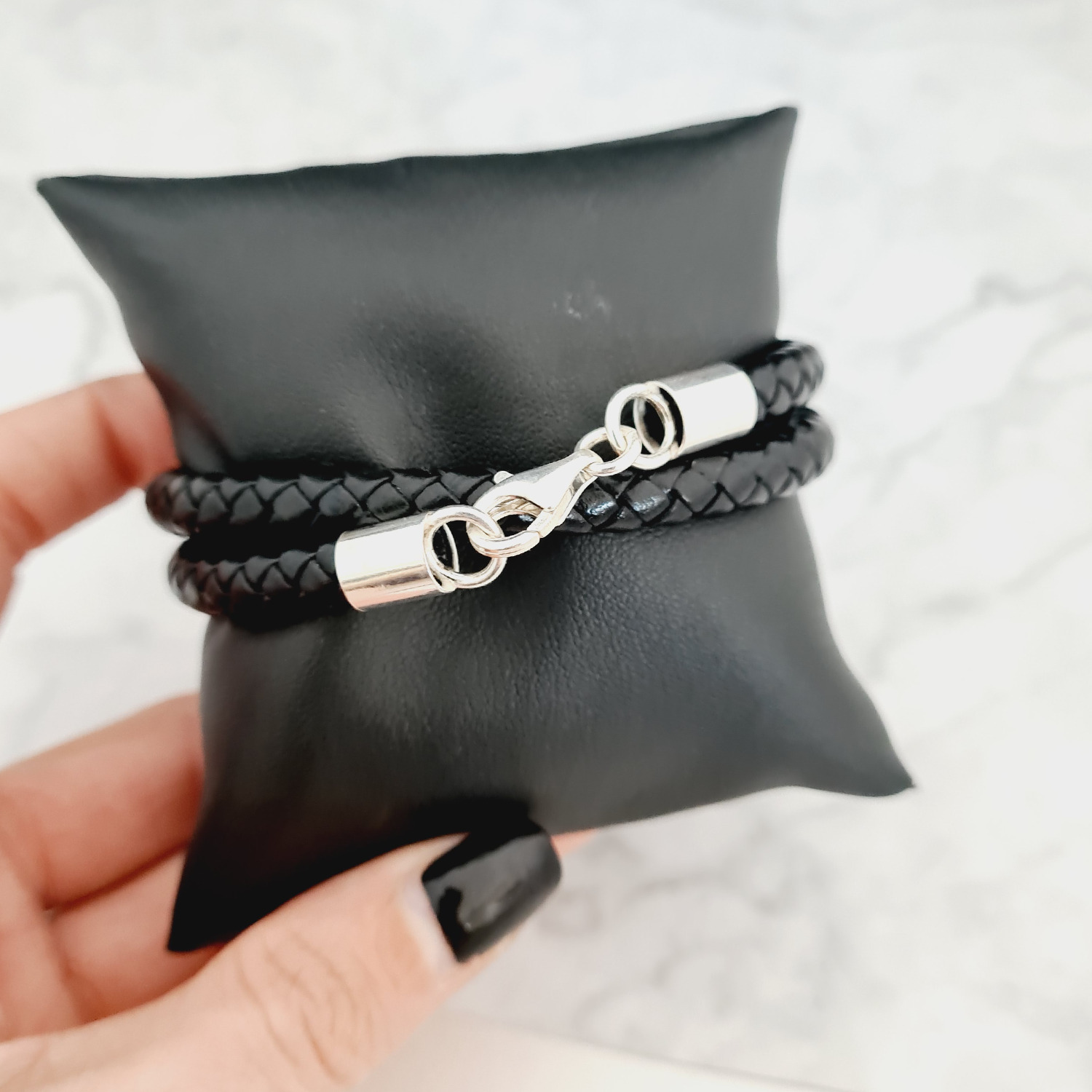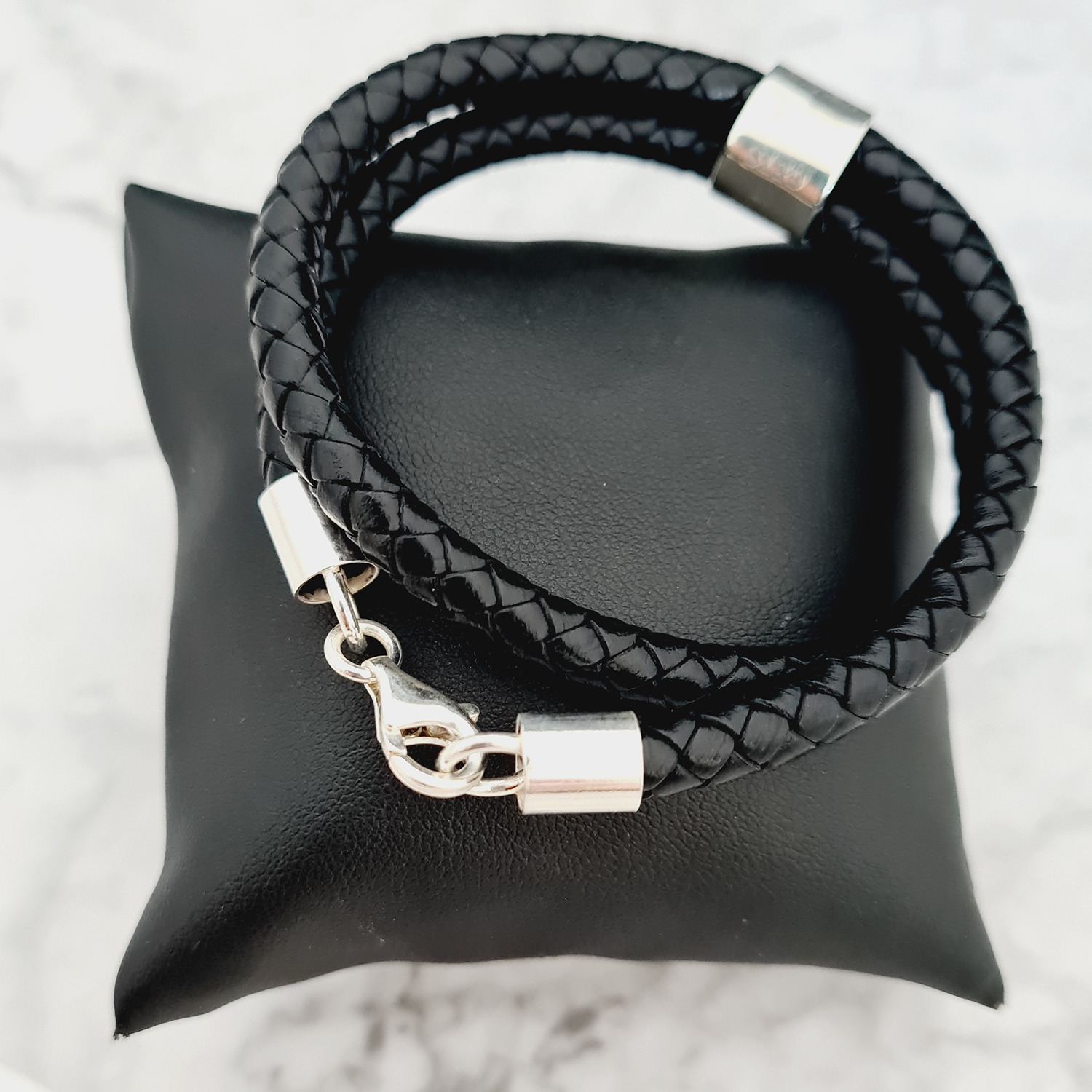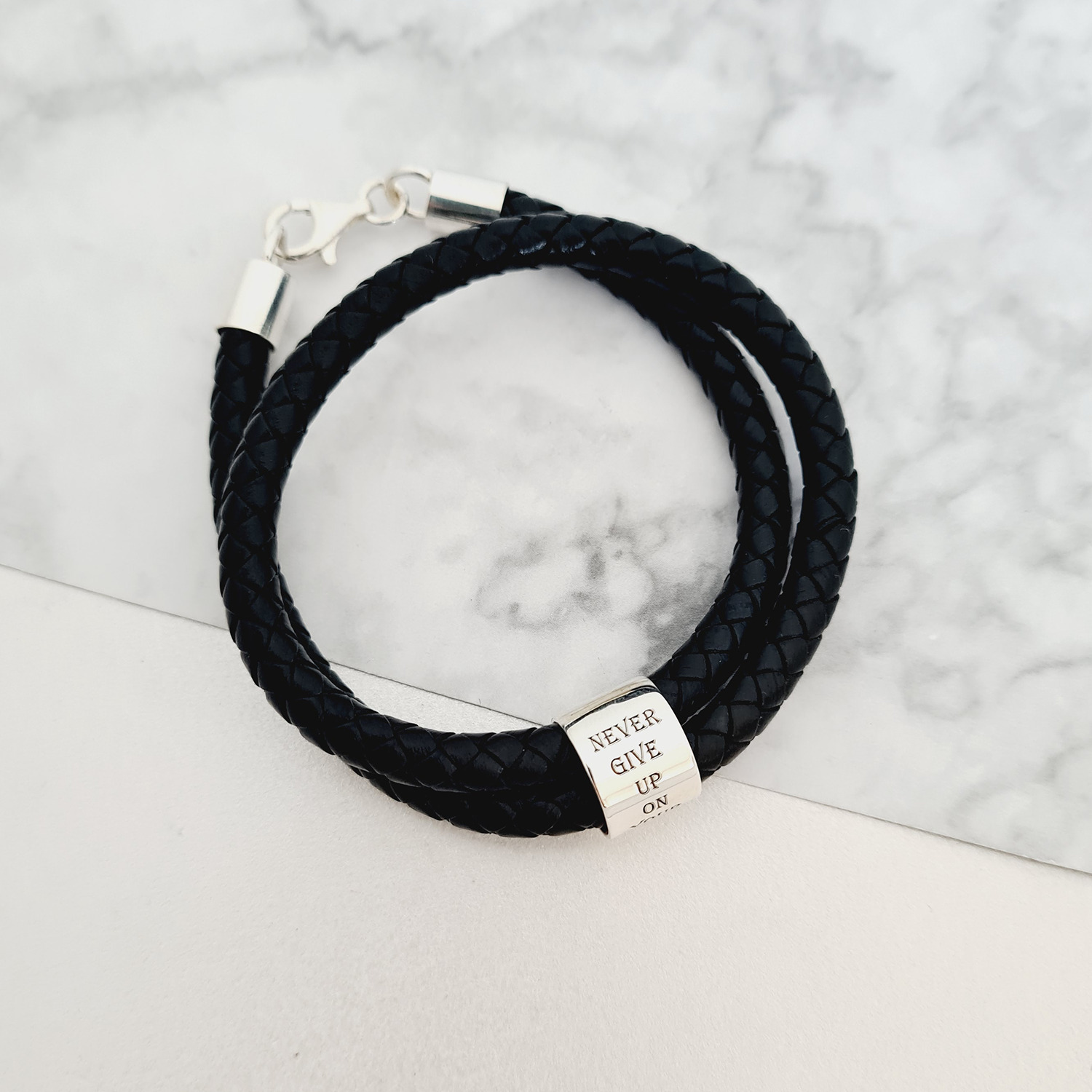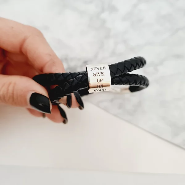 Bratara barbateasca - Cilindru cu mesaj personal - Argint 925 - 2 straturi piele impletita groasa - Inchizatoare carabina