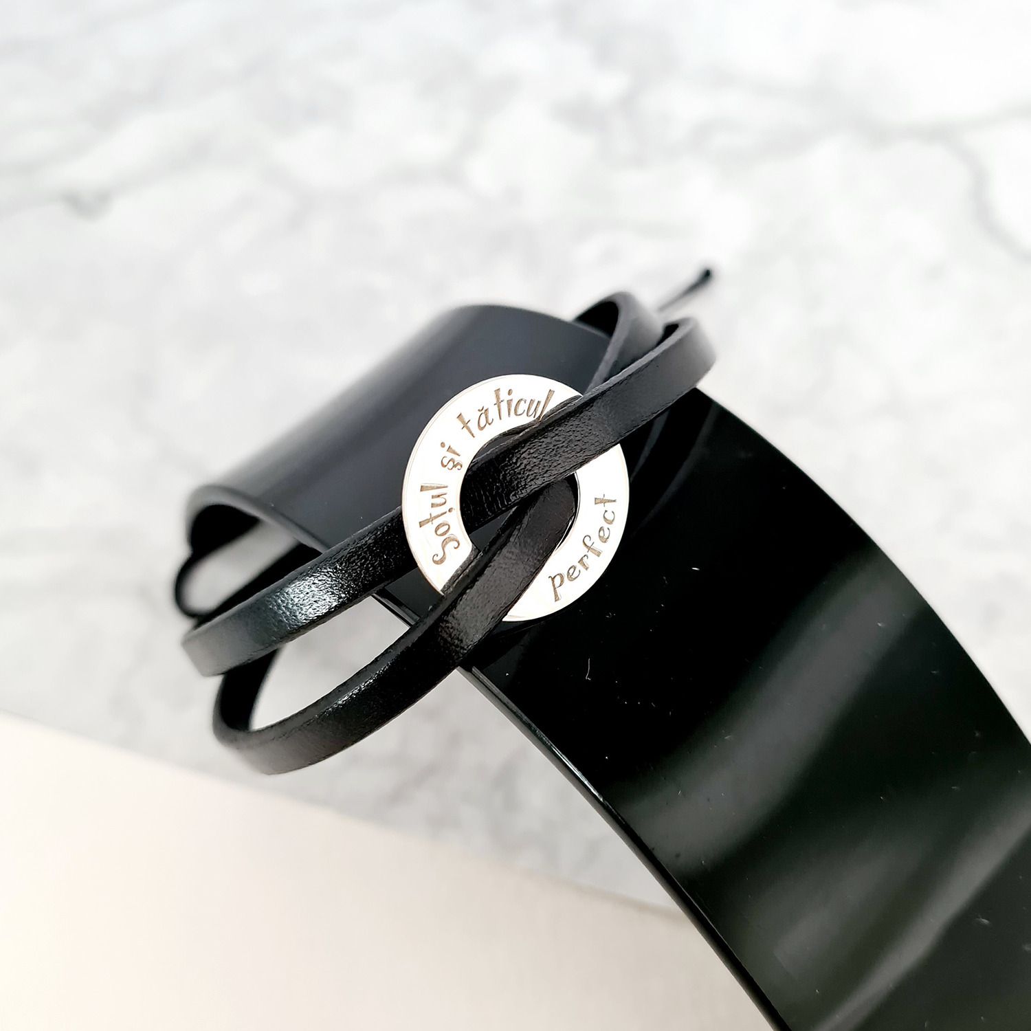 Bratara barbati - Model disc personalizat din Argint 925 impletit cu 2 straturi de piele neagra - Inchizatoare snur reglabil