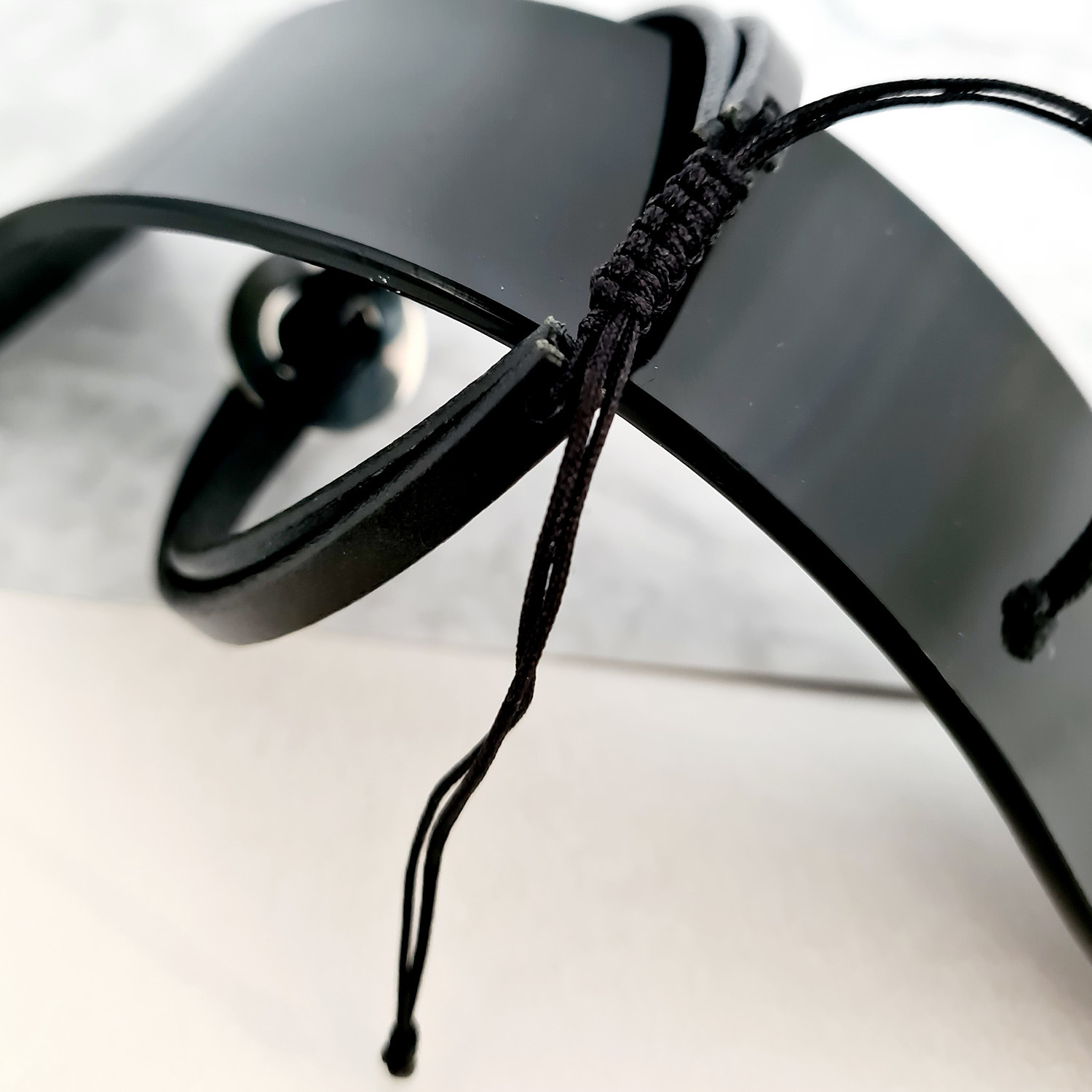 - Bratara este reglabila prin intermediul unui snur din matase vegetala prins la capetele bandei de piele.