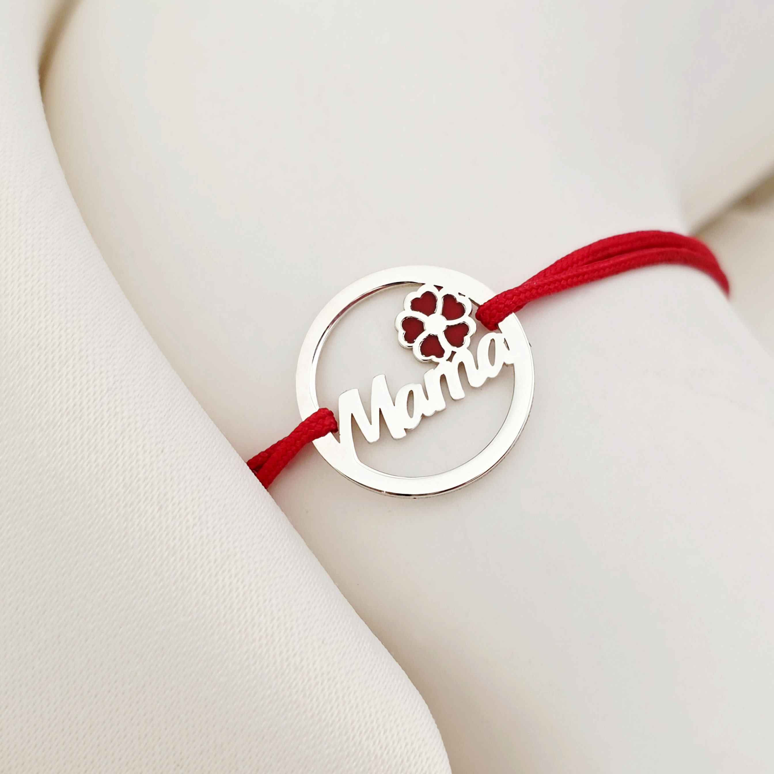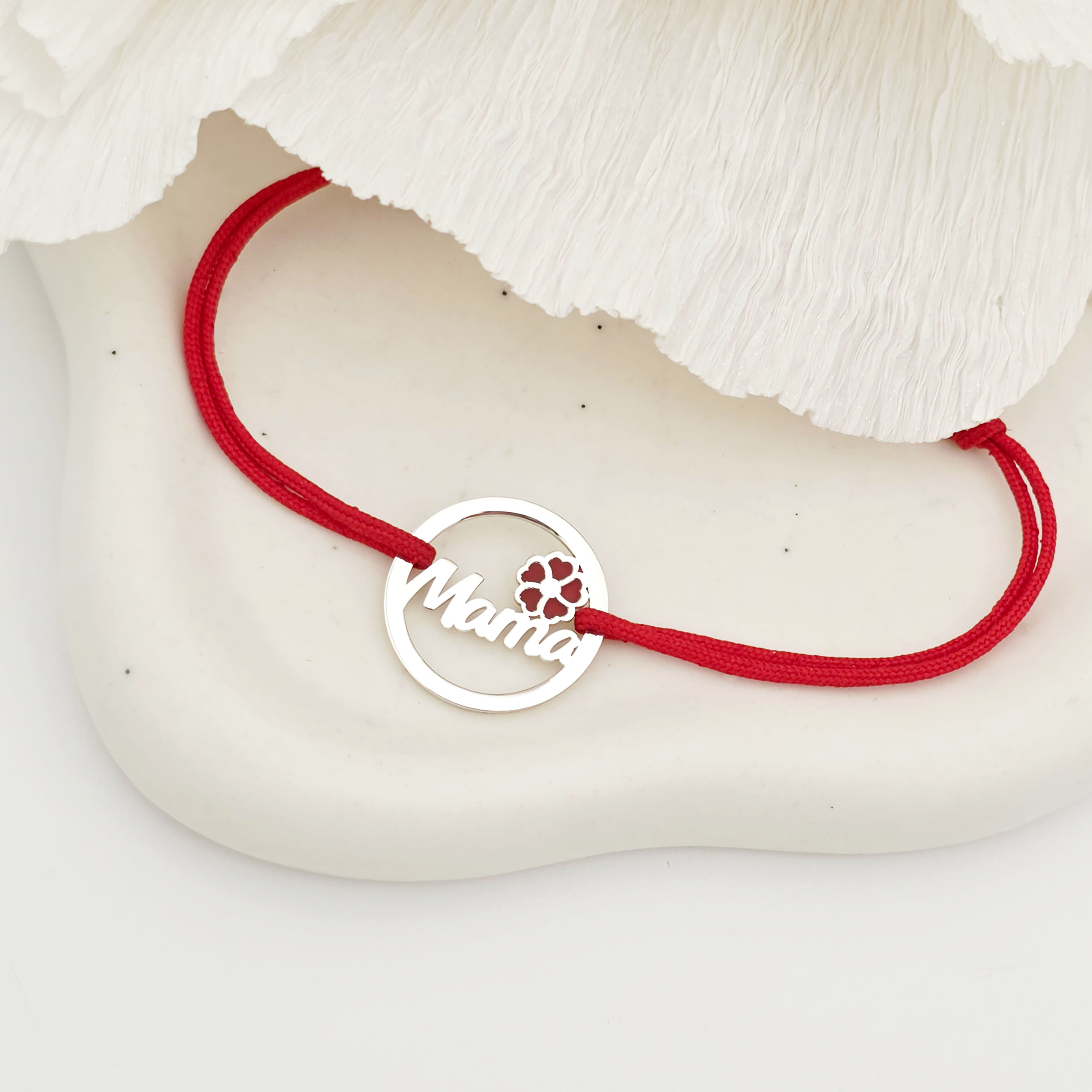 Bratara disc si nume decupat - Mama si floare cu email rosu - Argint 925 - Snur reglabil, diverse culori