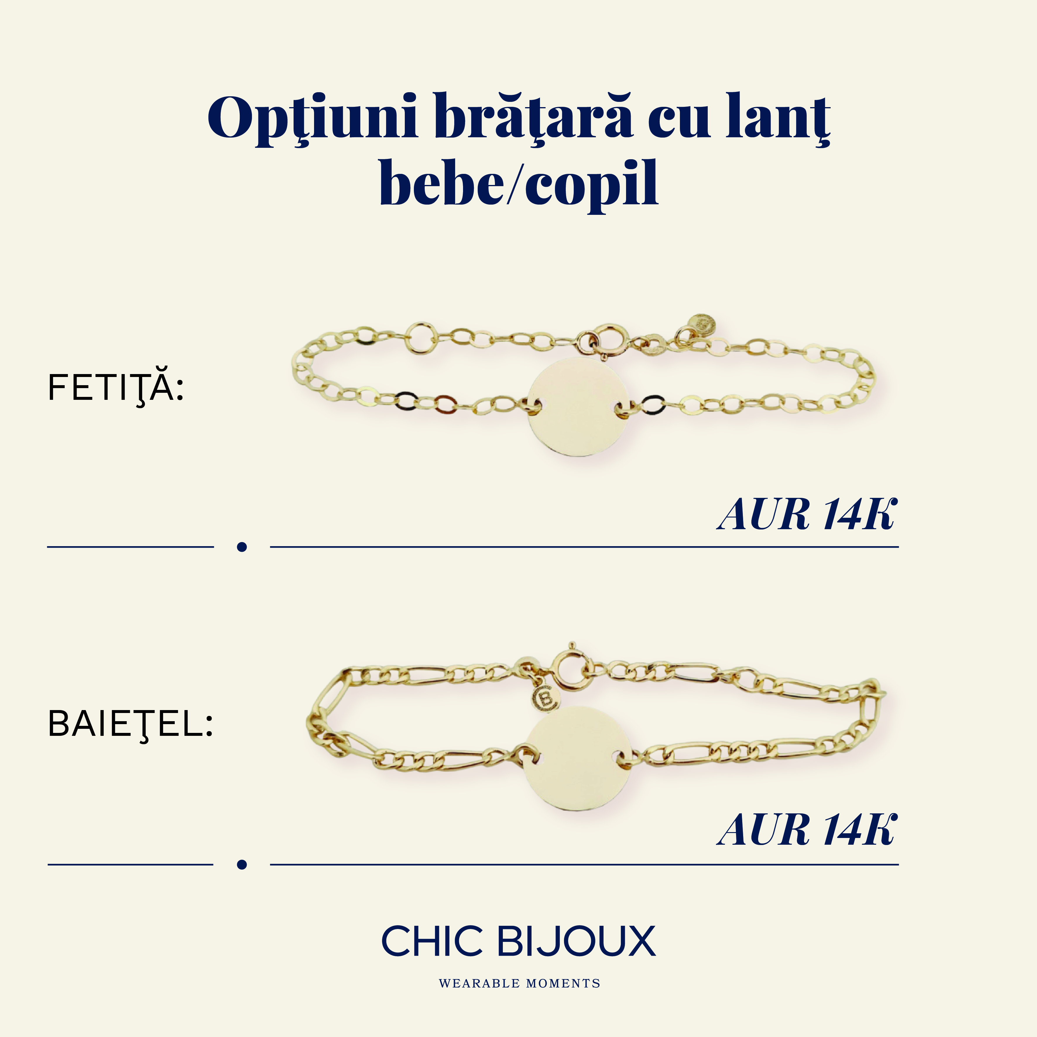 Pentru bebelusi, recomandam bratarile cu ingeras, cruciulita sau placuta fina din aur, gravabilea cu nume sau data nasterii. Aceste modele au un design delicat, sunt usoare si vin cu snur moale sau lant subtire, special concepute pentru pielea sensibila a celor mici.