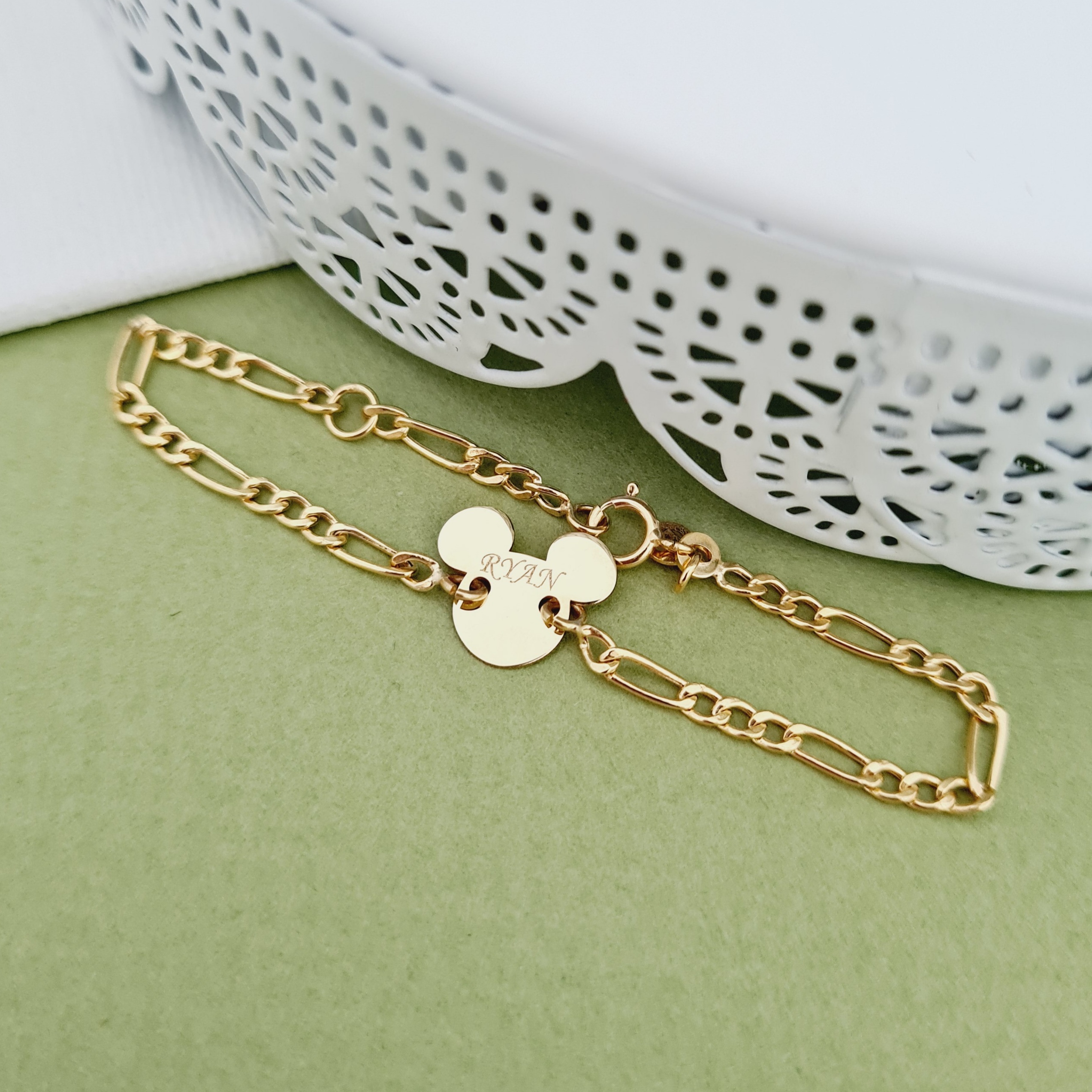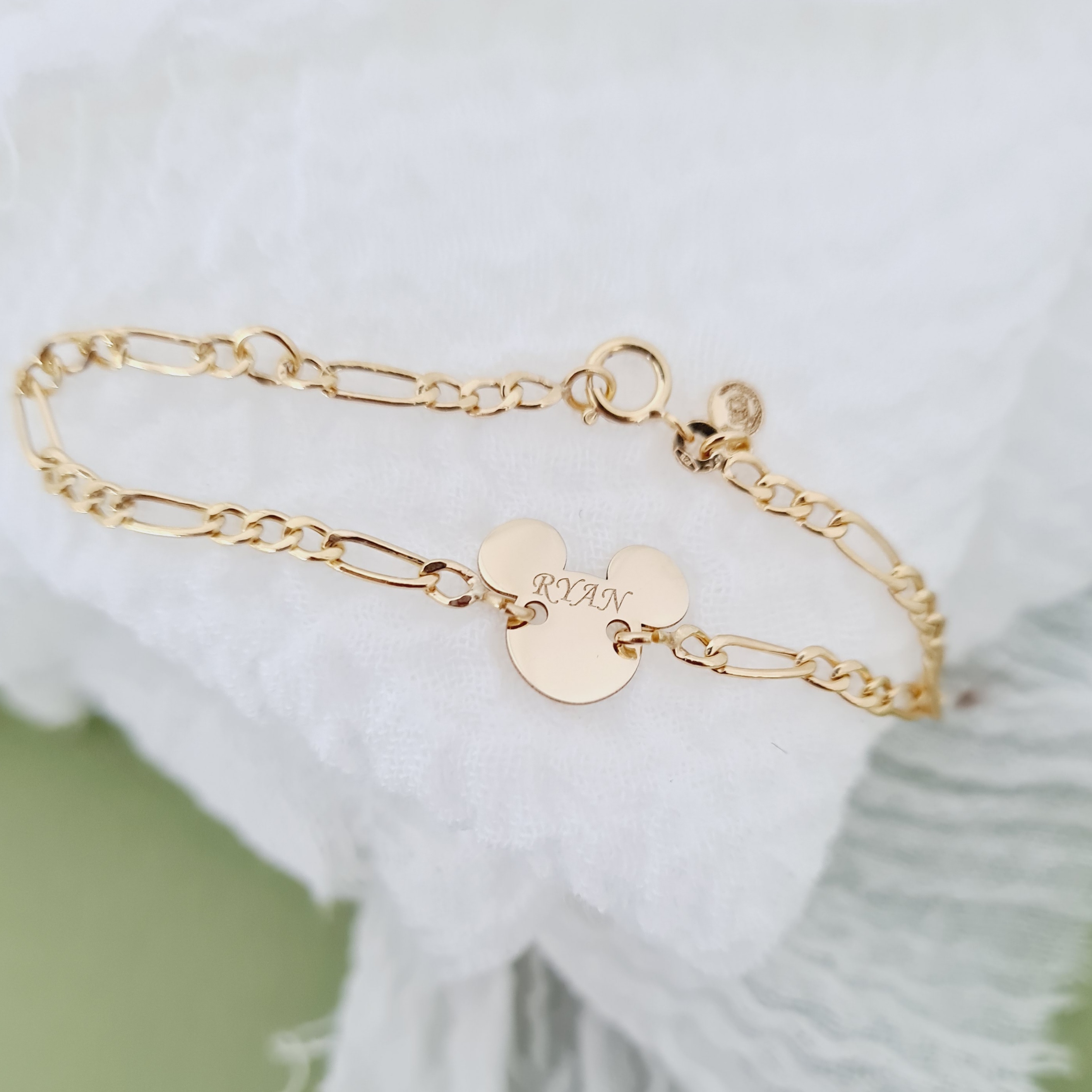 Bratara personalizata cu nume - Forma Soricel - Aur Galben 14K - Cu lantisor fata/baiat