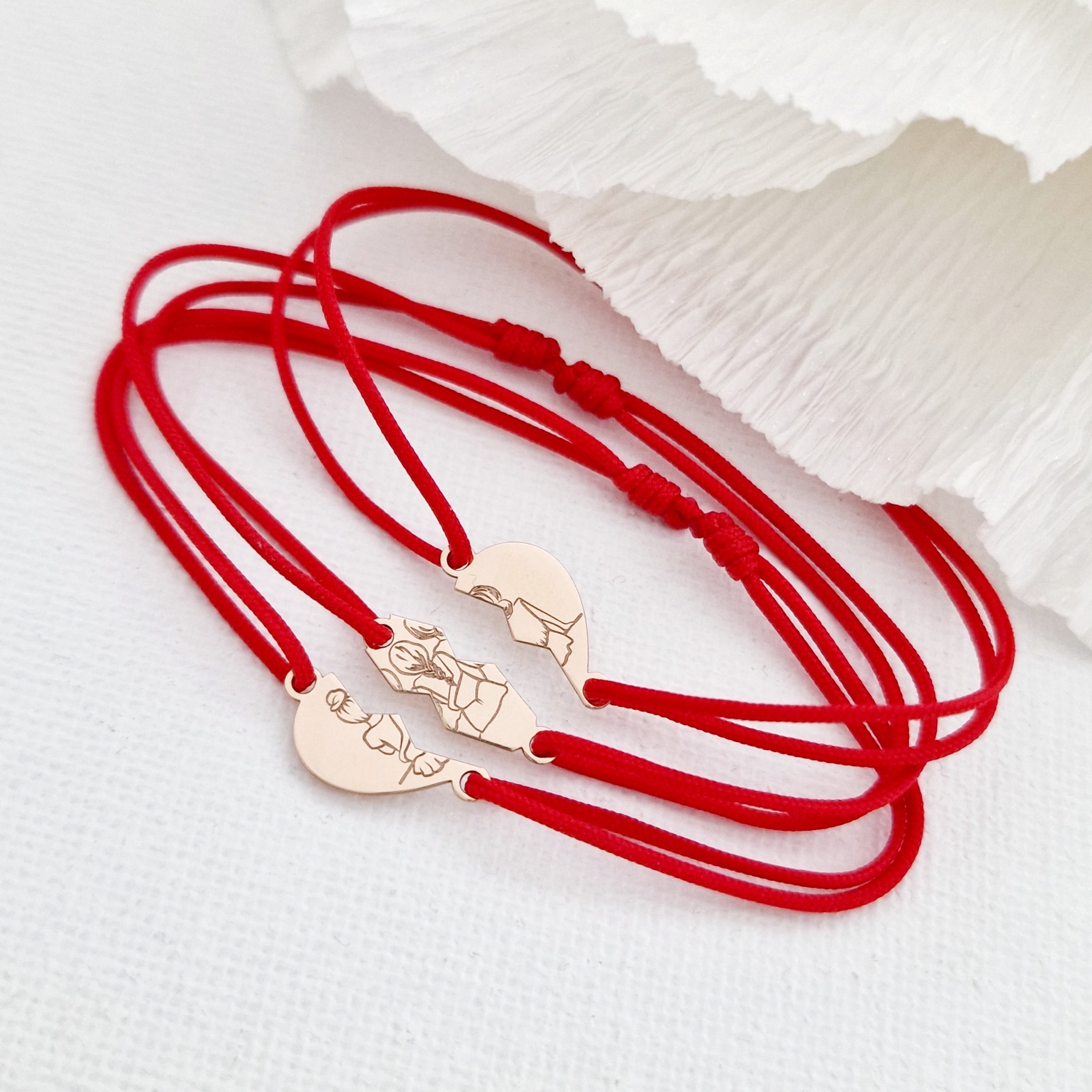 Bratarile din set sunt create integral din Aur Roz de 14K prin taiere si gravare laser de ultima generatie. Ele sunt finisate manual pentru o stralucire superioara. Fiecare bratara reprezinta o bucata de puzzle dinntr-o inima. Pandantivele sunt atasate de un snur din matase vegetala, marime reglabila.
