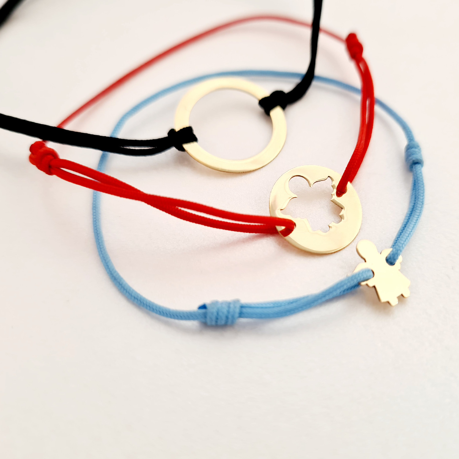 Set 3 bratari - Tata, mama si copil - Puzzle Familie - disc, banut si ingeras cu picioruse - Aur Galben 14k