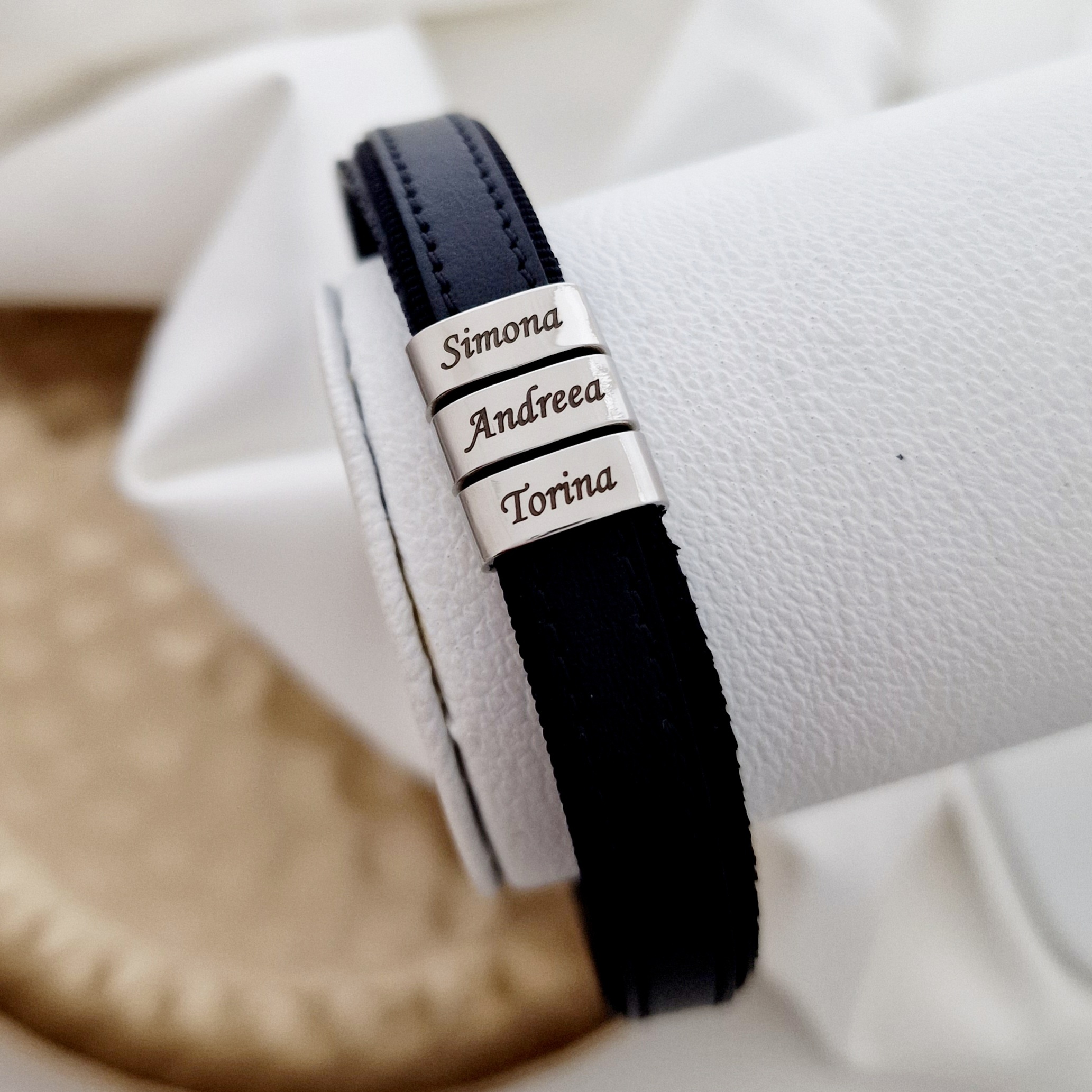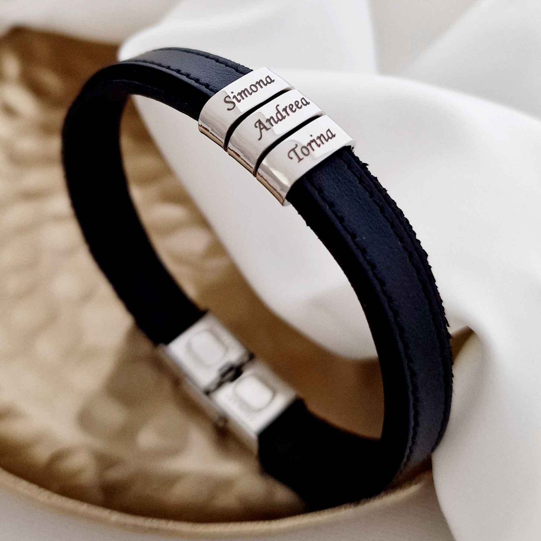 Bratara barbateasca Classic Elegance - 3 Elemente inox argintiu - Piele neagra cu inchizatoare clips din inox