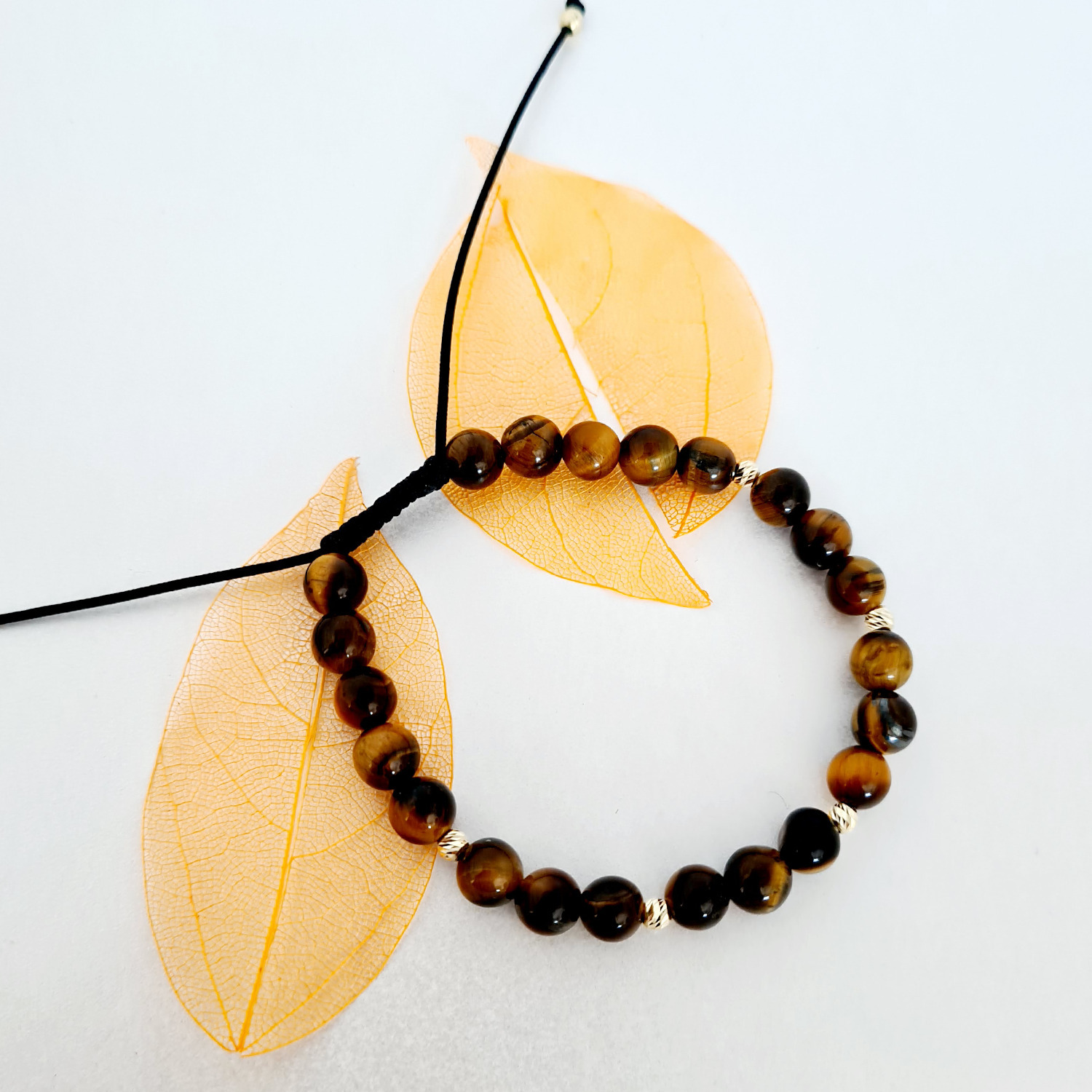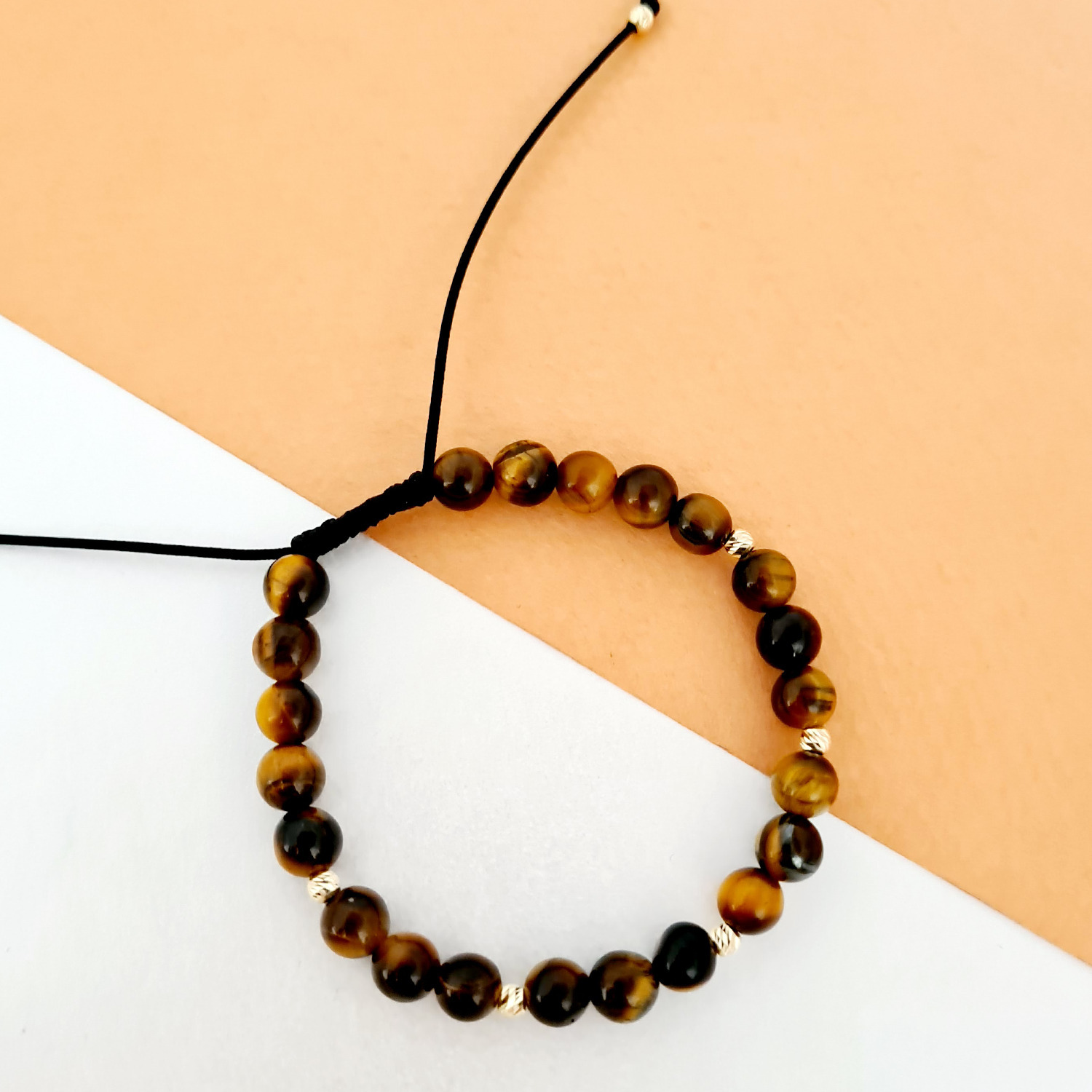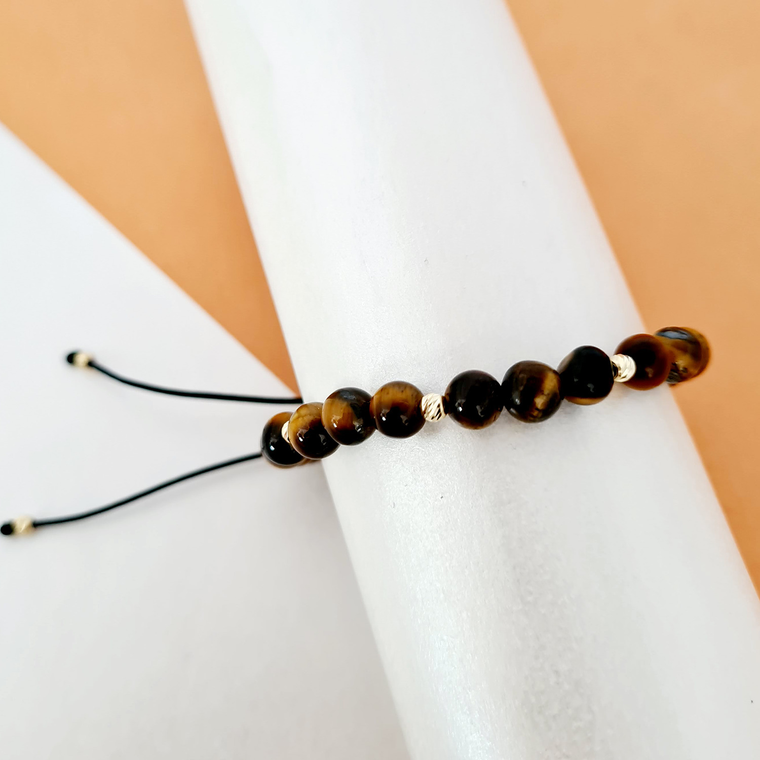 Alege sa porti o bratara ce emana putere, conexiune si incredere in sine. Bratara este realizata din pietre Ochi de Tigru alaturi de o nota eleganta date de bilute din Aur Galben de 14K.