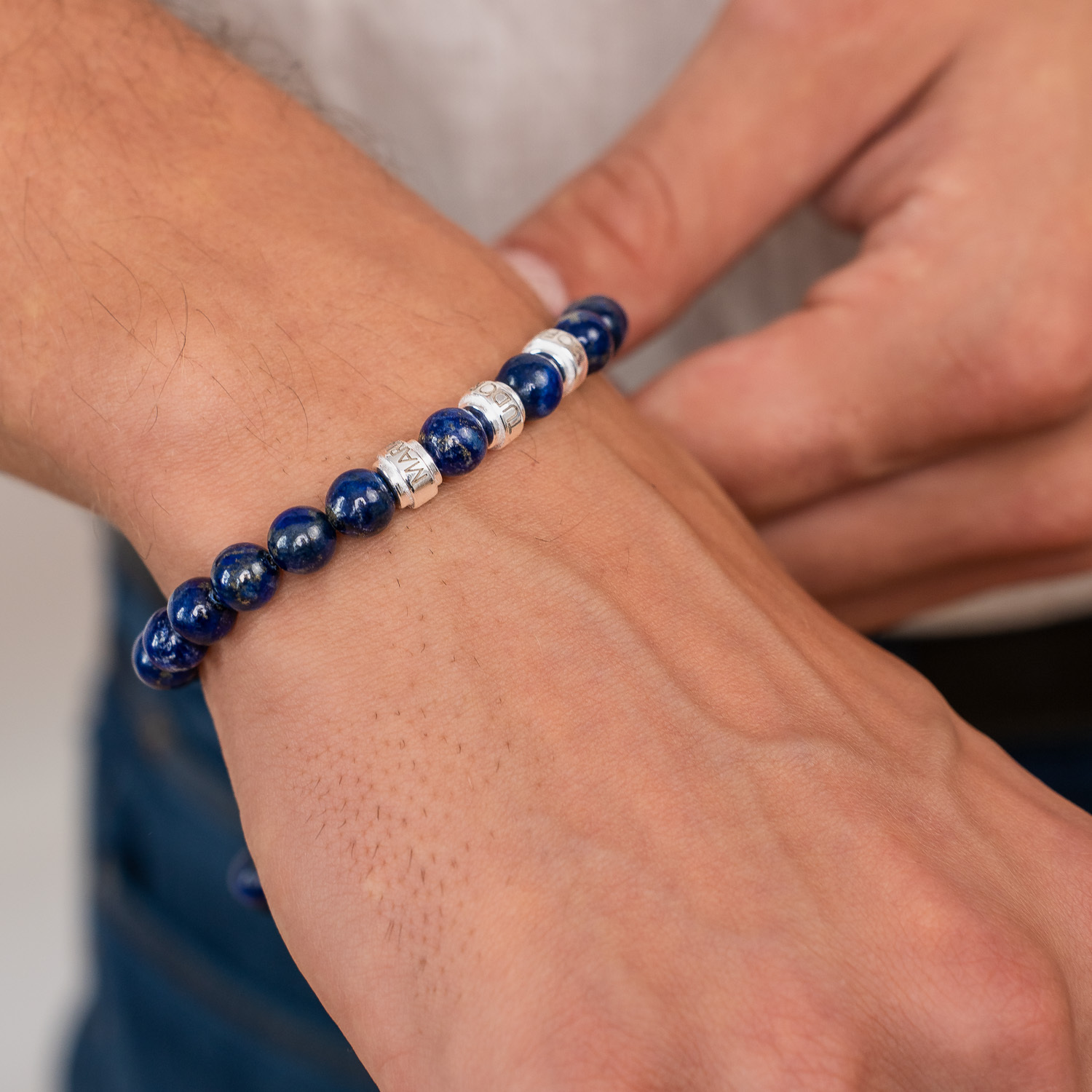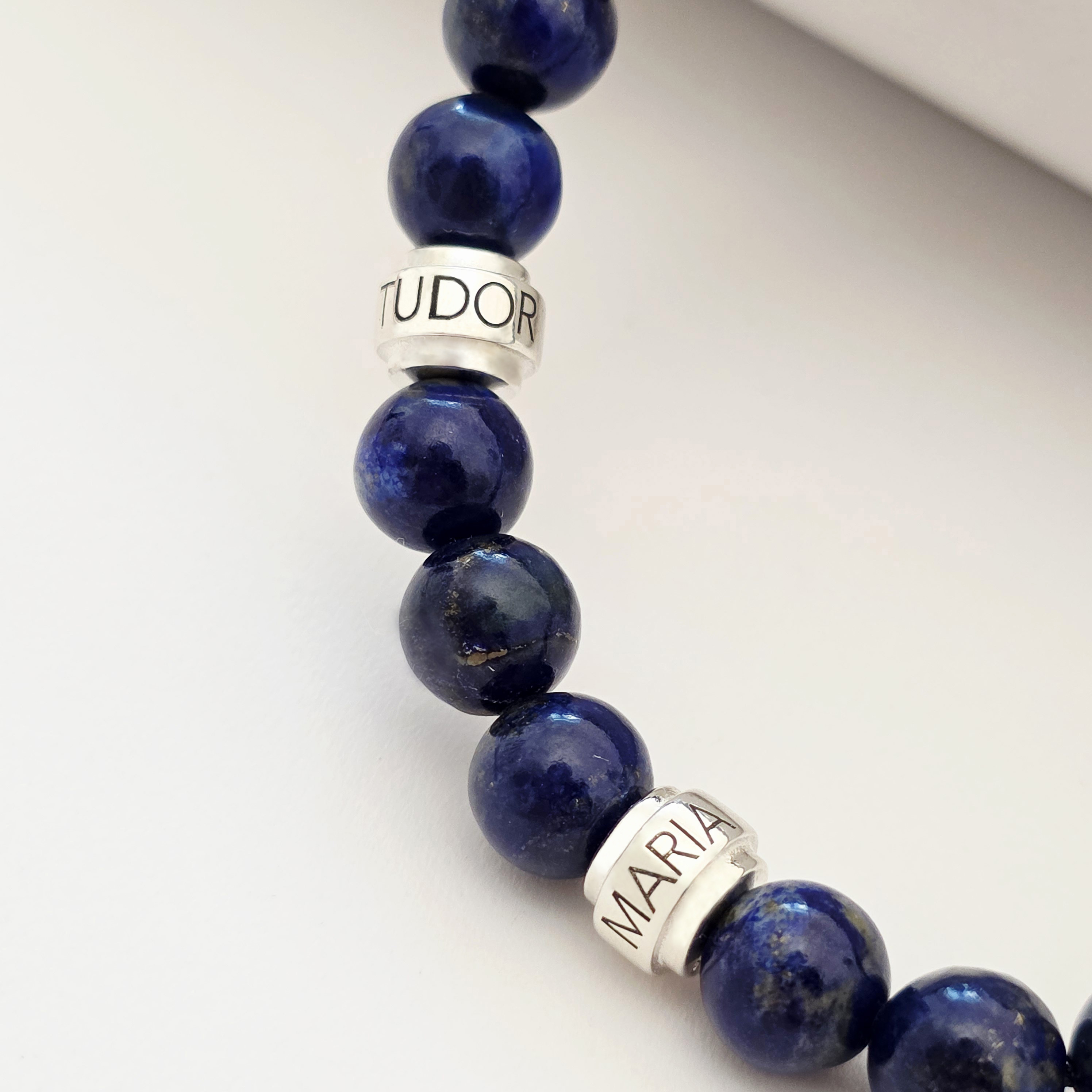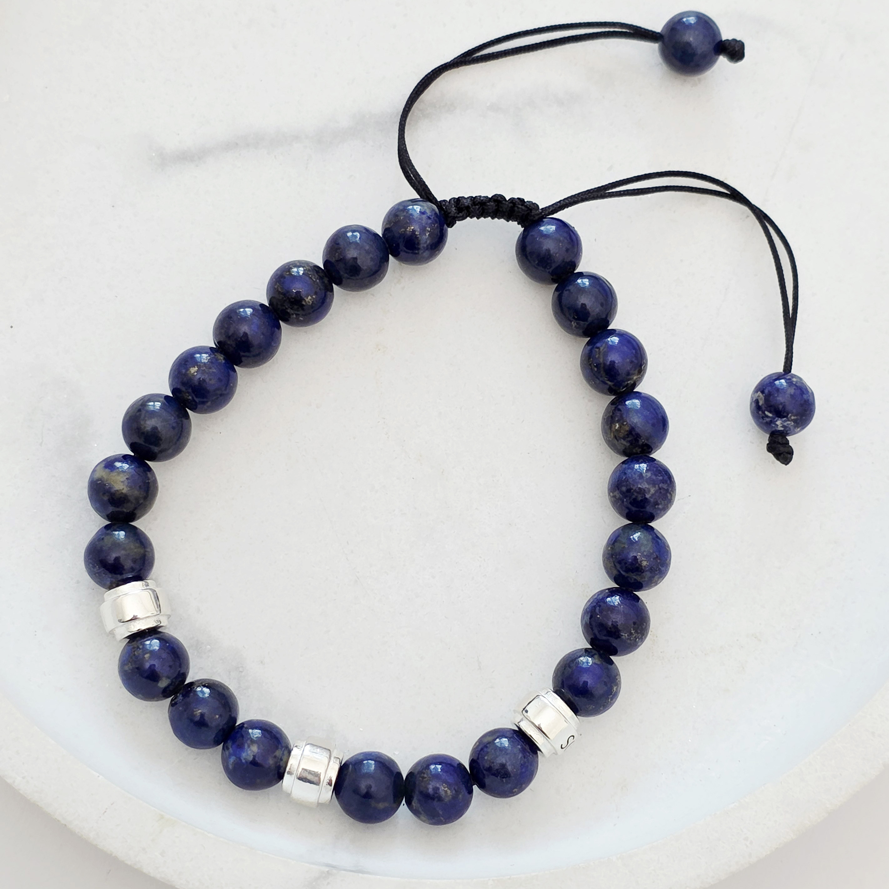 Realizată din pietre semiprețioase Lapis Lazuli de 8 mm, această brățară inspiră claritate mentală și armonie interioară. Trei cilindri din Argint 925 adaugă un accent sofisticat, completând perfect nuanțele intense ale pietrelor. Snurul negru, rezistent și reglabil, asigură o potrivire perfectă și confort pe orice încheietură.