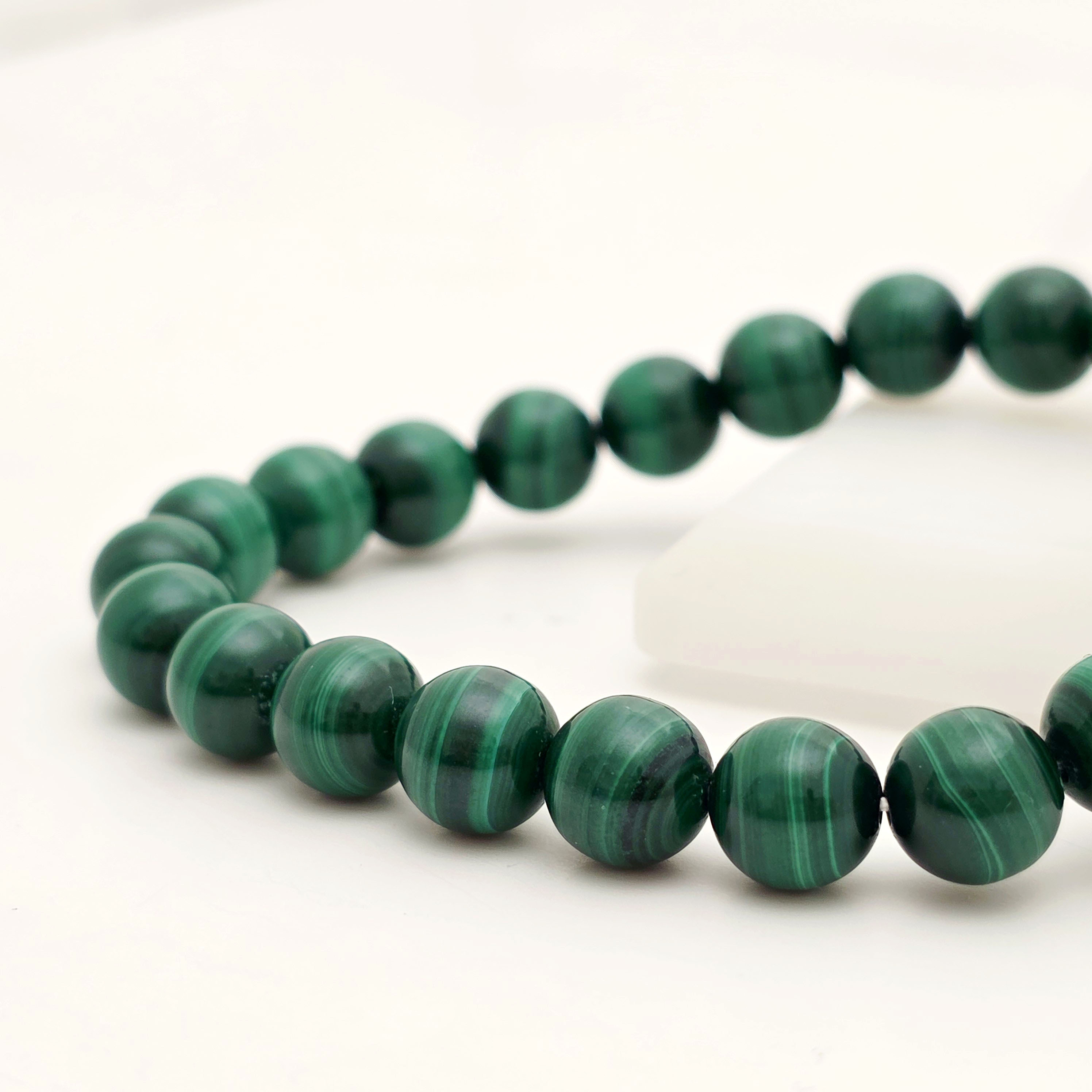 Această brățară este realizată din pietre semiprețioase Malachit de 8 mm, recunoscute pentru nuanțele lor verzi spectaculoase și modelul natural unic. Biluțele din Argint 925 oferă un contrast elegant, completând perfect farmecul malachitului. Șnurul elastic de calitate superioară asigură o potrivire comodă și flexibilă, ideală pentru purtare zilnică.