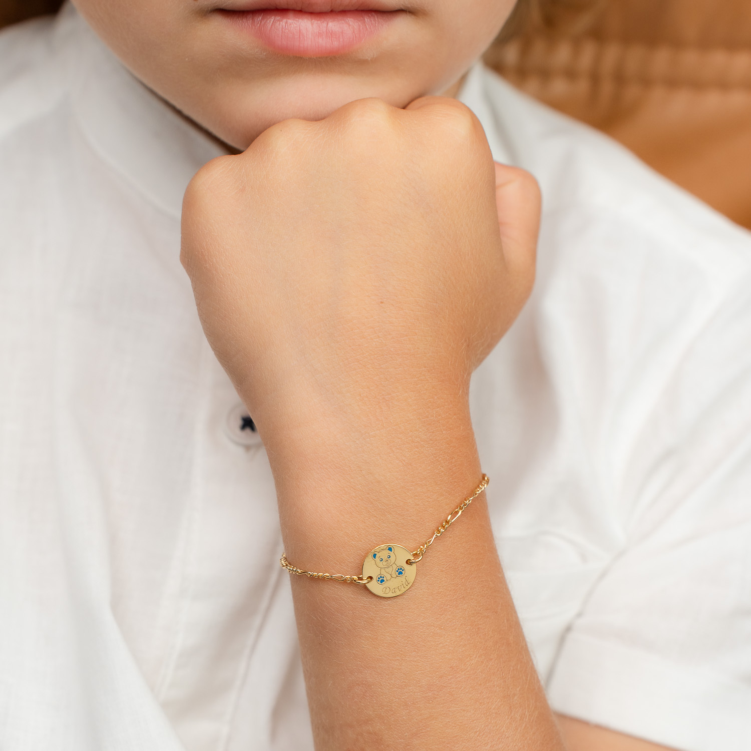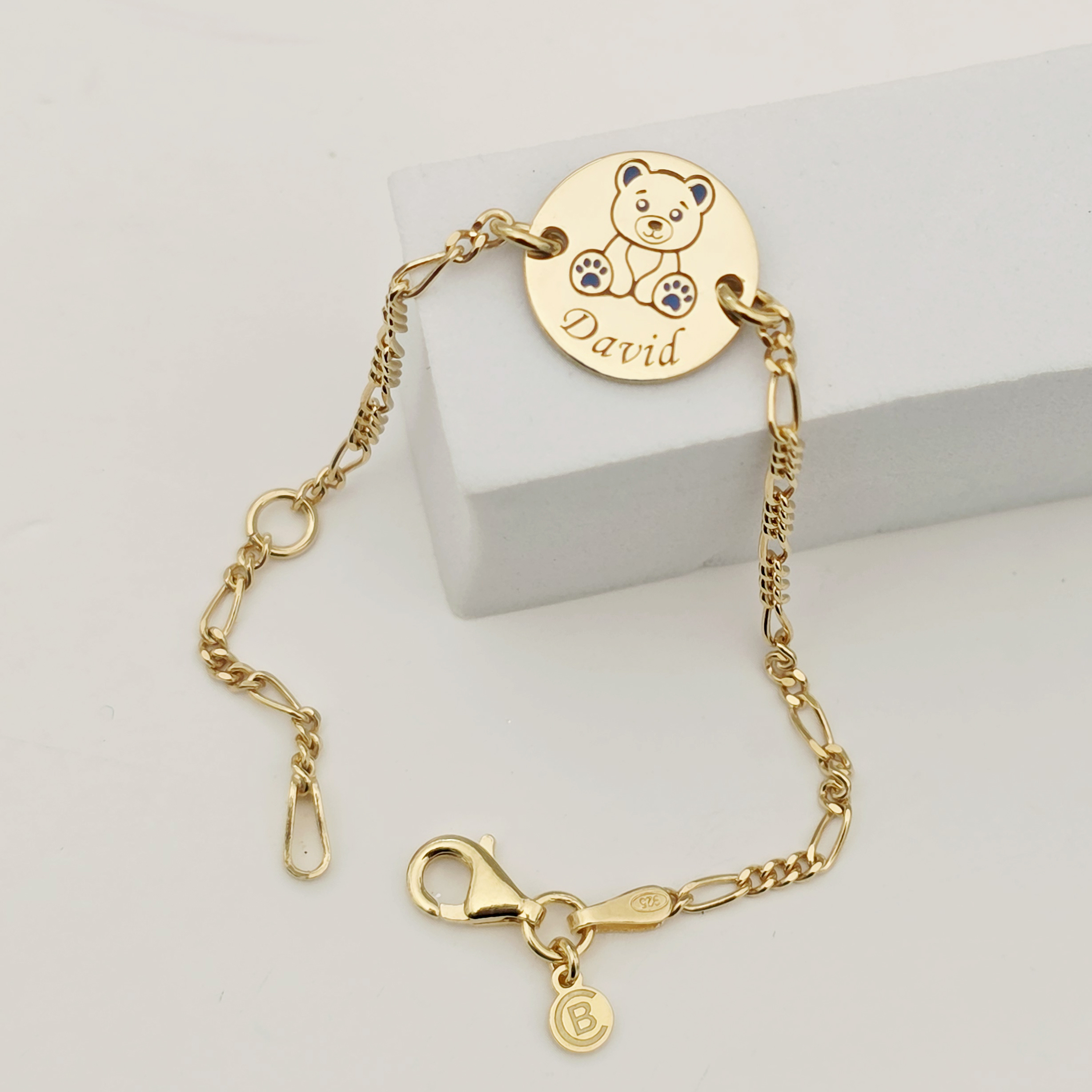 Această brățară personalizată este realizată din Argint 925 placat cu Aur Galben de 18K, oferindu-i un aspect elegant și rafinat. Pandantivul în formă de ursuleț, decorat cu email albastru, adaugă un detaliu jucăuș și simbolic, potrivit pentru băieței. Lănțișorul delicat, disponibil în variante pentru fete sau băieți, completează perfect acest accesoriu unic.