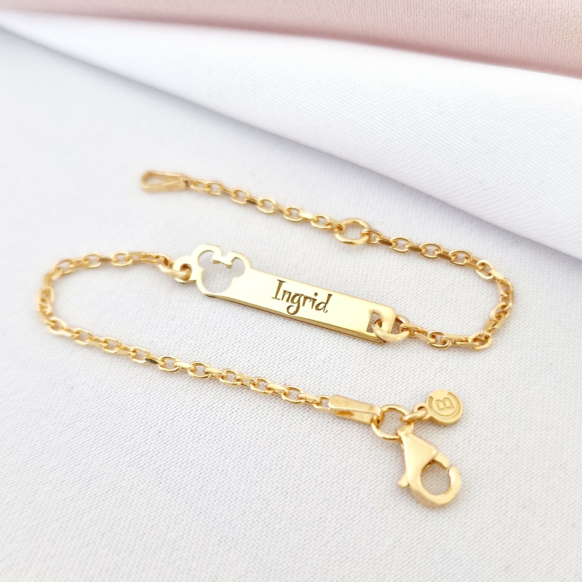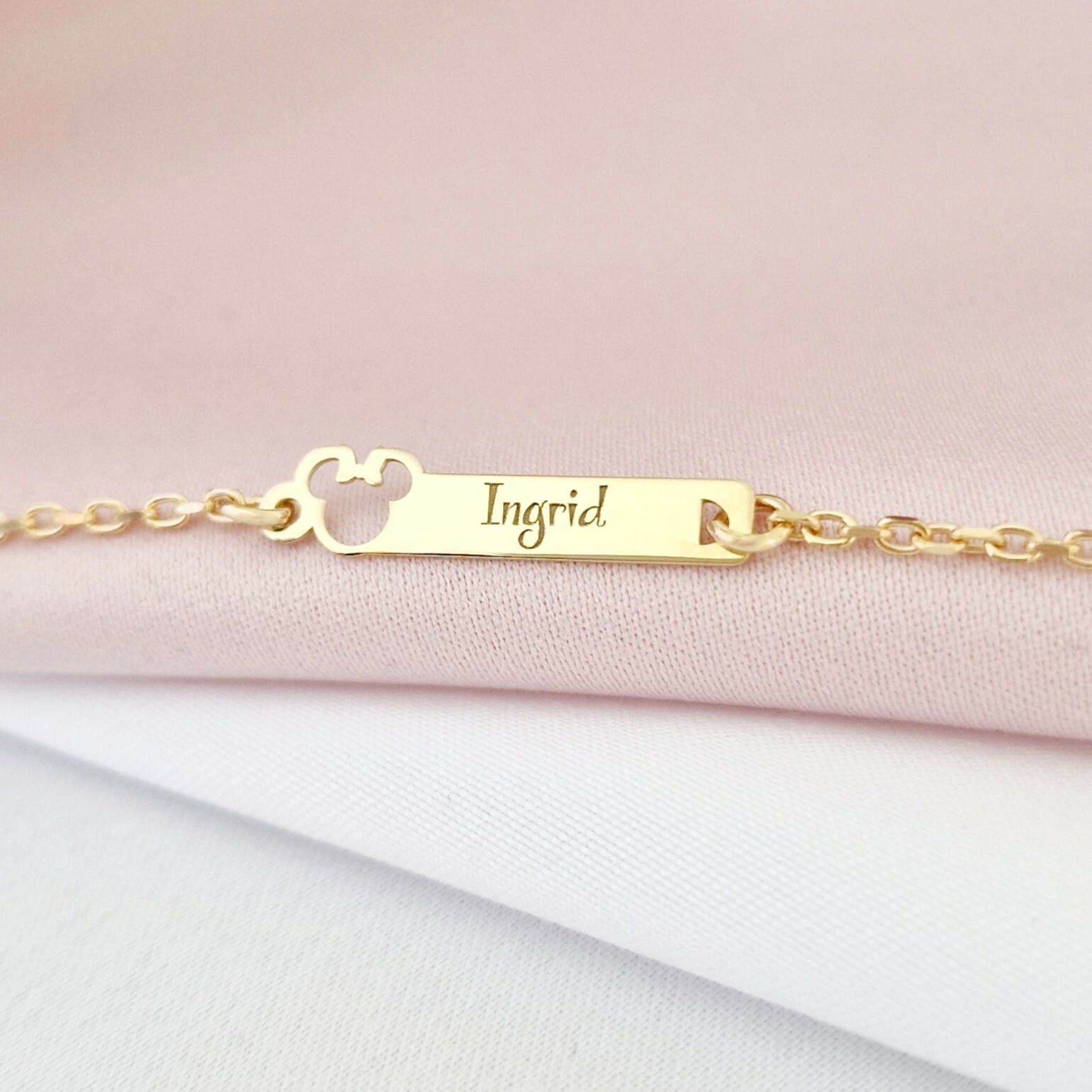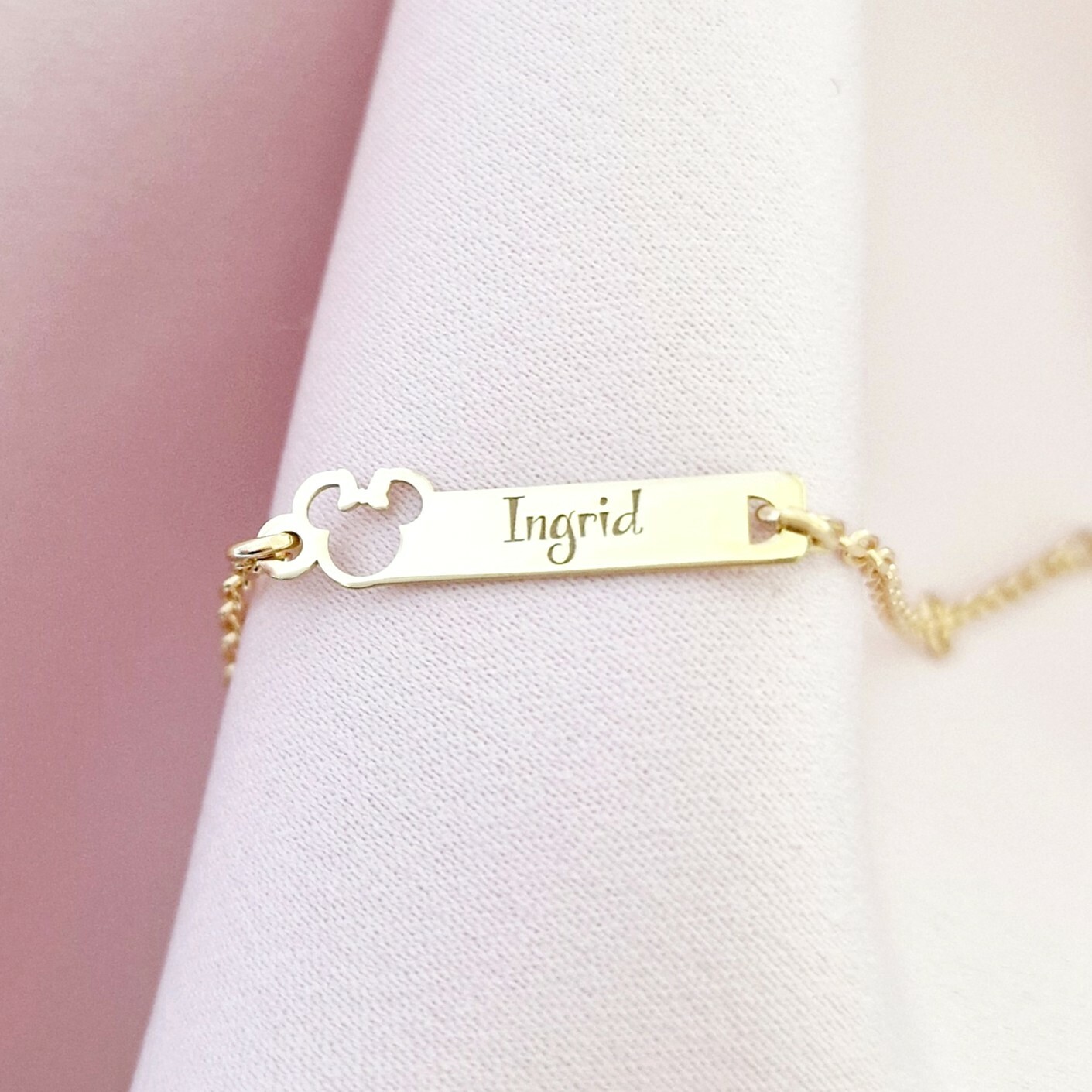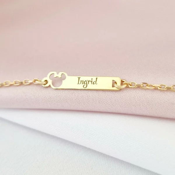 Bratara placuta - Forma soricel cu fundita gravat cu nume personalizat - Argint 925 placat cu Aur Galben 18K - Cu lantisor fata/baiat