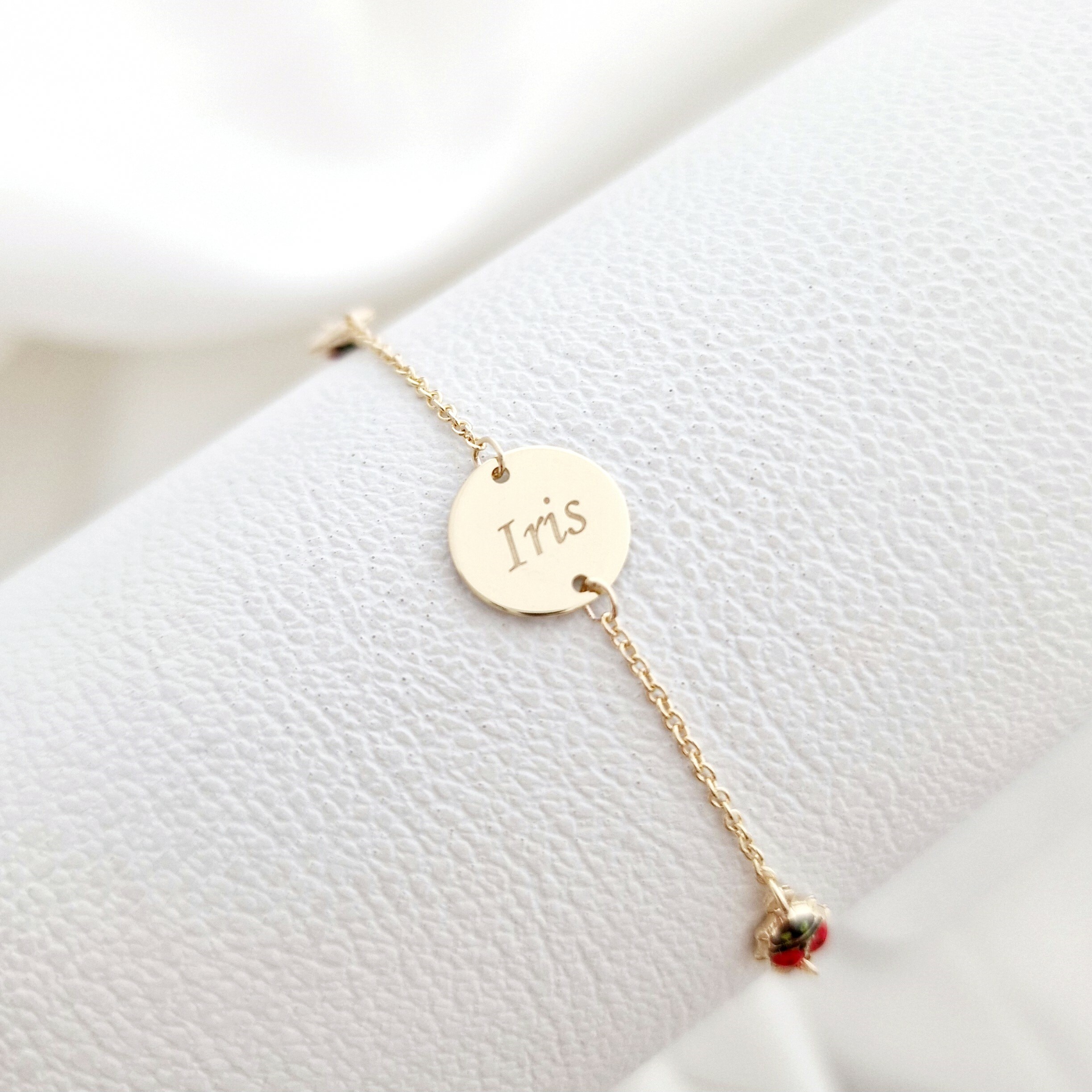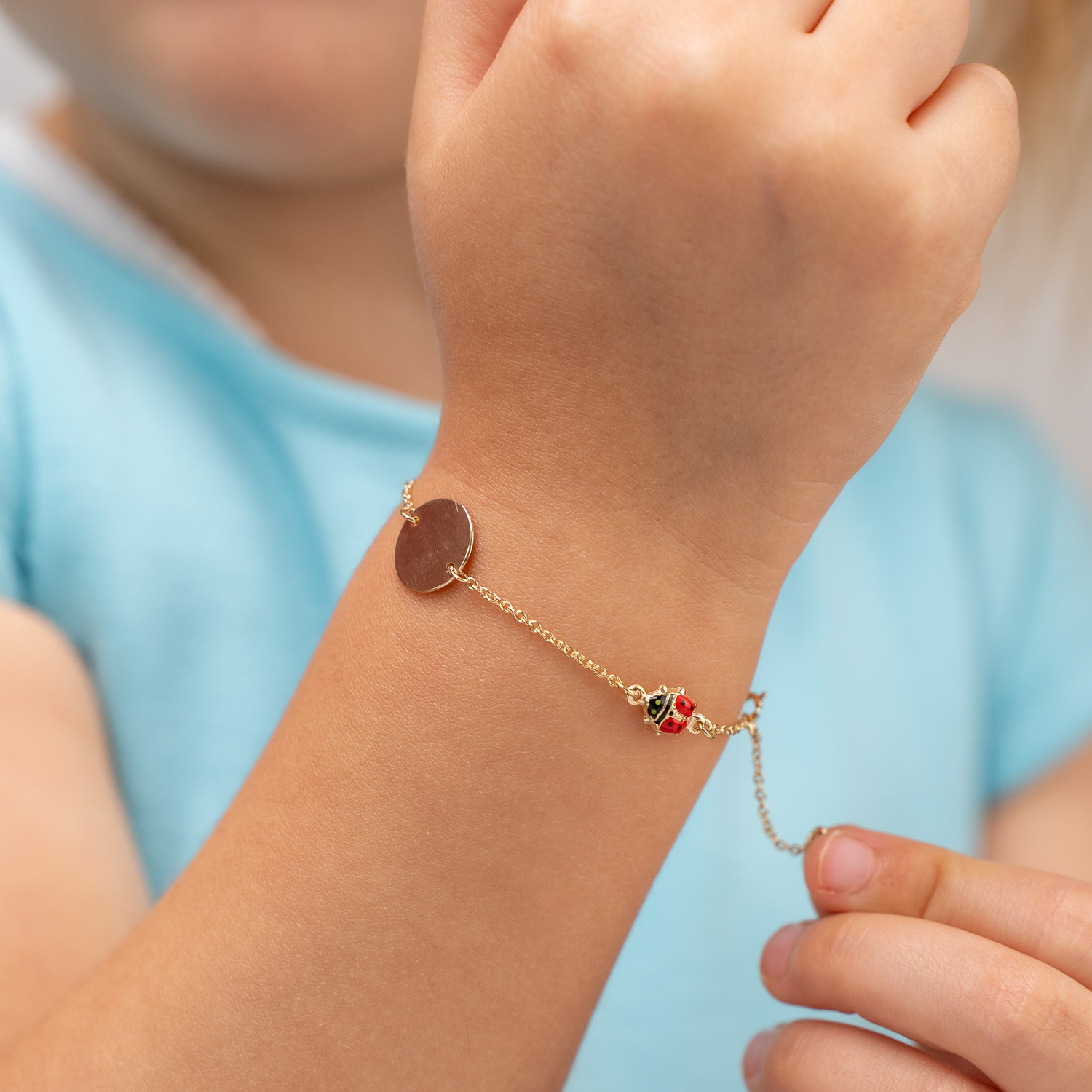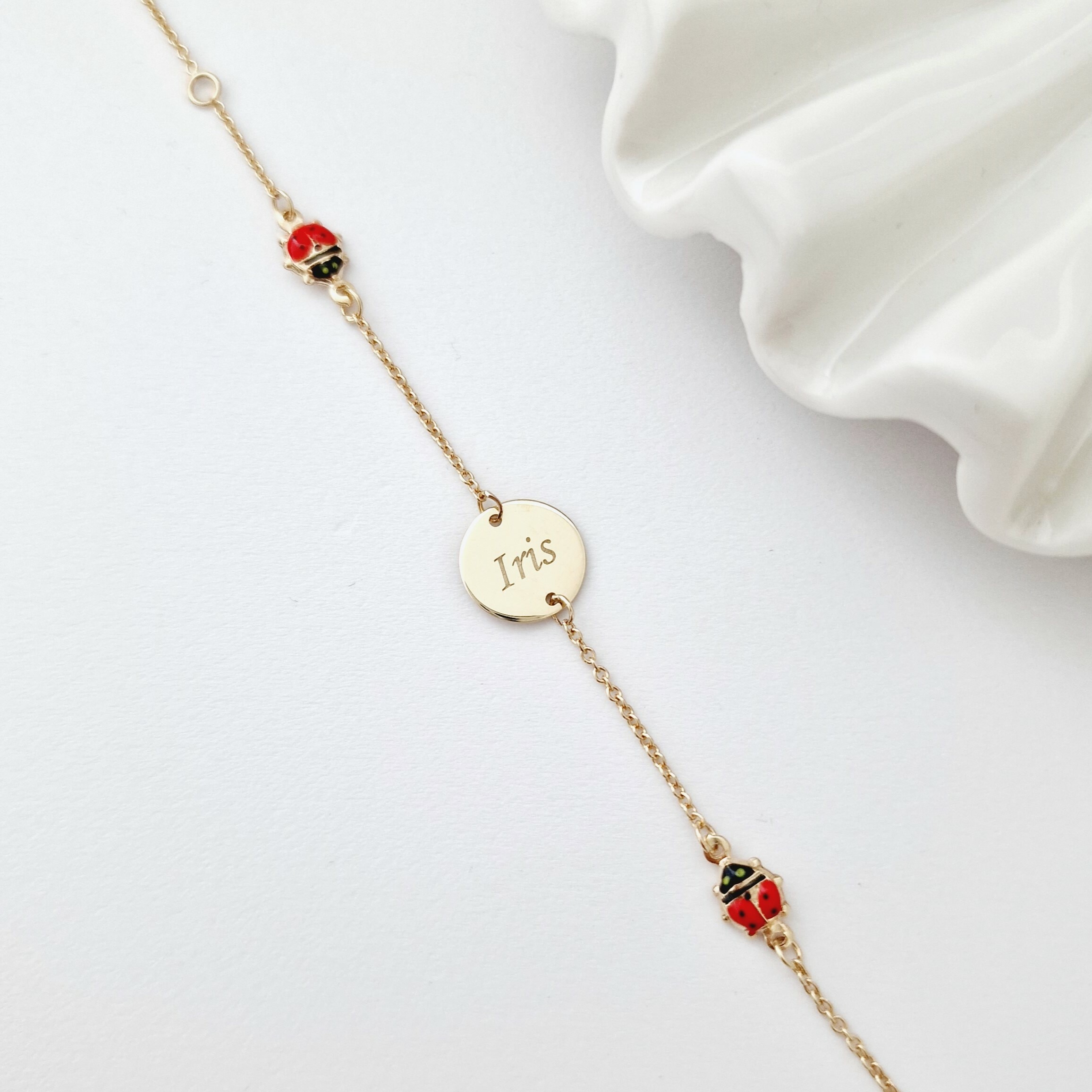 Bratara Chic Baby - Banut personalizat si Buburuze cu email rosu - Lantisor ajustabil - Aur Galben 9K