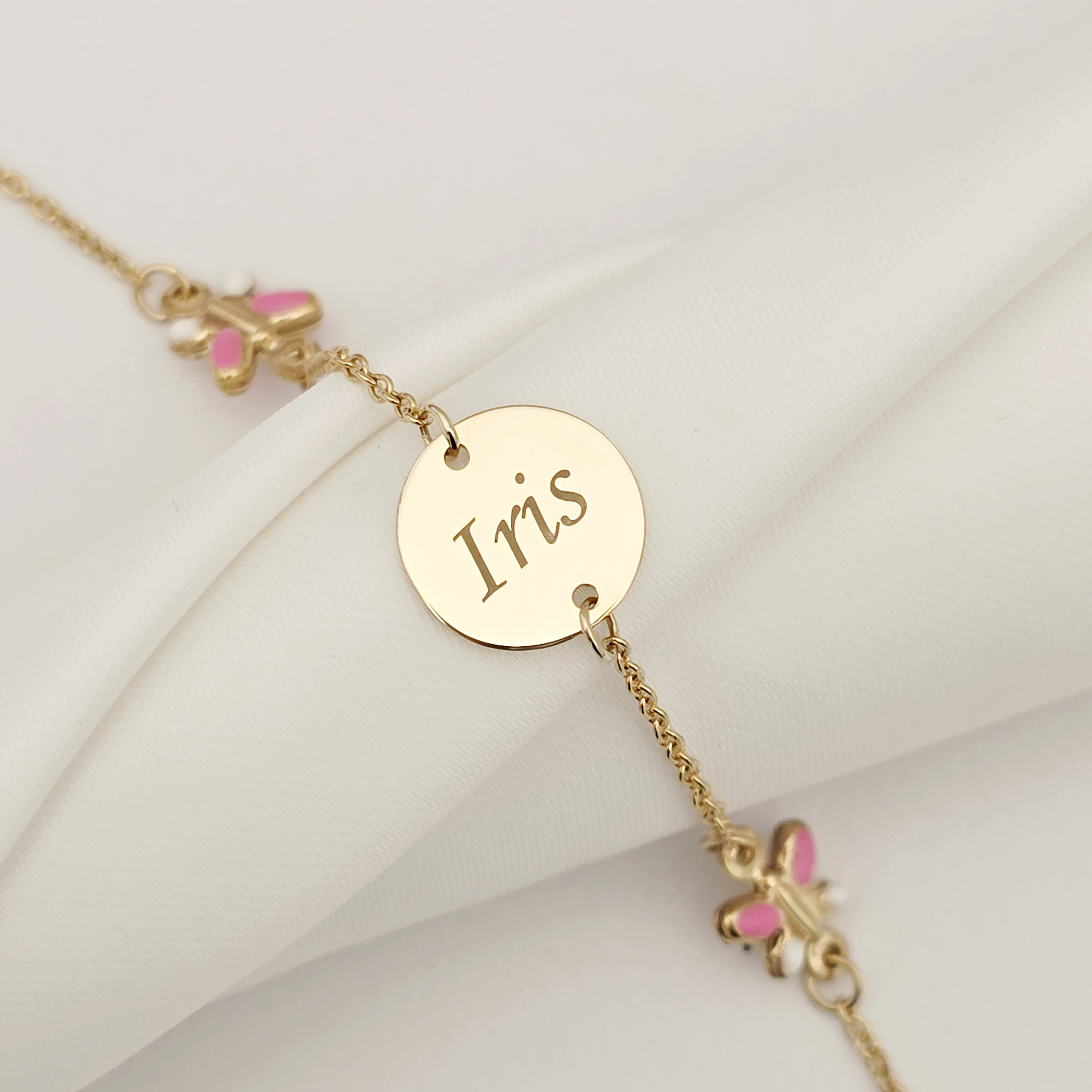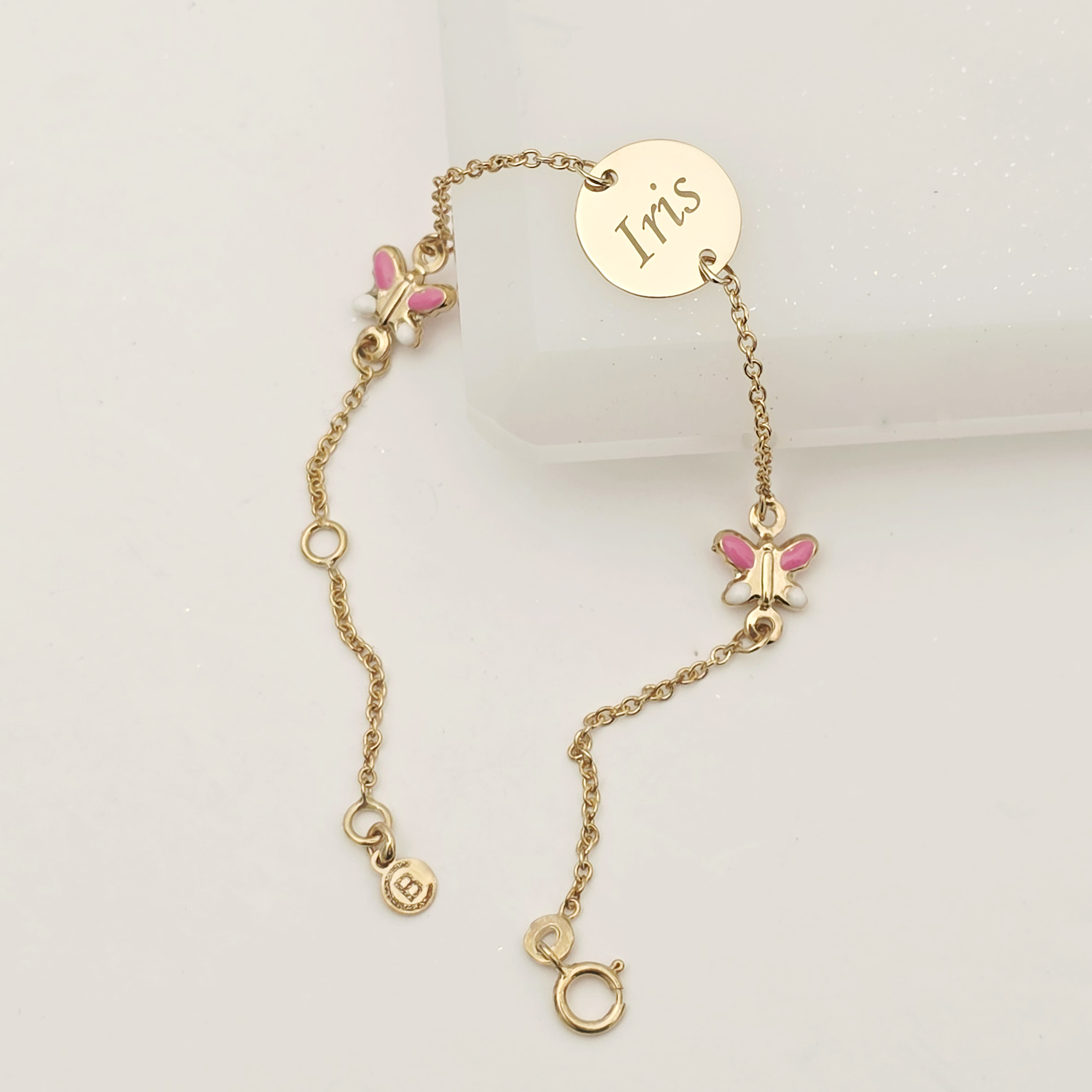 Bratara Chic Baby - Banut personalizat si Fluturasi cu email roz - Lantisor ajustabil - Aur Galben 9K