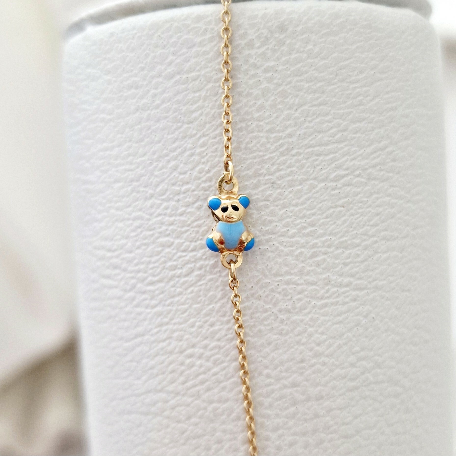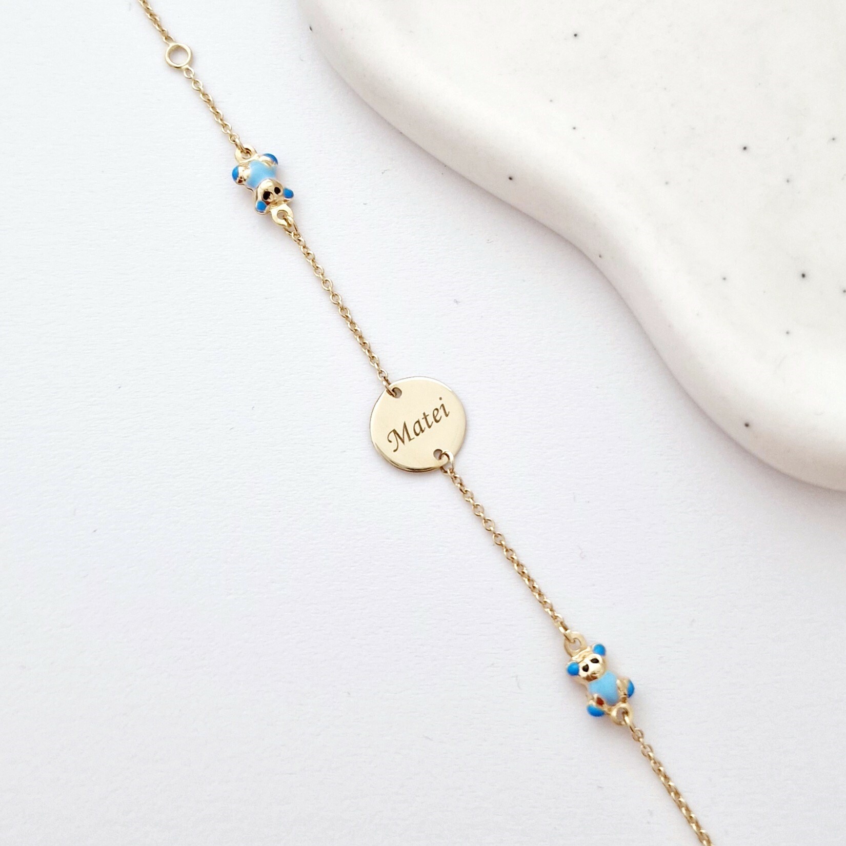 Bratara Chic Baby - Banut personalizat si Ursuleti cu email albastru - Lantisor ajustabil - Aur Galben 9K