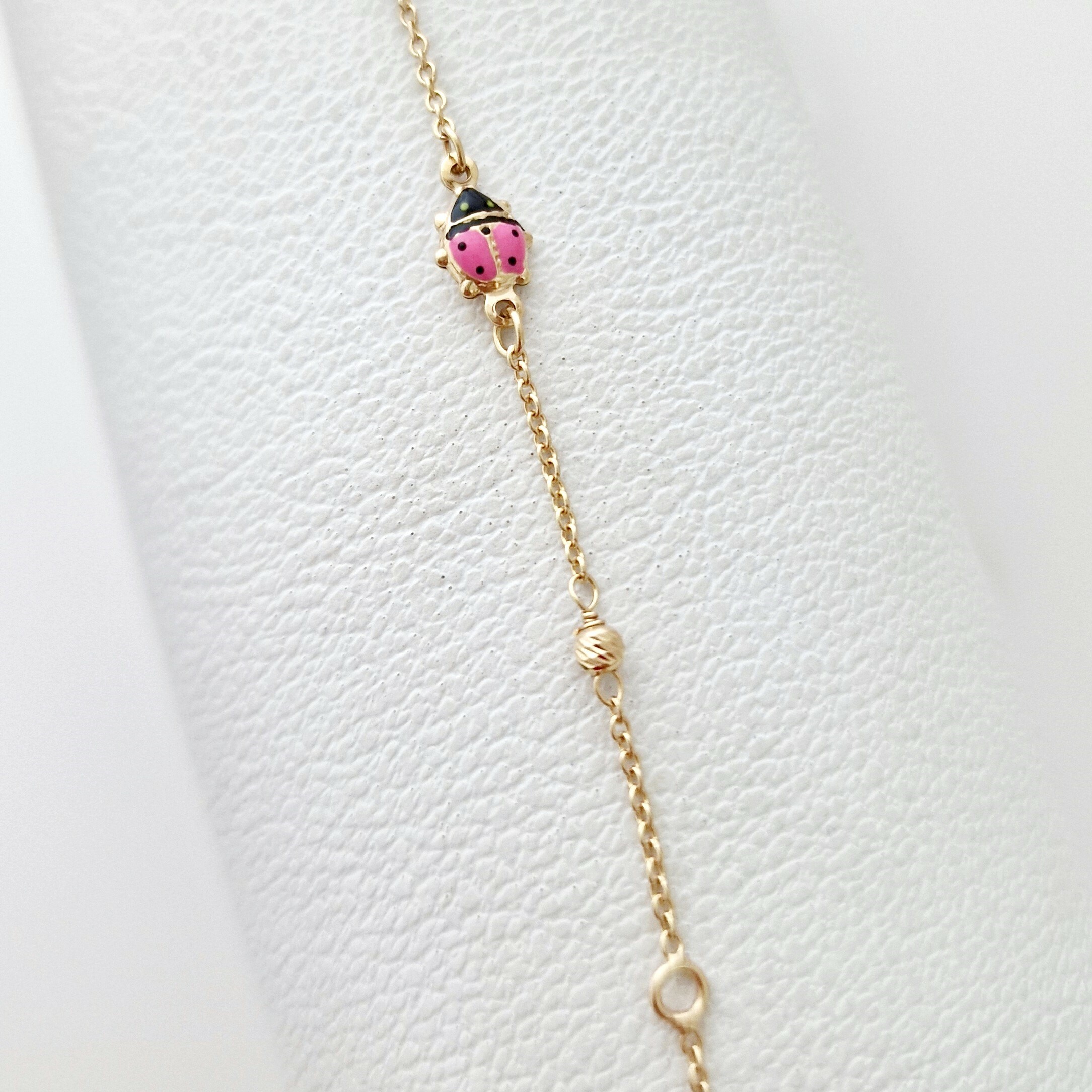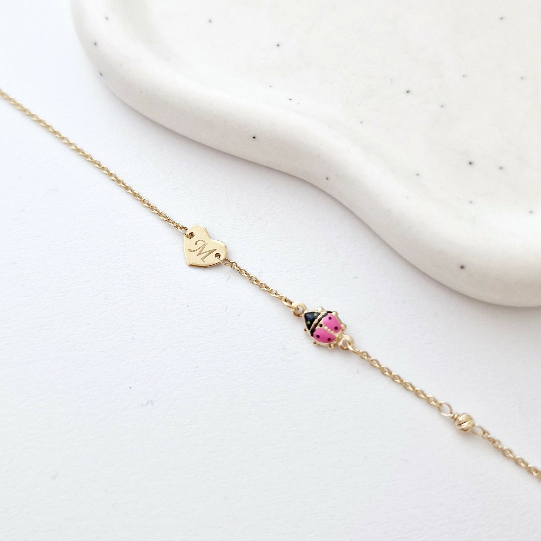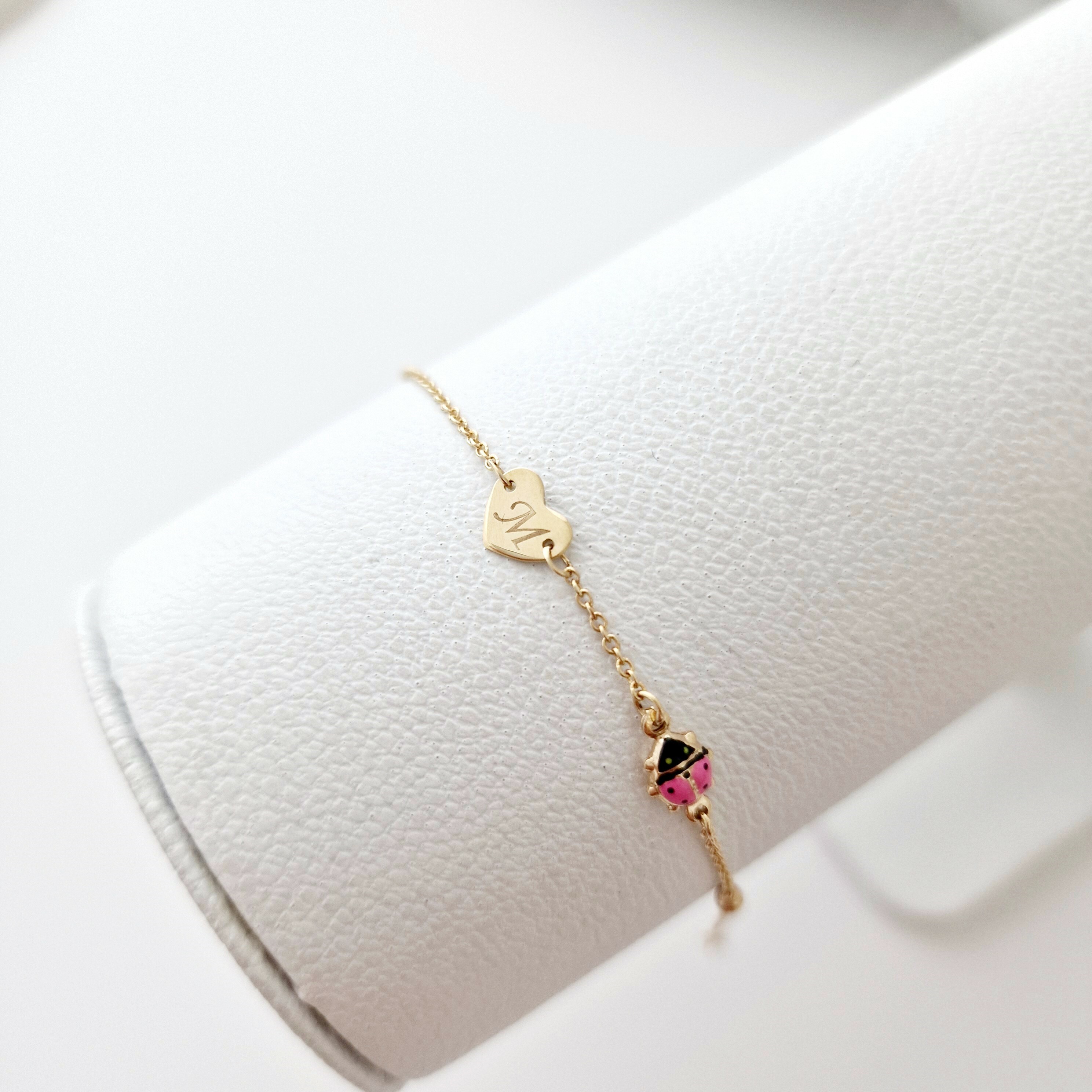 Bratara Chic Baby - Inima personalizata si Buburuze cu email roz - Lantisor ajustabil - Aur Galben 9K