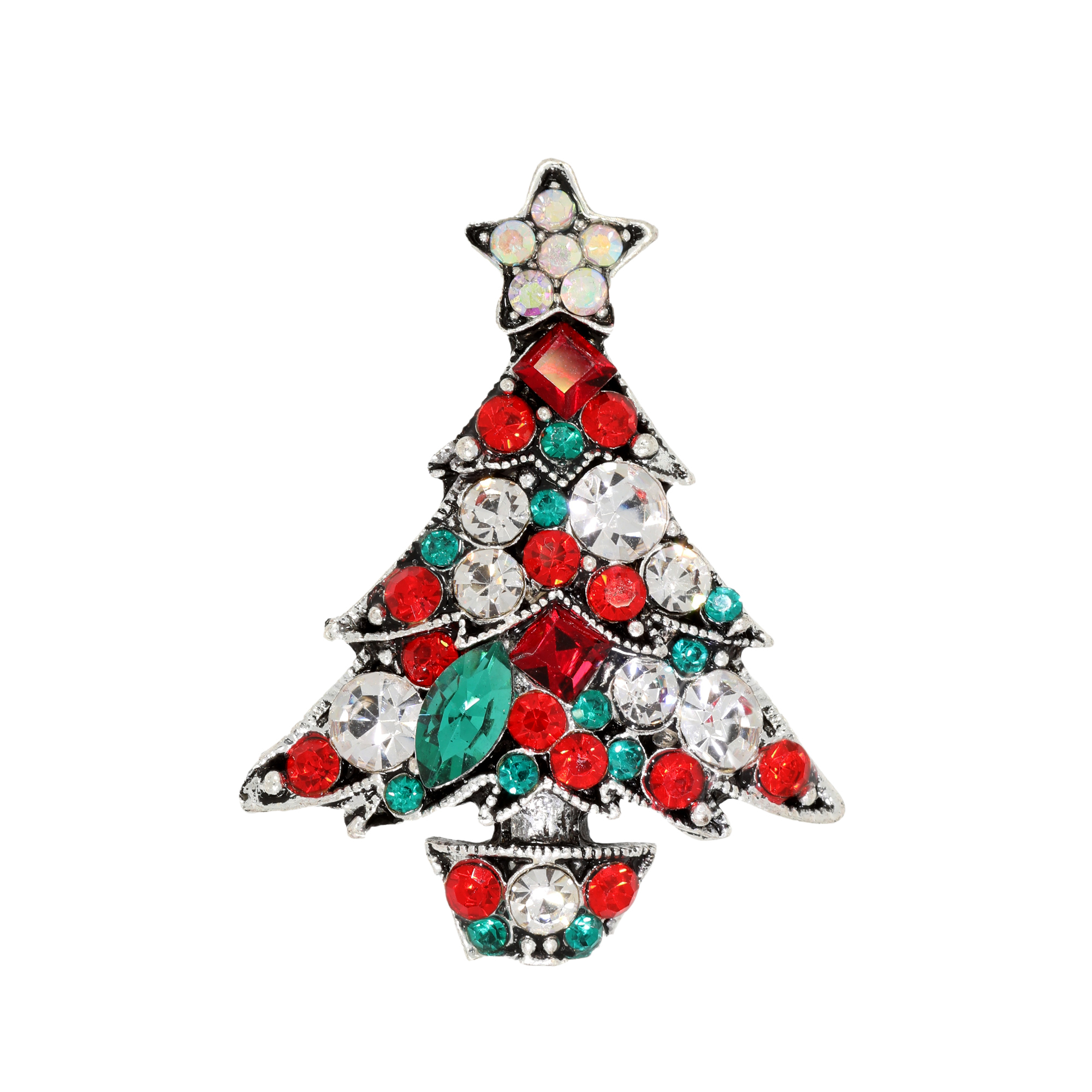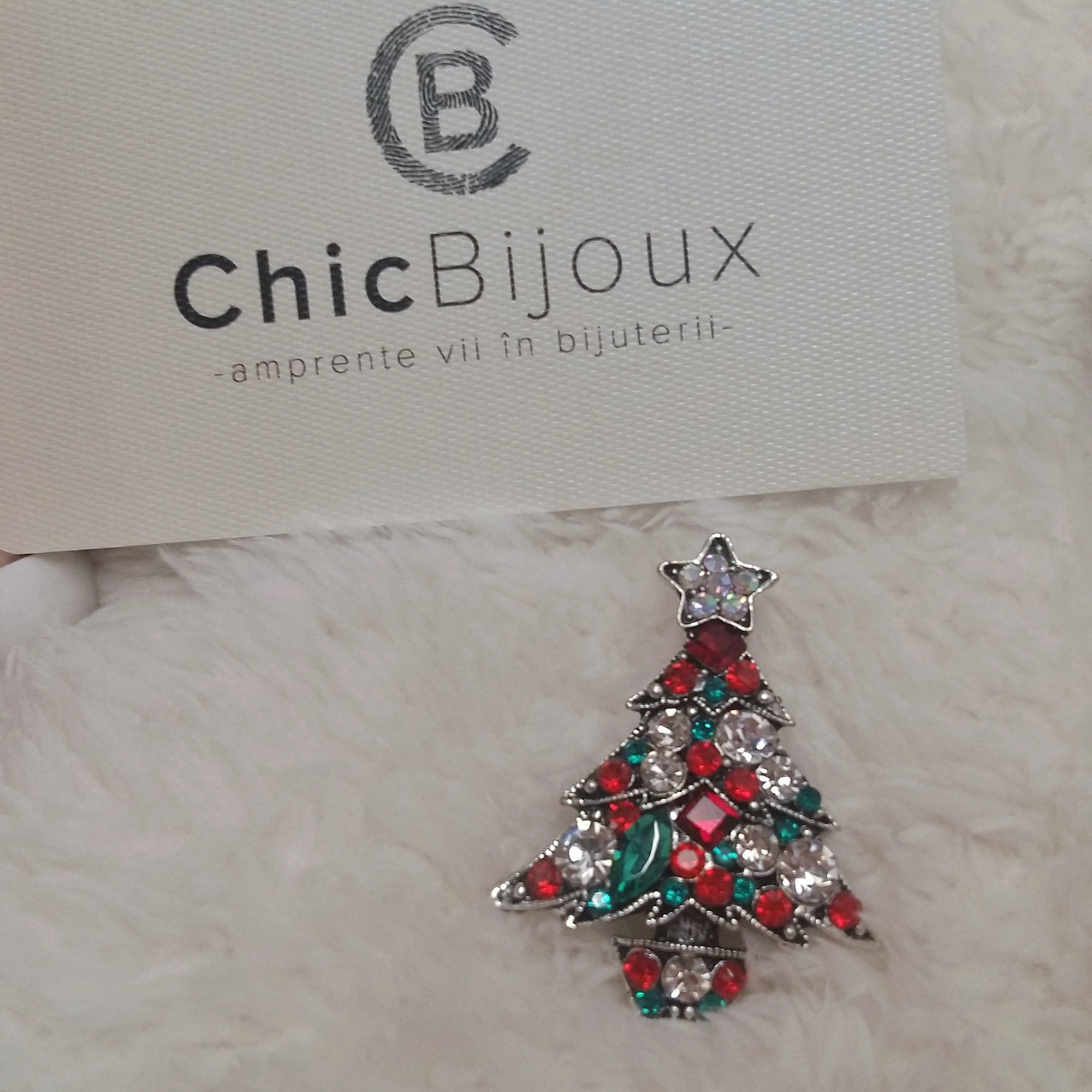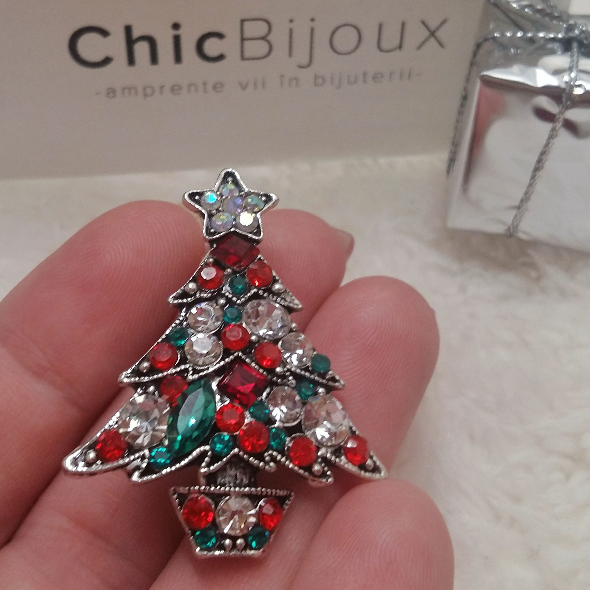 Apropierea sarbatorilor de iarna ne da o stare de bine, de bucurie si de incantare. Alege sa iti asortezi tinutele cu aceasta brosa sub forma de bradulet argintiu din metal inoxidabil. Pietricelele albe, rosii si verzi sunt Zirconii si te vor introduce pe loc in atmosfera sarbatorilor.
