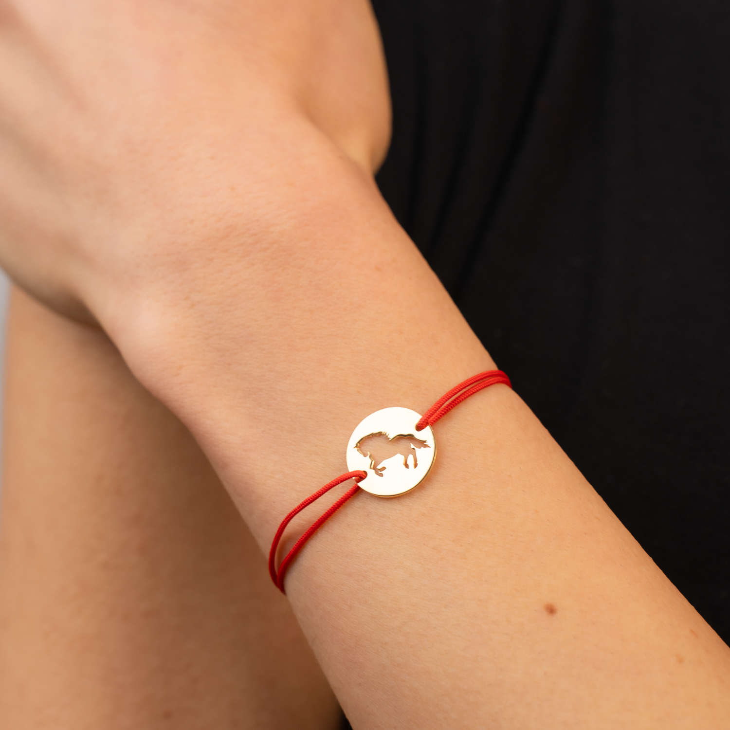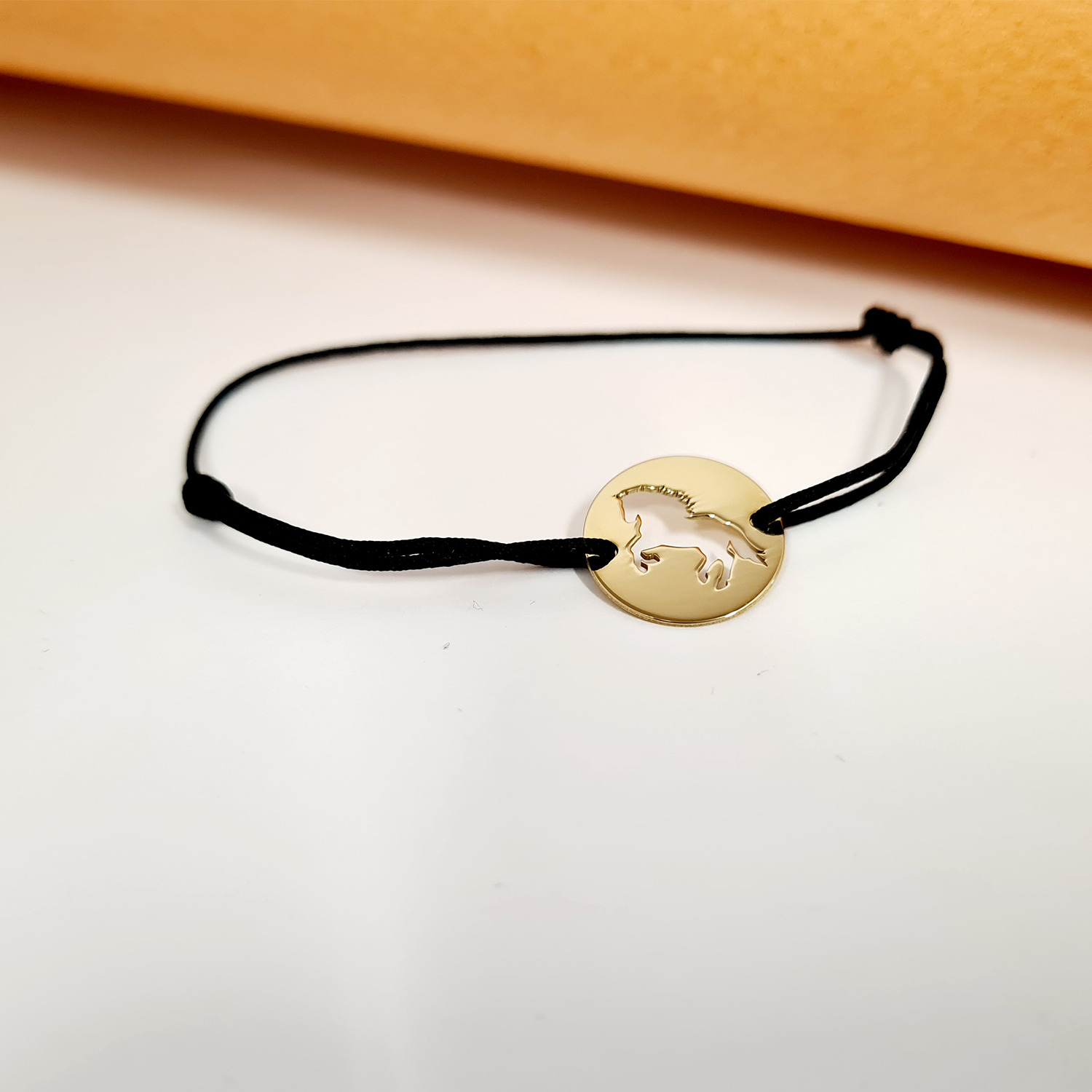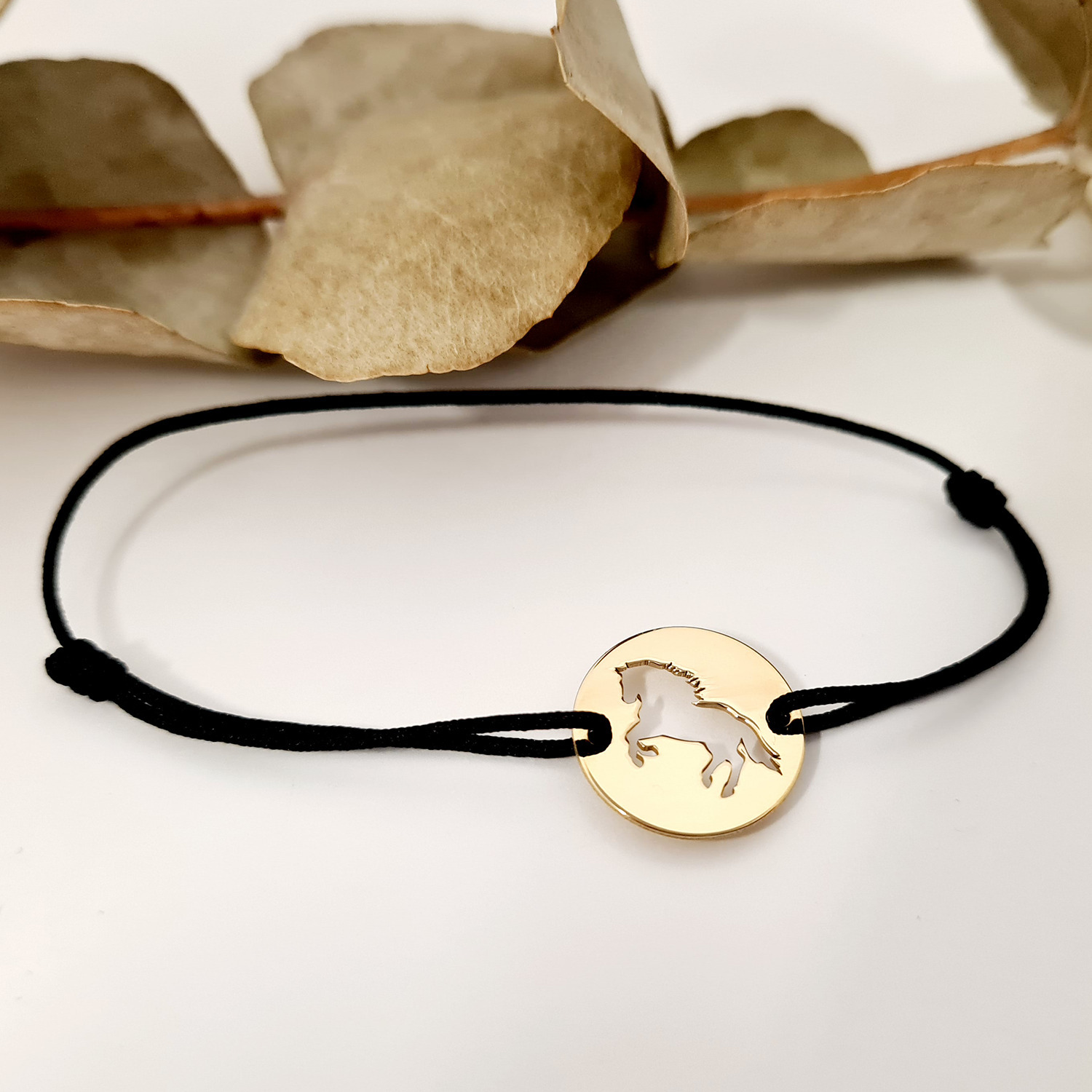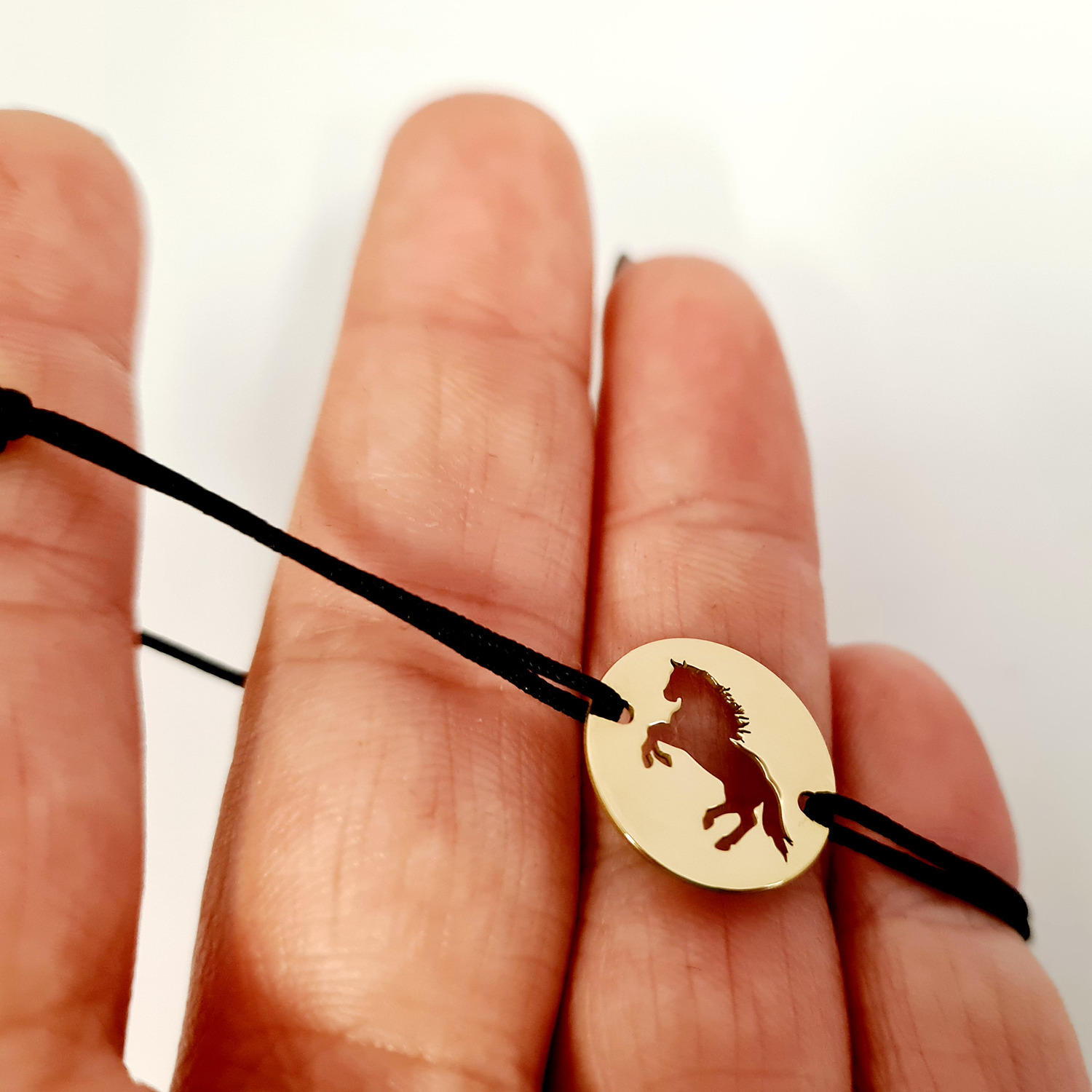 Bratara personalizata - Banut de 15 mm - Cal decupat - Argint 925 placat cu Aur Galben 18K - snur reglabil