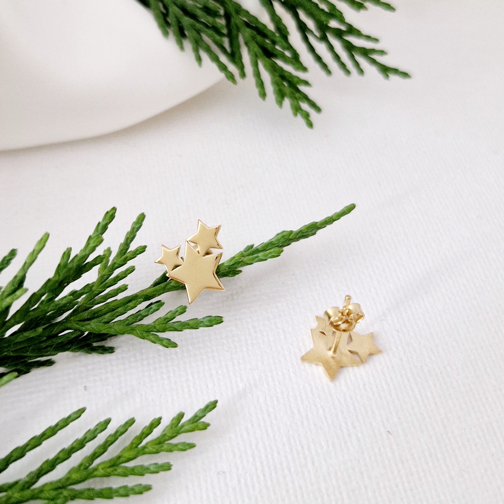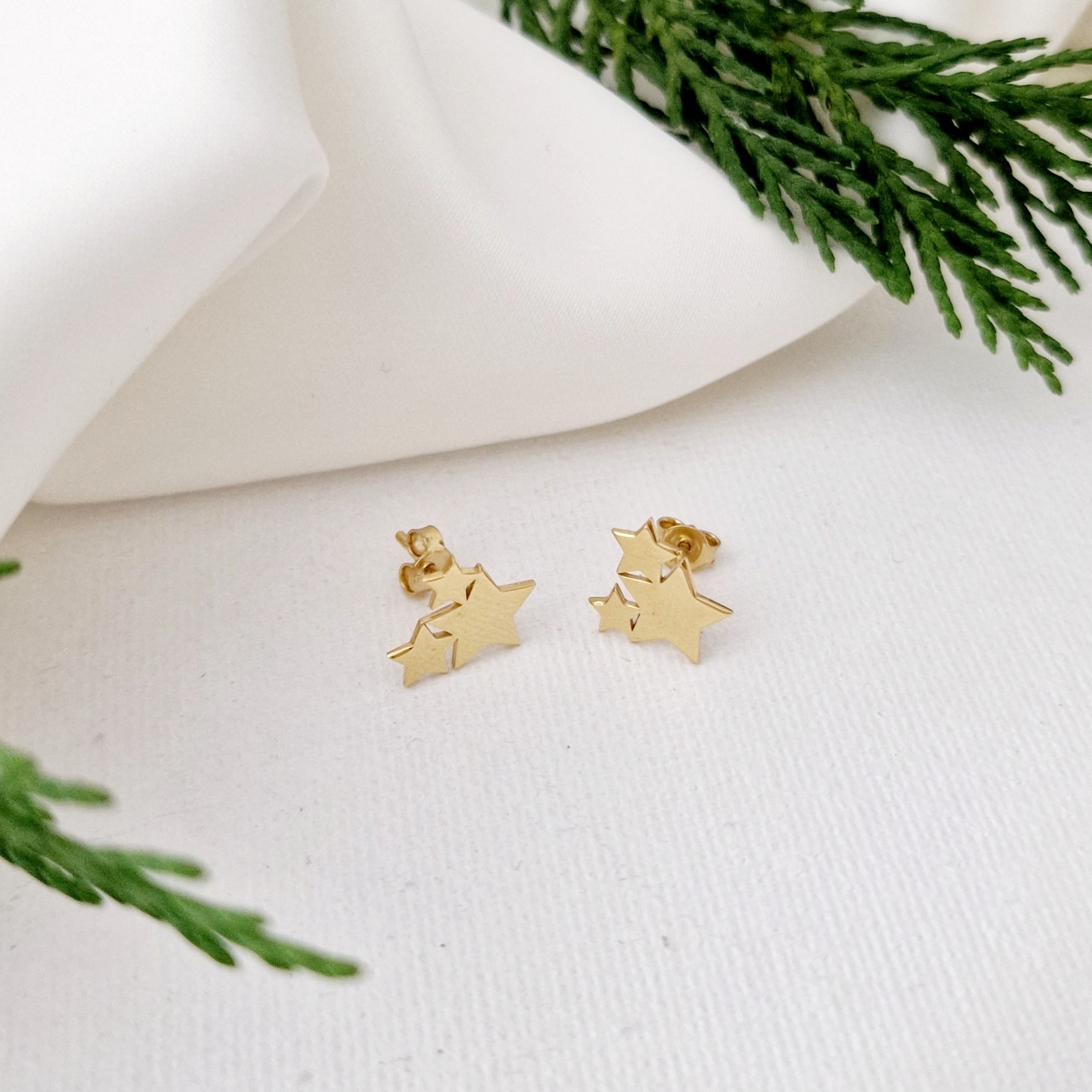 Cercei festivi - Sclipire Stelara - 3 stelute unite cu - Inchizatoare surub - Argint 925 placat cu Aur Galben 18K