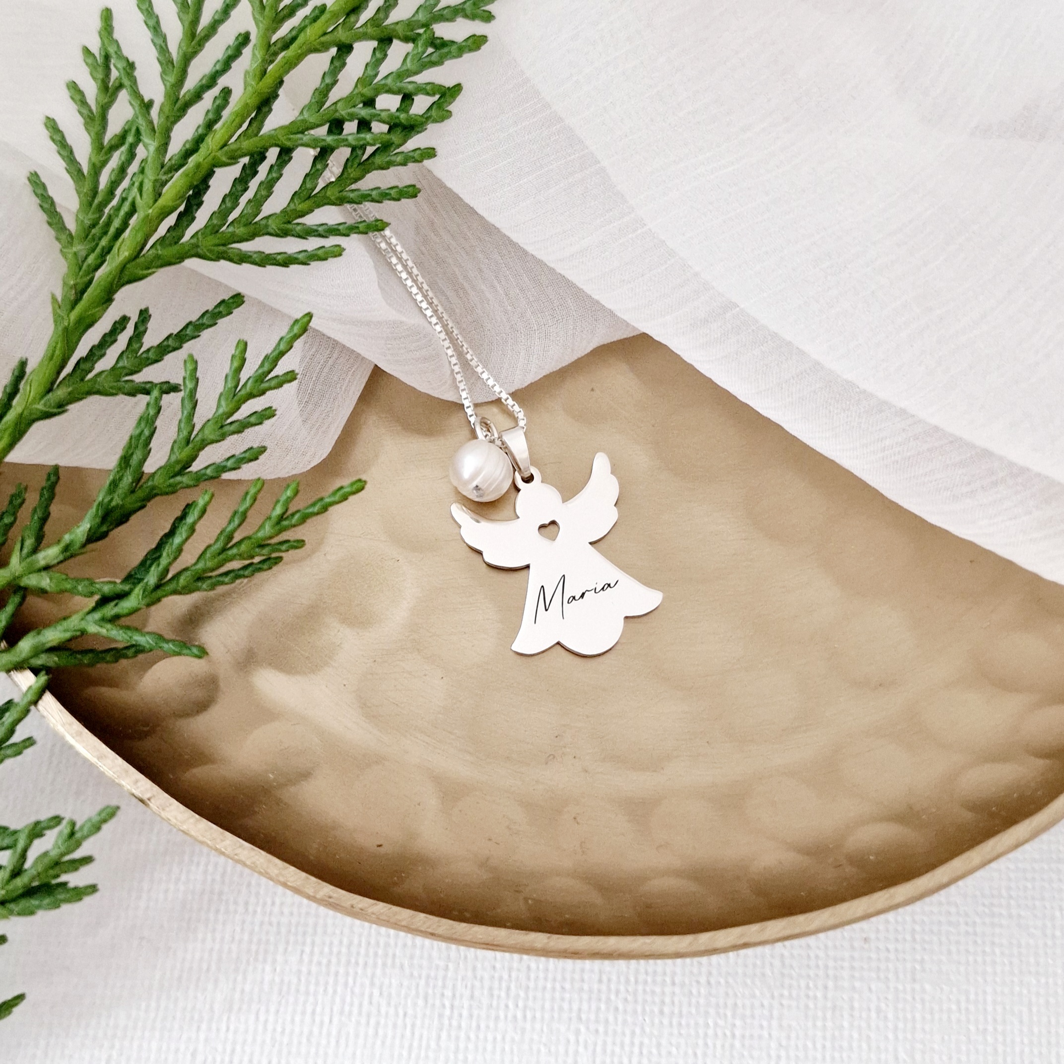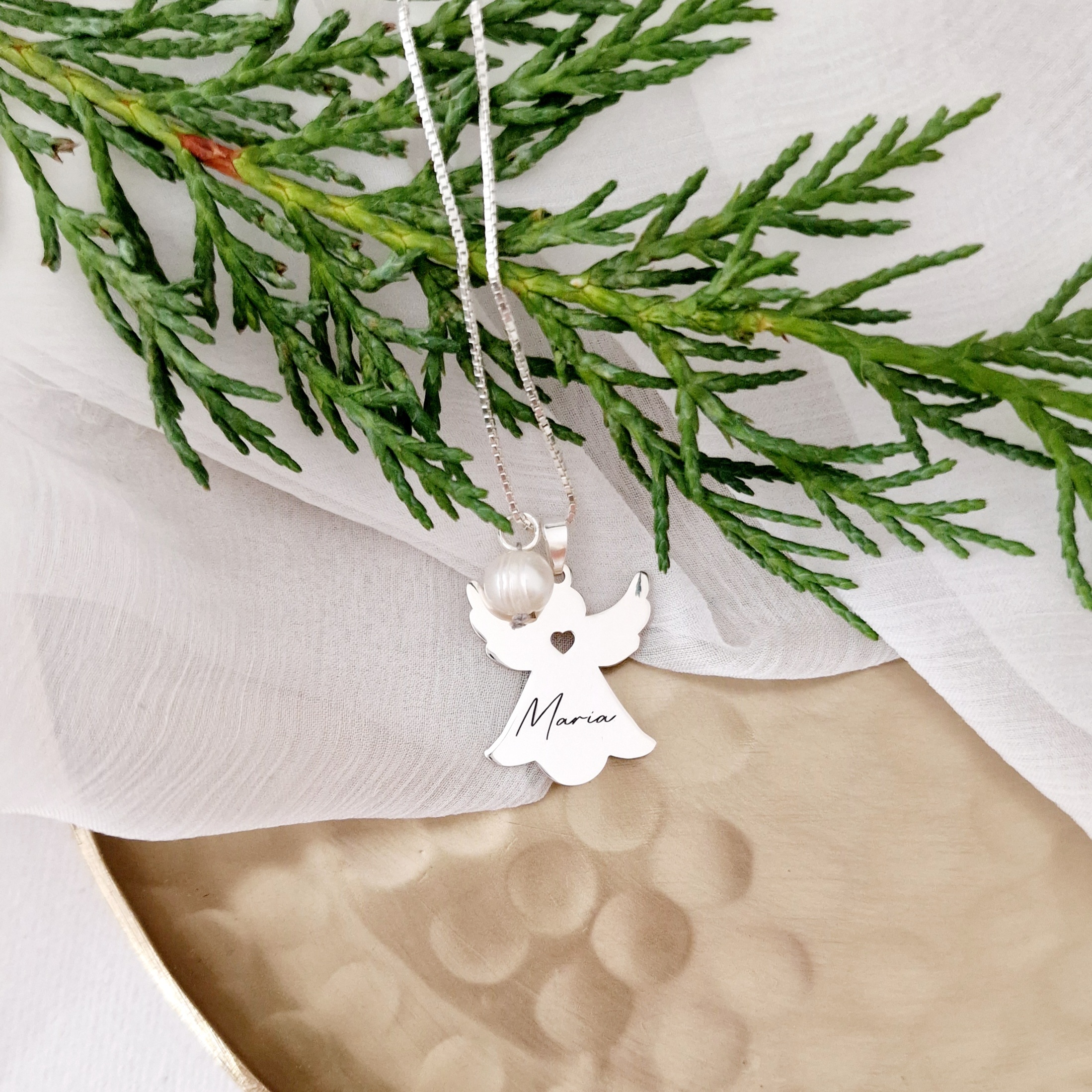 Lantisor festiv - Iubire Angelica - Pandantiv inger cu inima decupata, nume si charm perla - Argint 925