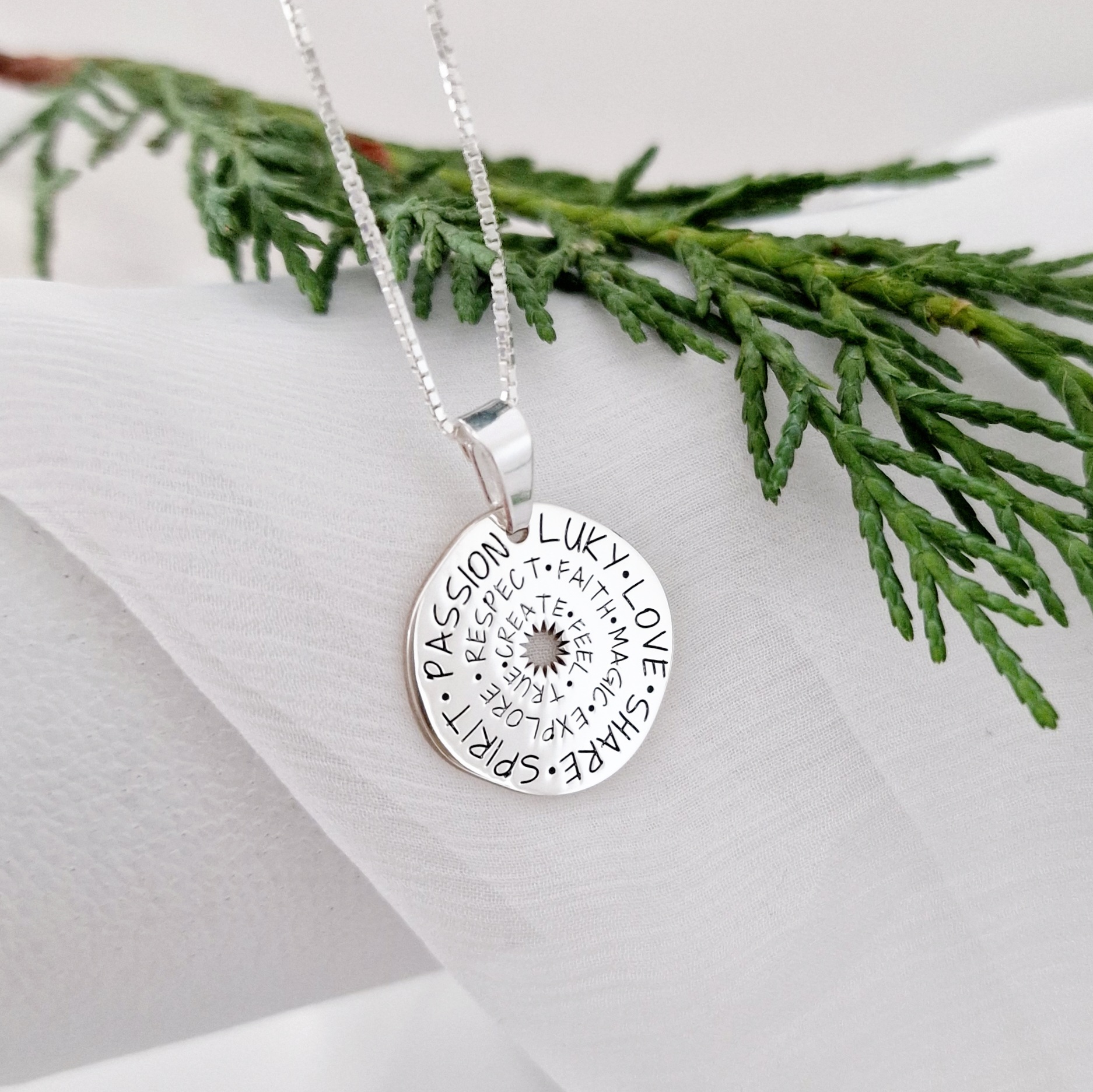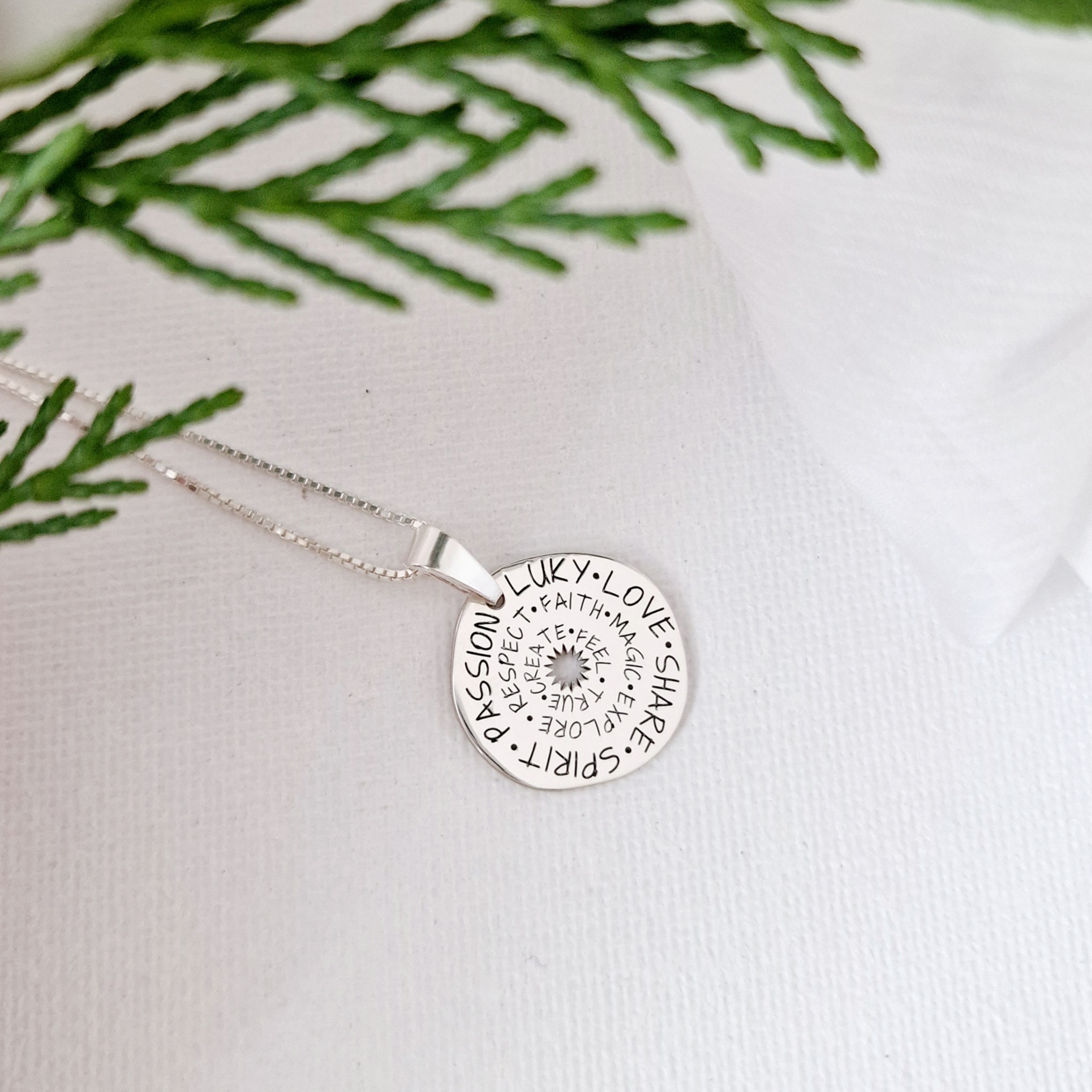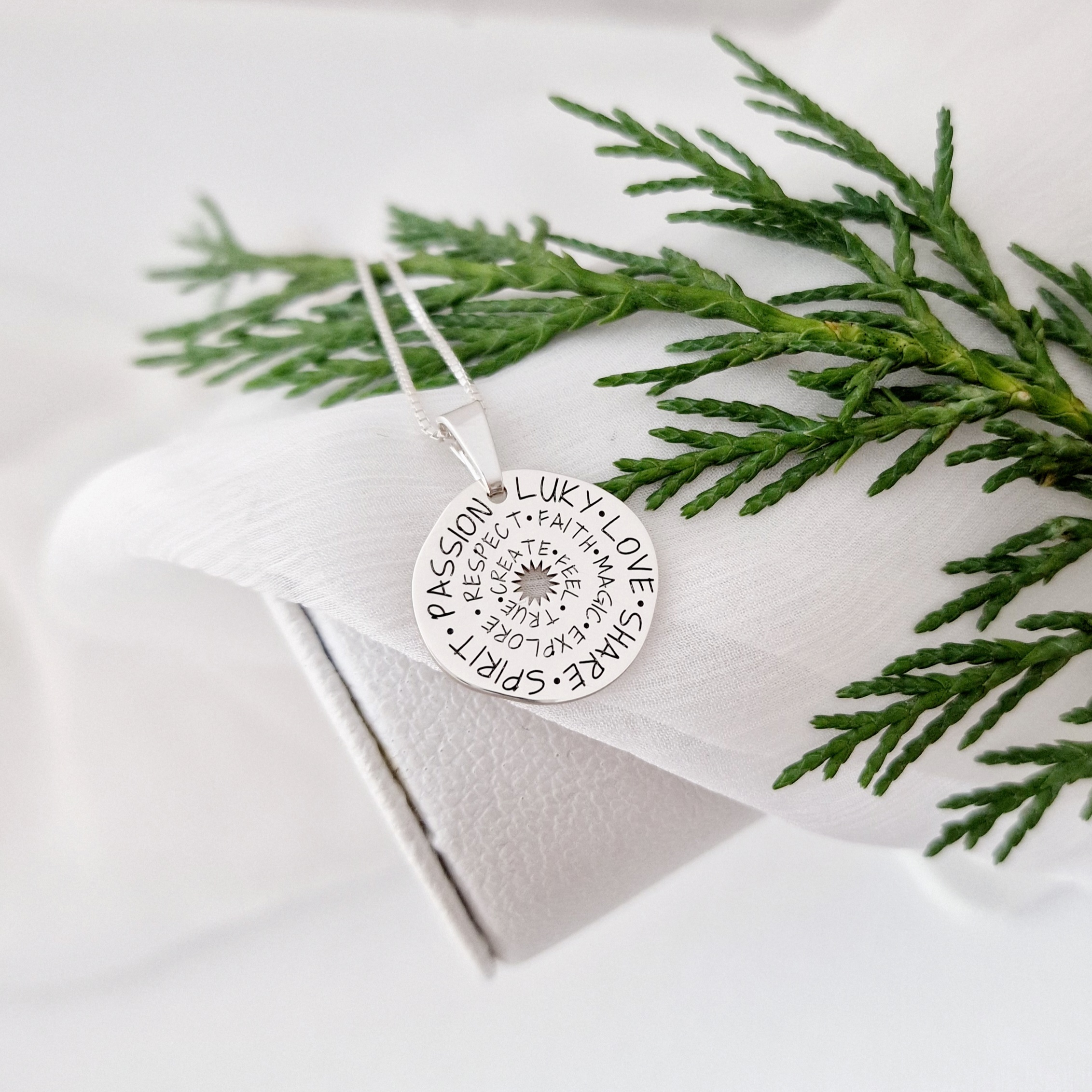 - Pandantivul are dimensiunea de 18 mm si este personalizat cu o serie de cuvinte cu semnificate.
