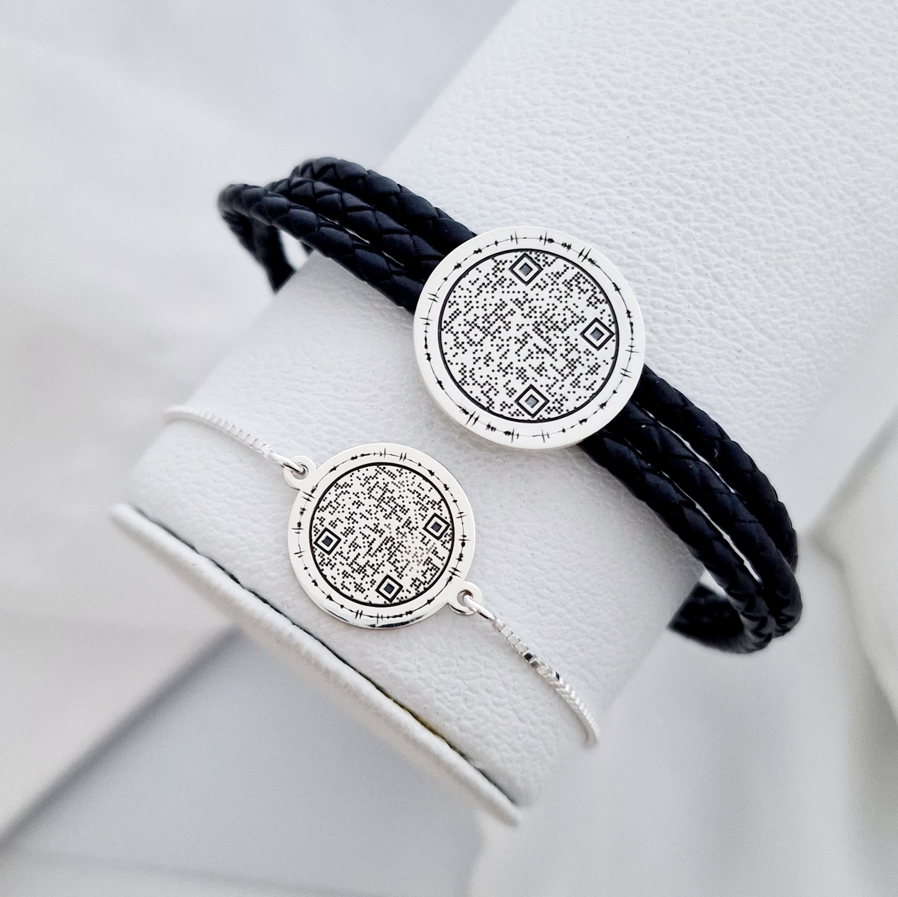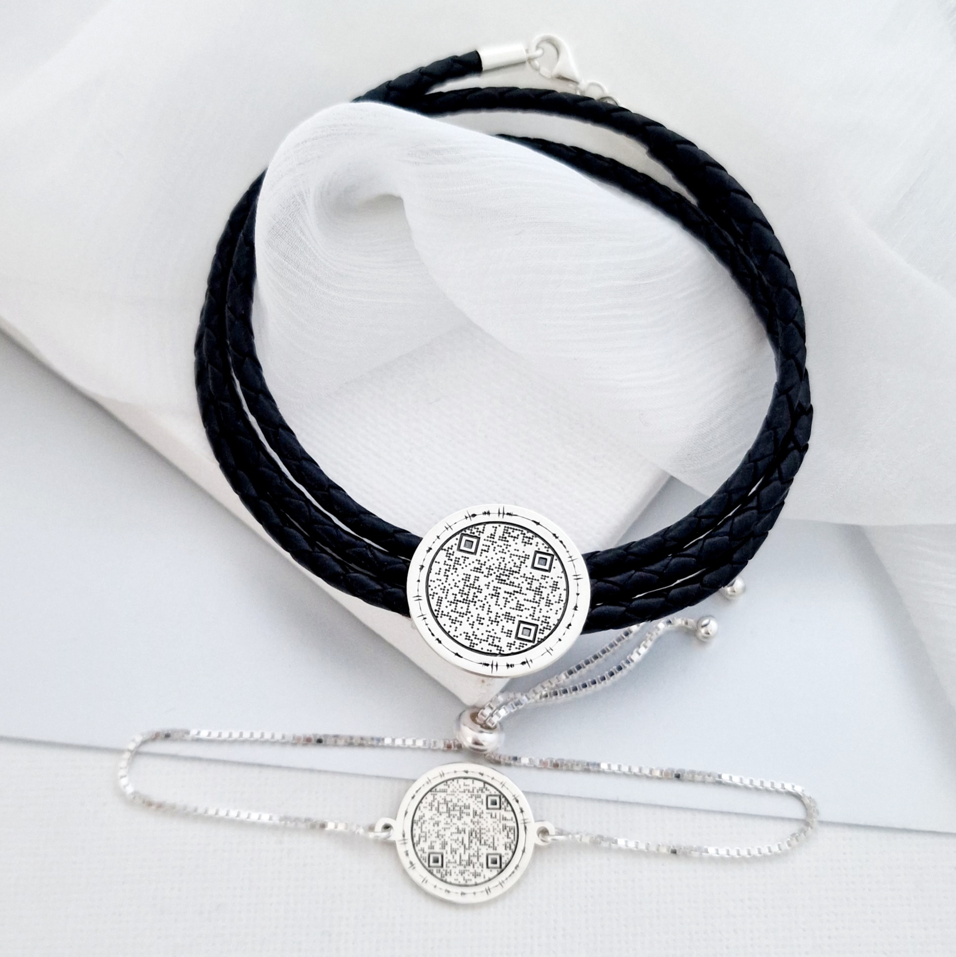 Set 2 bratari - Iubire transmisa prin amprenta vocala si Qr Code - Argint 925 - Lant glisant si piele impletita