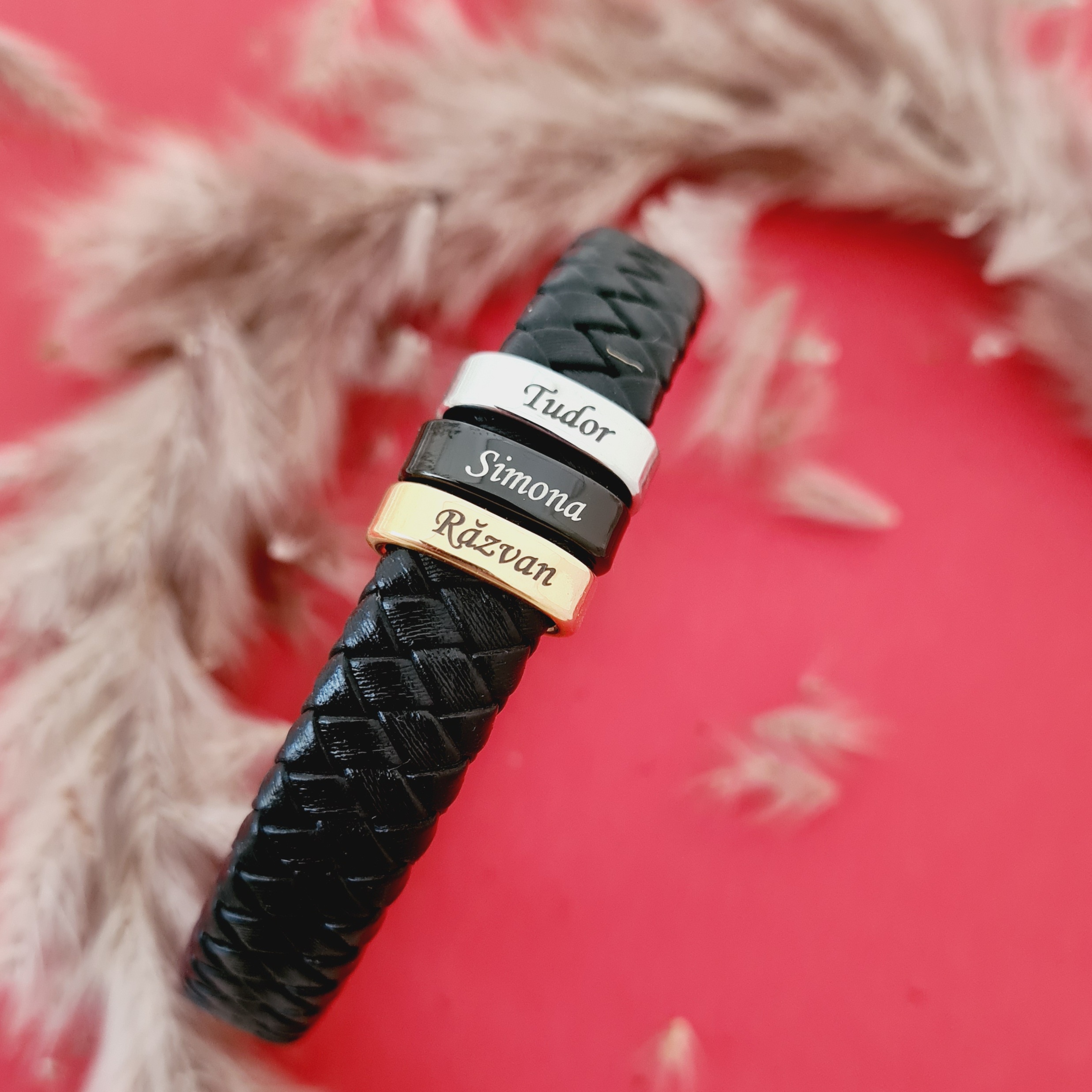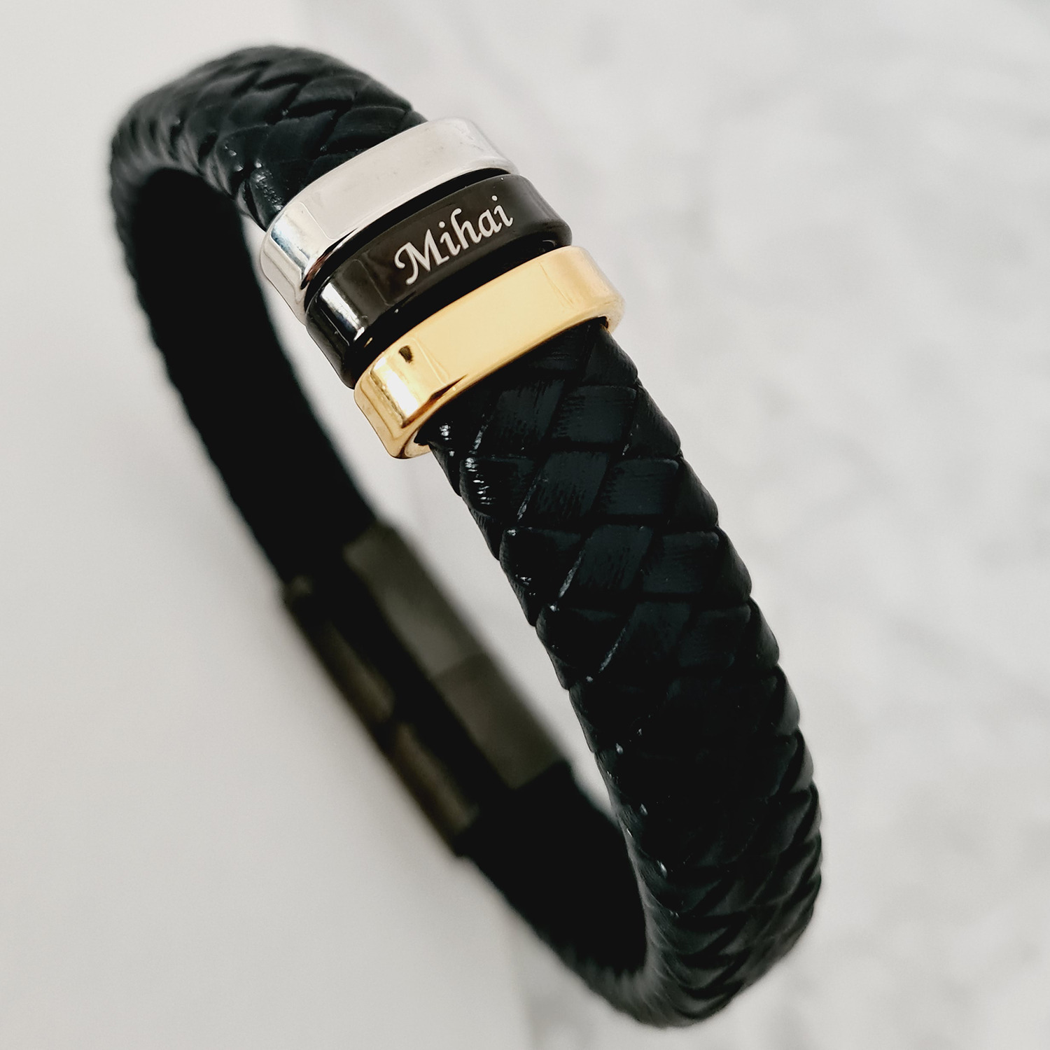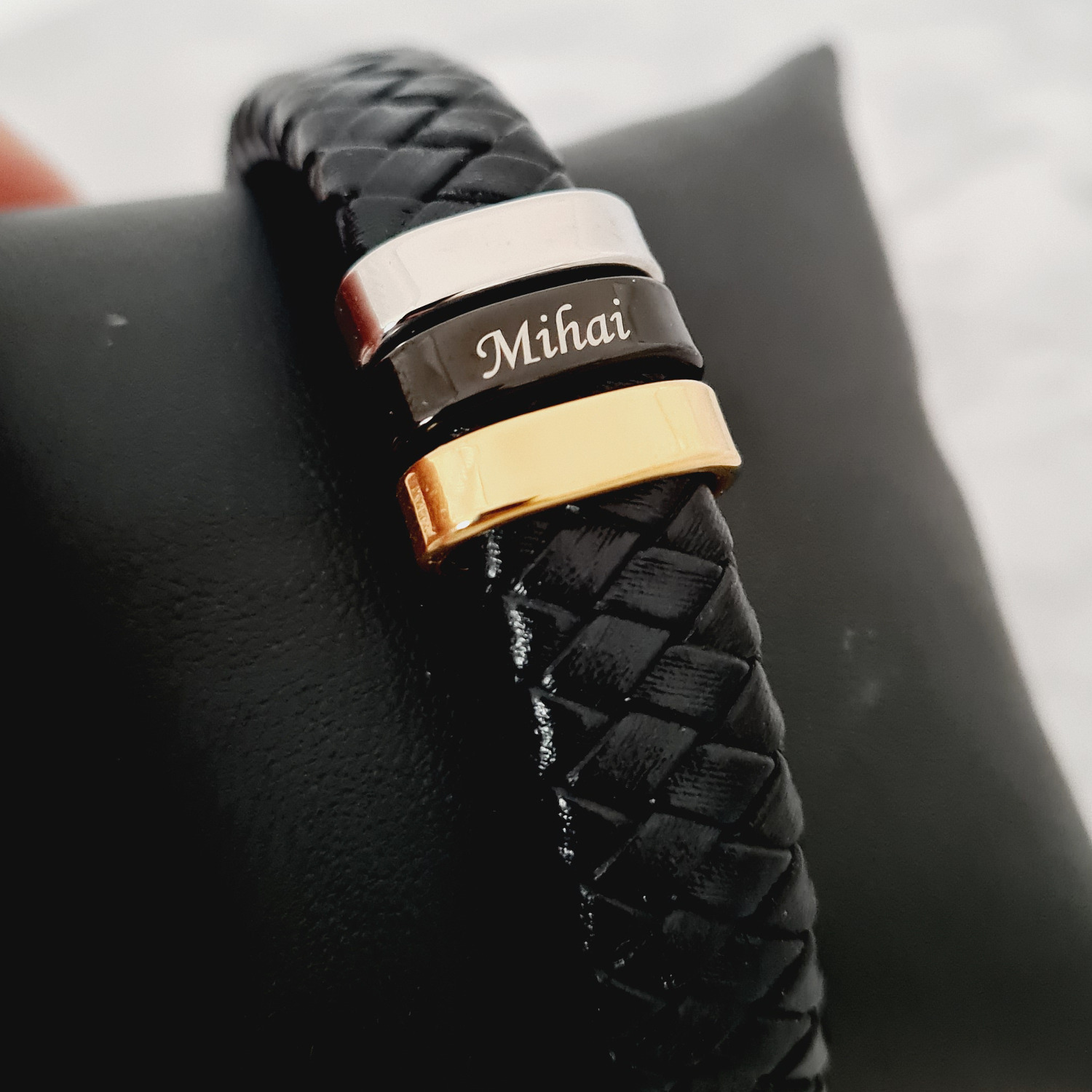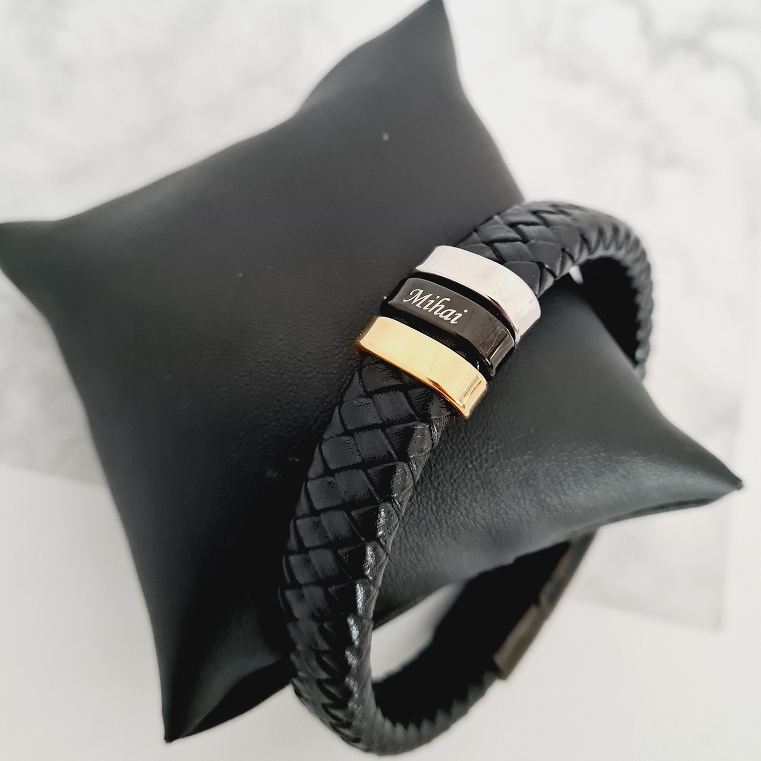Bratara barbateasca Strength - Elemente ovale inox in 3 culori - Piele impletita neagra cu inchizatoare sigura din inox