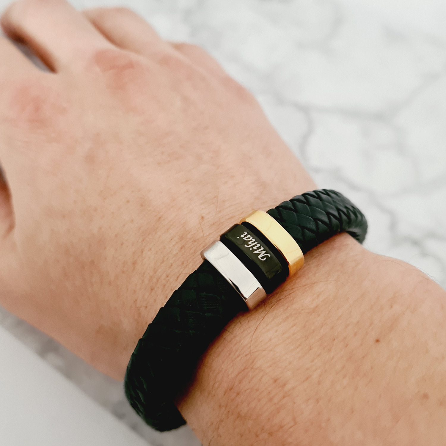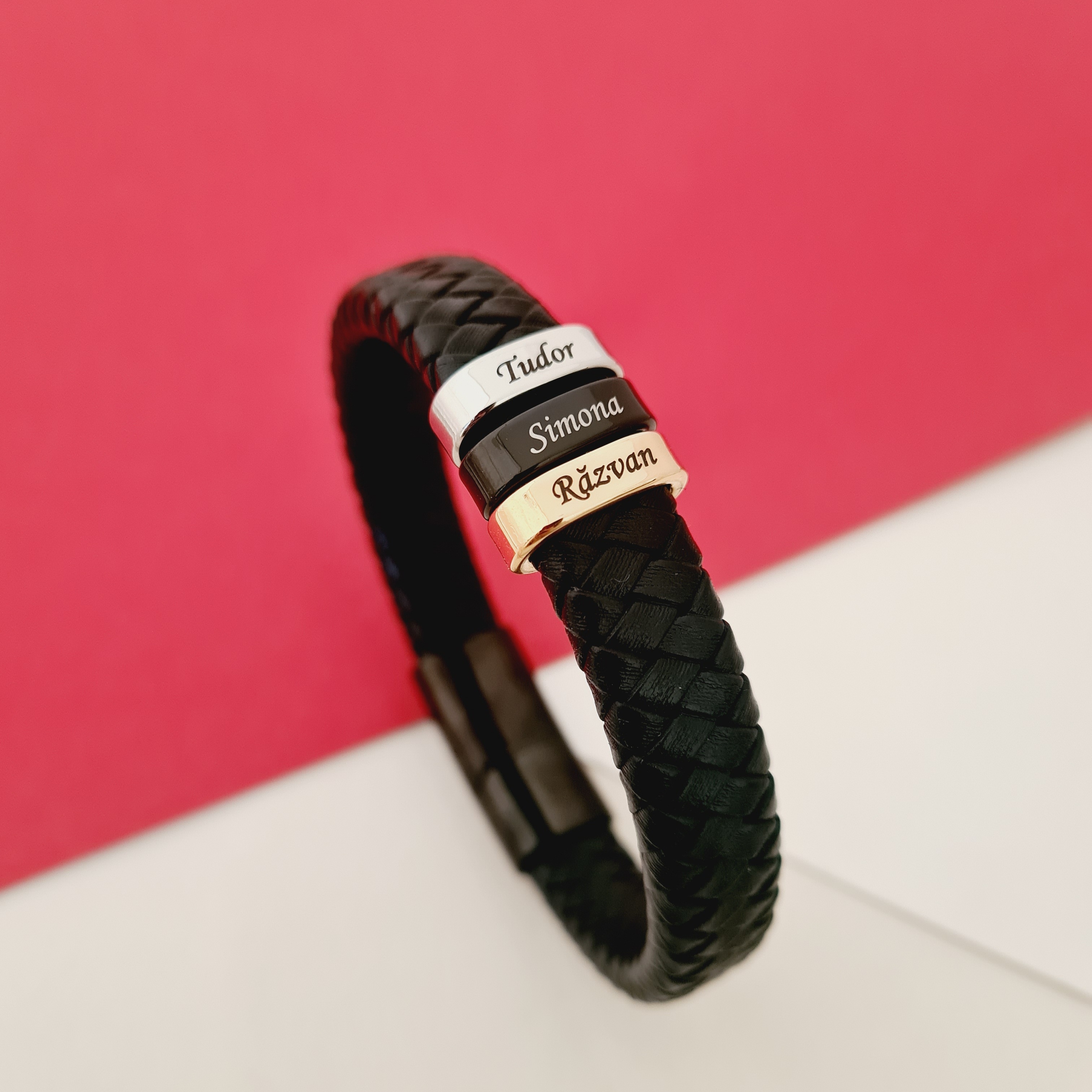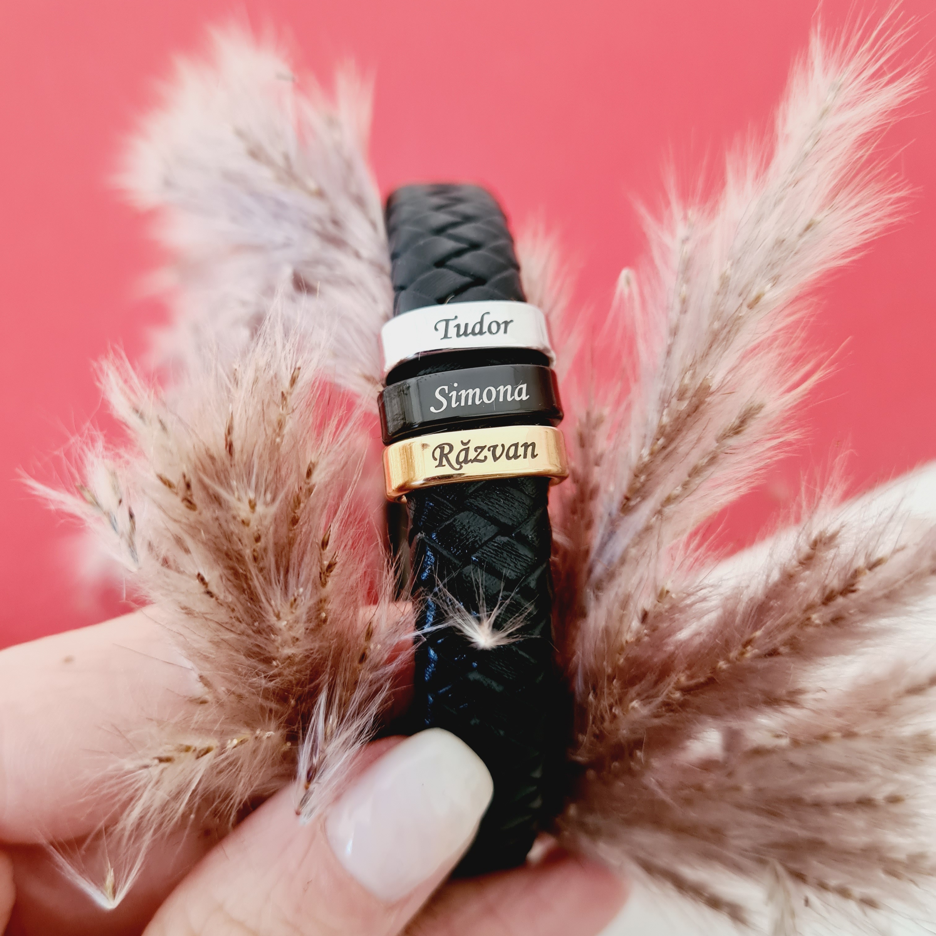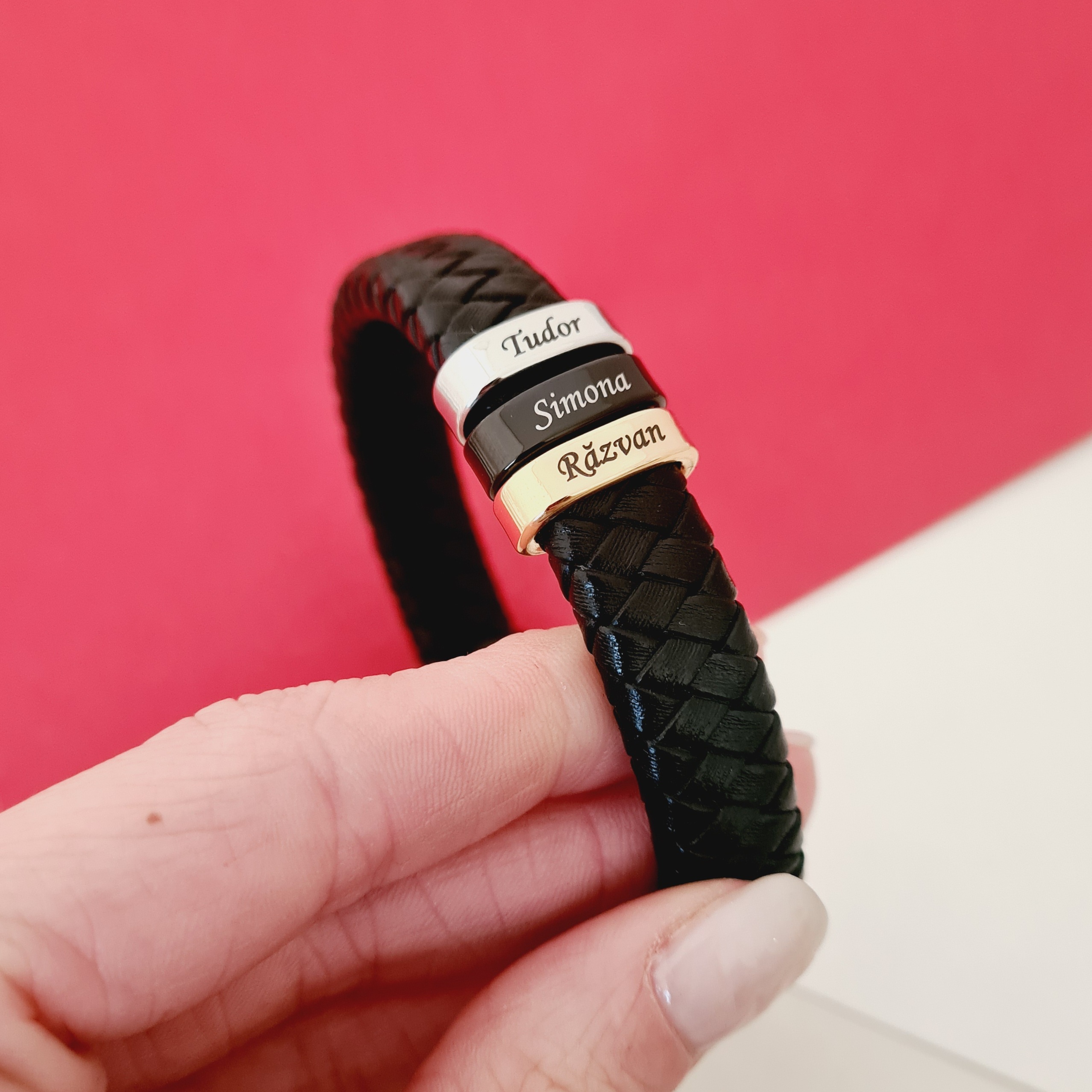 Bratara barbateasca Strength - Elemente ovale inox in 3 culori - Piele impletita neagra cu inchizatoare sigura din inox