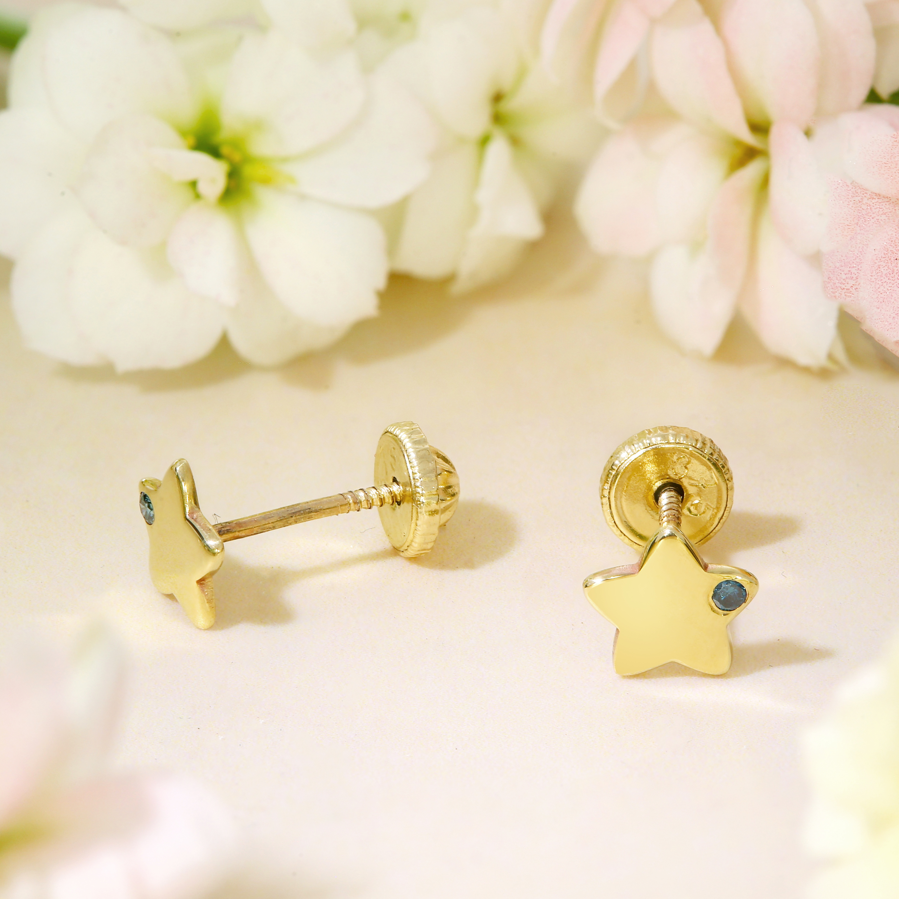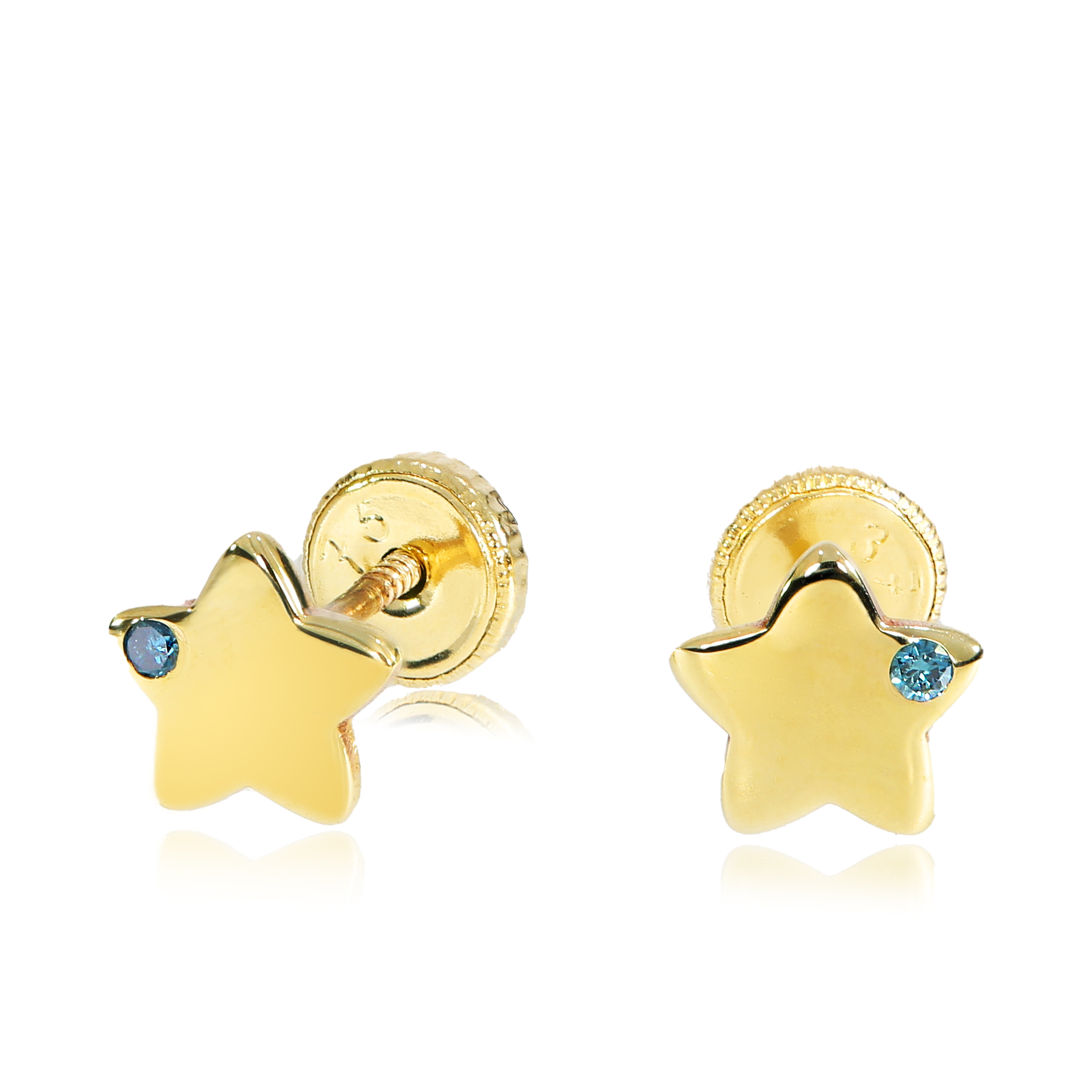 Cercei bebe/fetite cu Diamant natural albastru- Model stelute - Aur Galben 9K - Inchizatoare sigura si confortabila cu filet