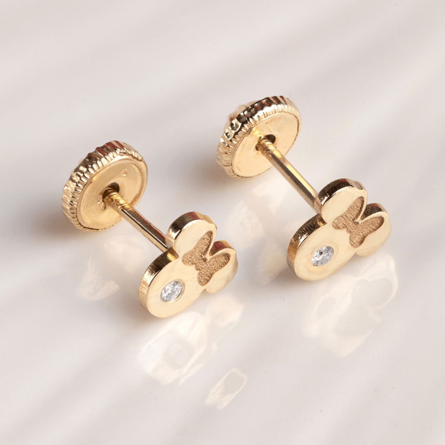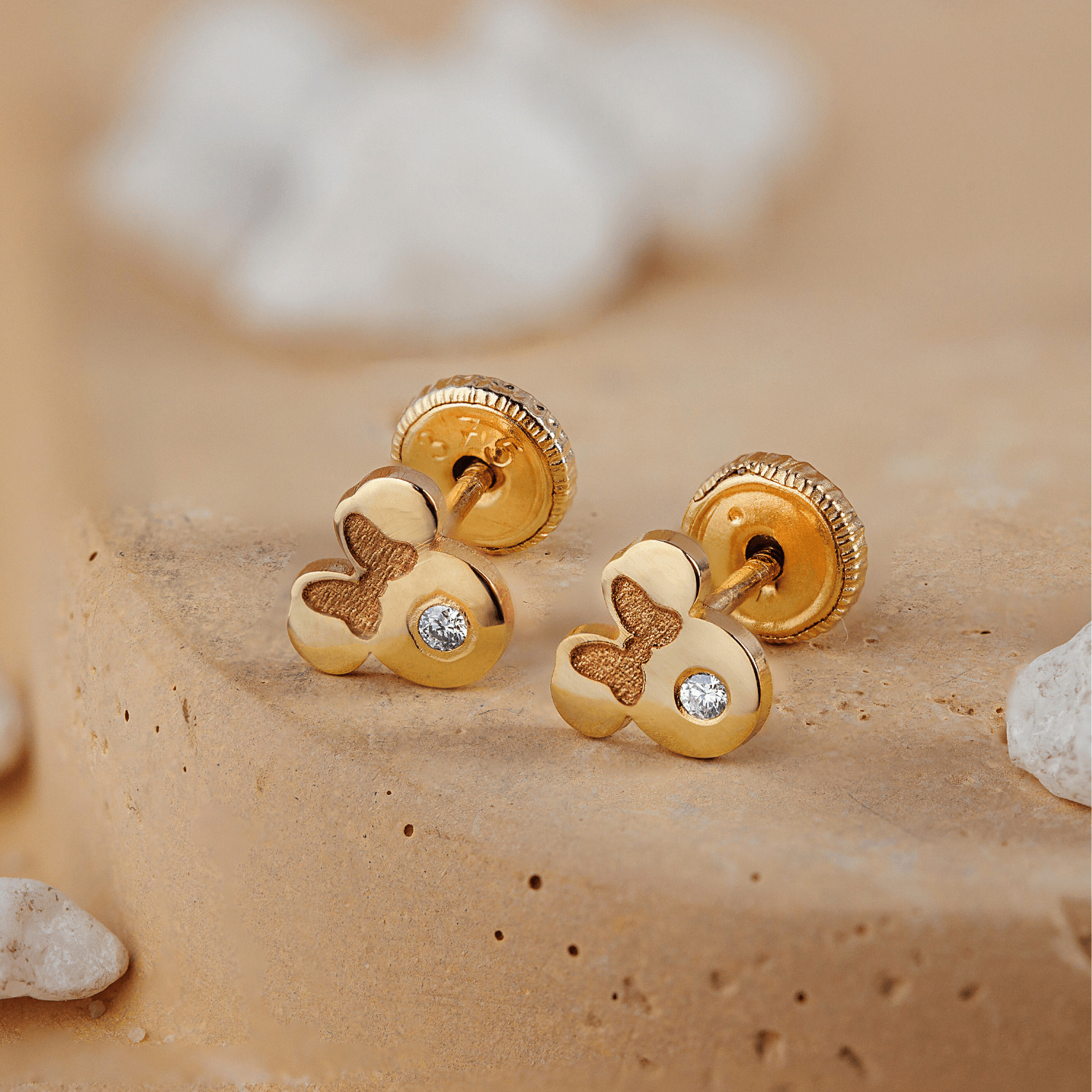 Cercei bebe cu Diamant natural - Cap de soricel cu funda maro - Aur Galben 9K - Inchizatoare filet