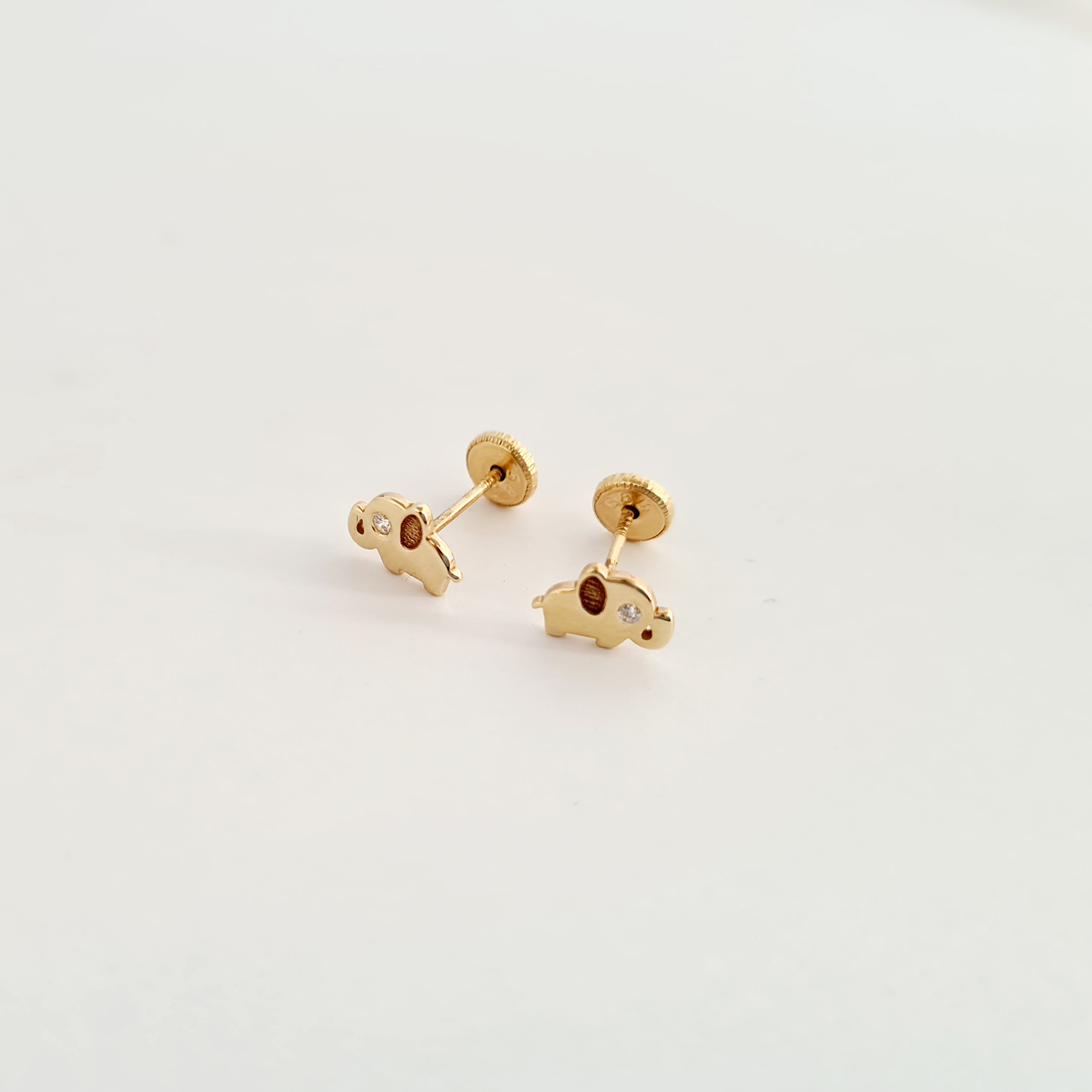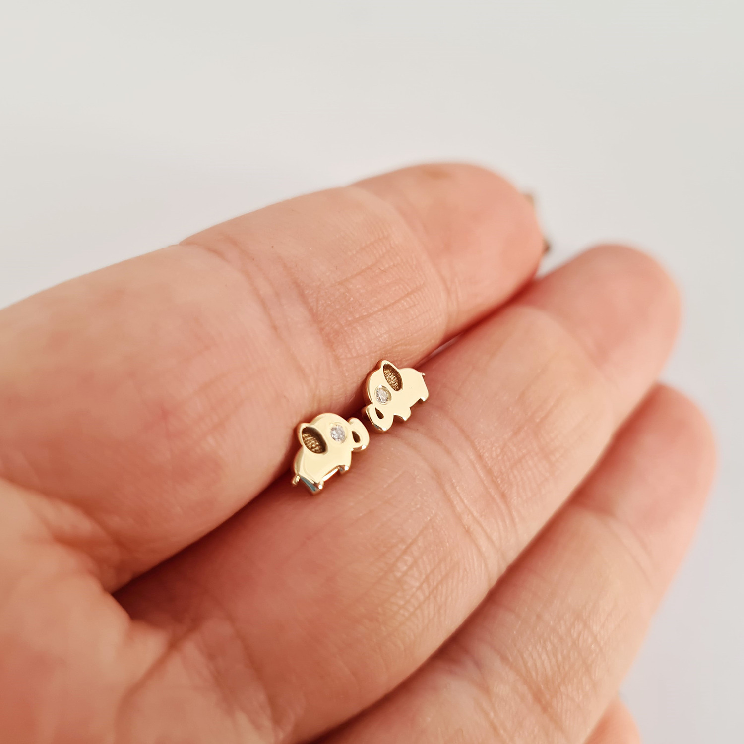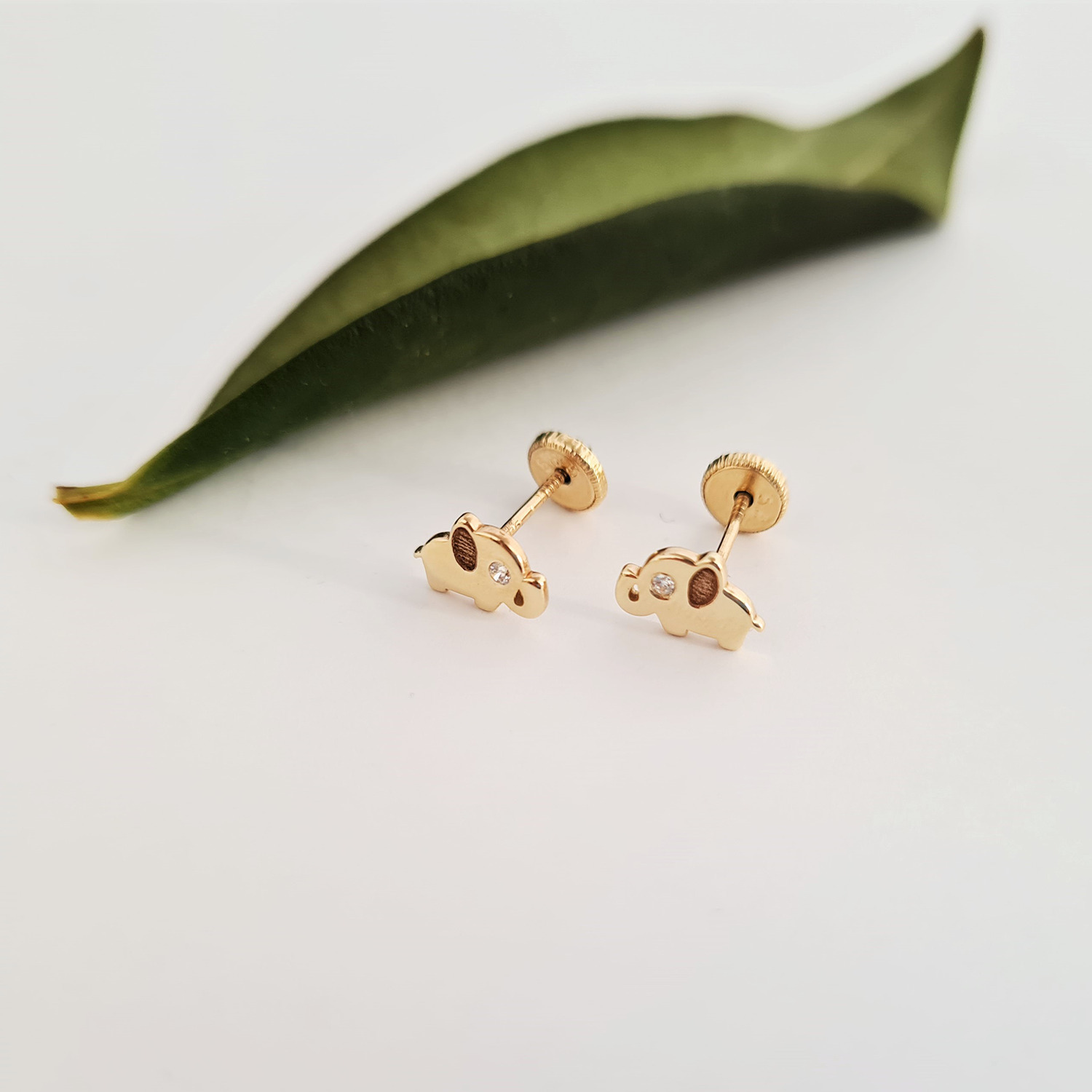 Cercei bebe/fetite cu Diamant naturat - Model elefantei - Aur Galben 14K - Inchizatoare sigura si confortabila cu filet