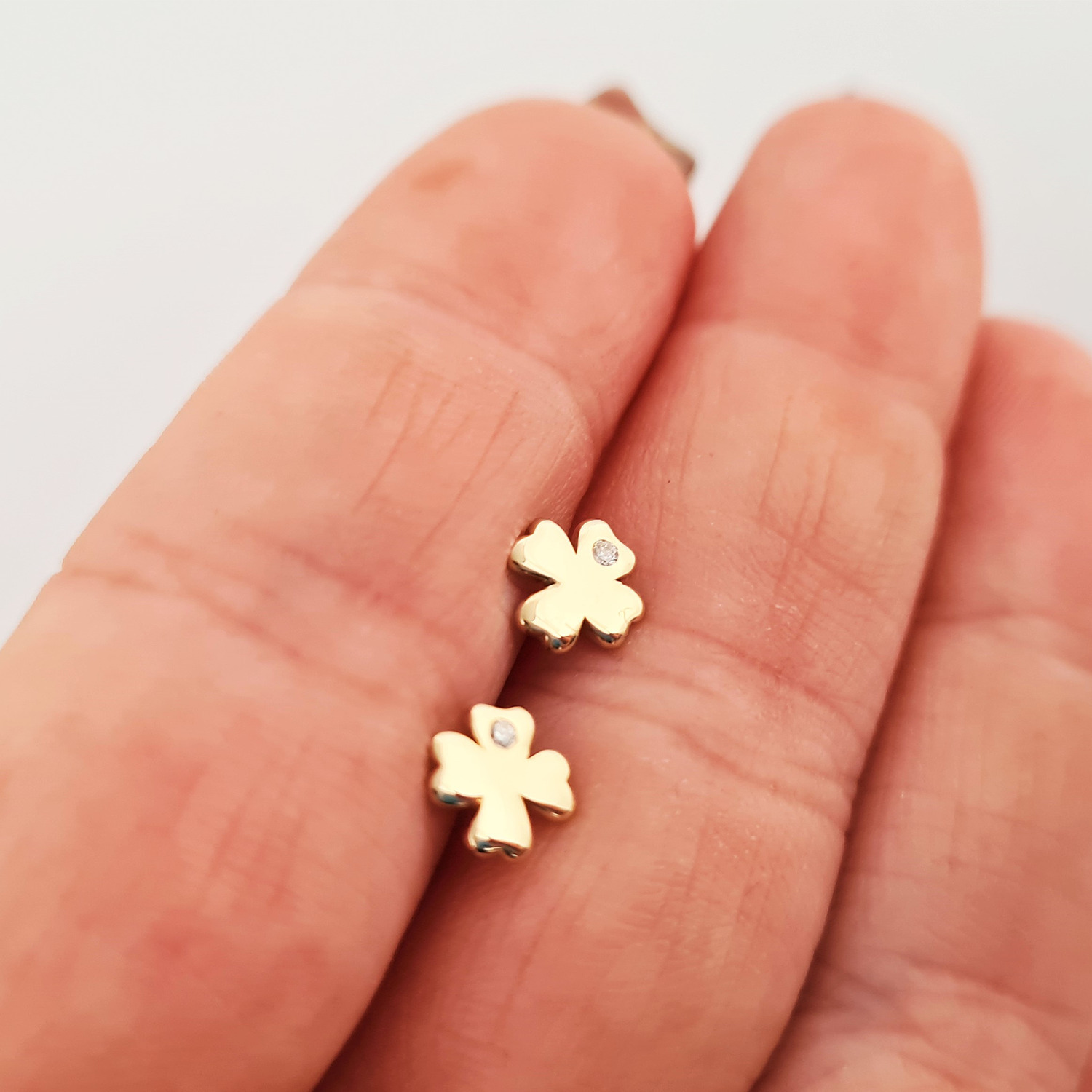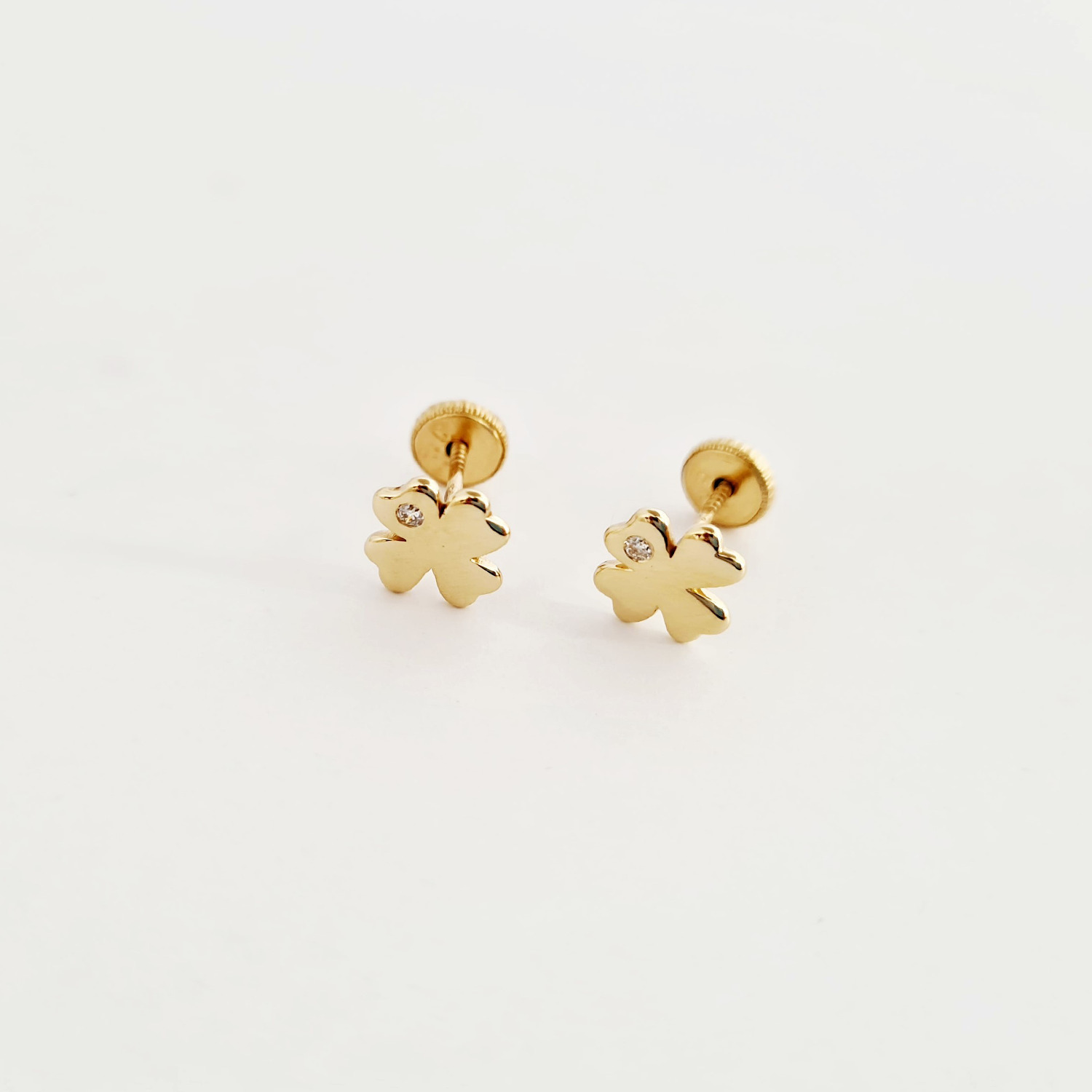 Cercei bebe/fetite cu Diamant natural - Model trifoi cu patru foi - Aur Galben 14K - Inchizatoare sigura si confortabila cu filet