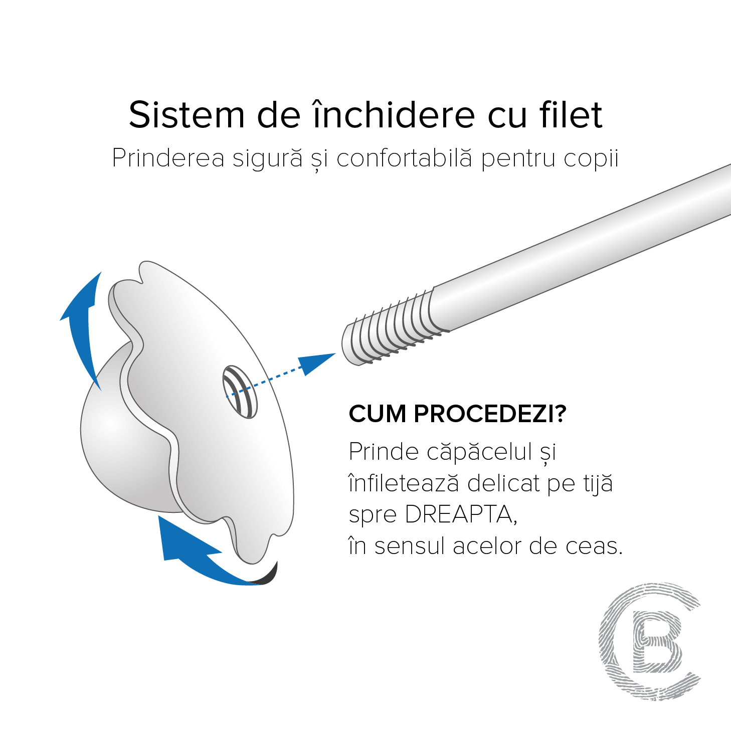 - Sistemul de inchidere este de tip filet cu capacel rotunjit pentru siguranta si protectie.