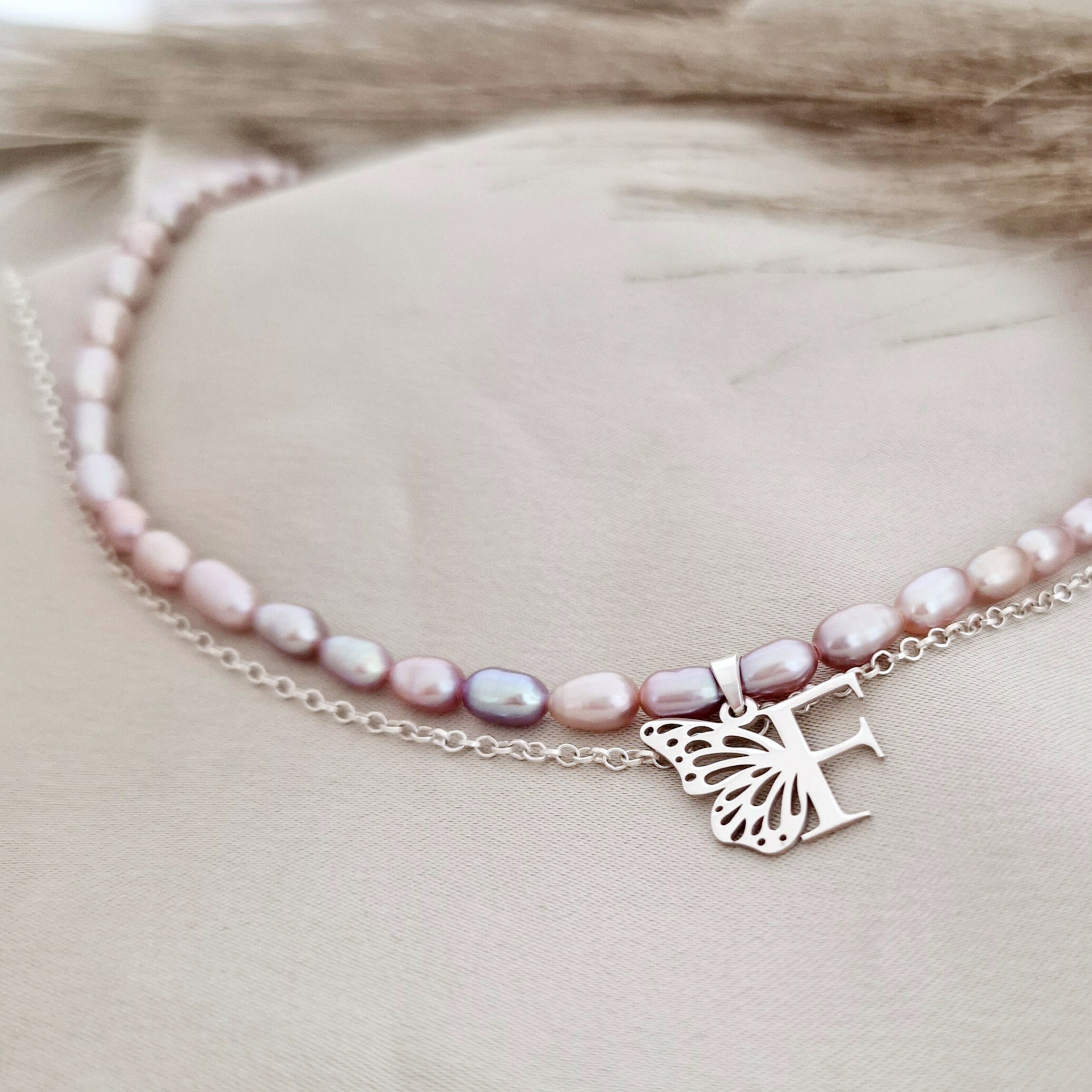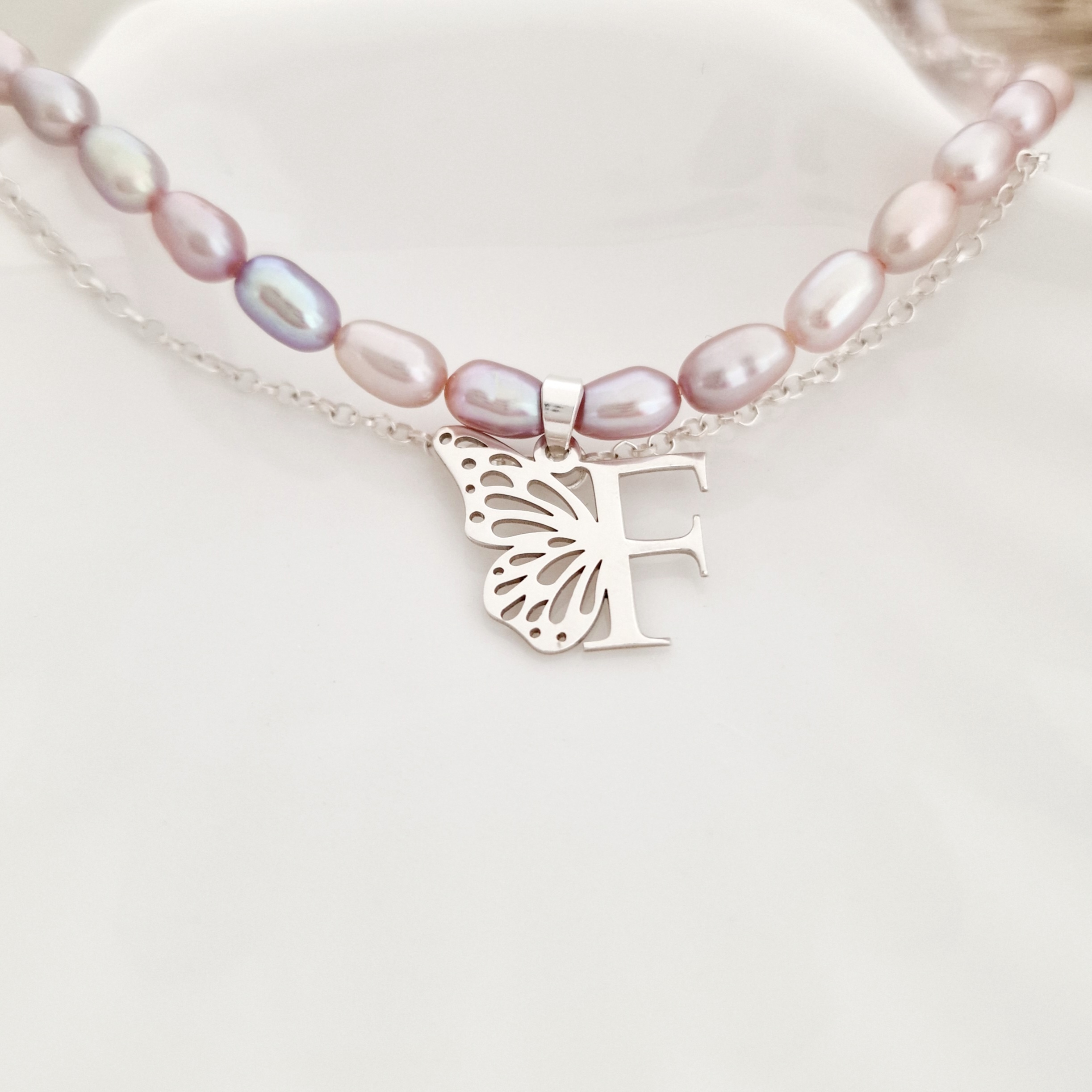 Lantisor cu Perle - Gratia initialei - Model 2 straturi cu sirag perle rice mov si lantisor cu initiala si aripa de fluture - Argint 925