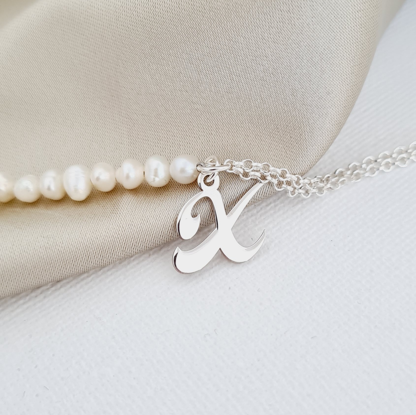 - Initiala are dimensiunea de 10 mm si este prinsa de o bratara formata dintr-un sirag de perle unit de lantisor elegant.