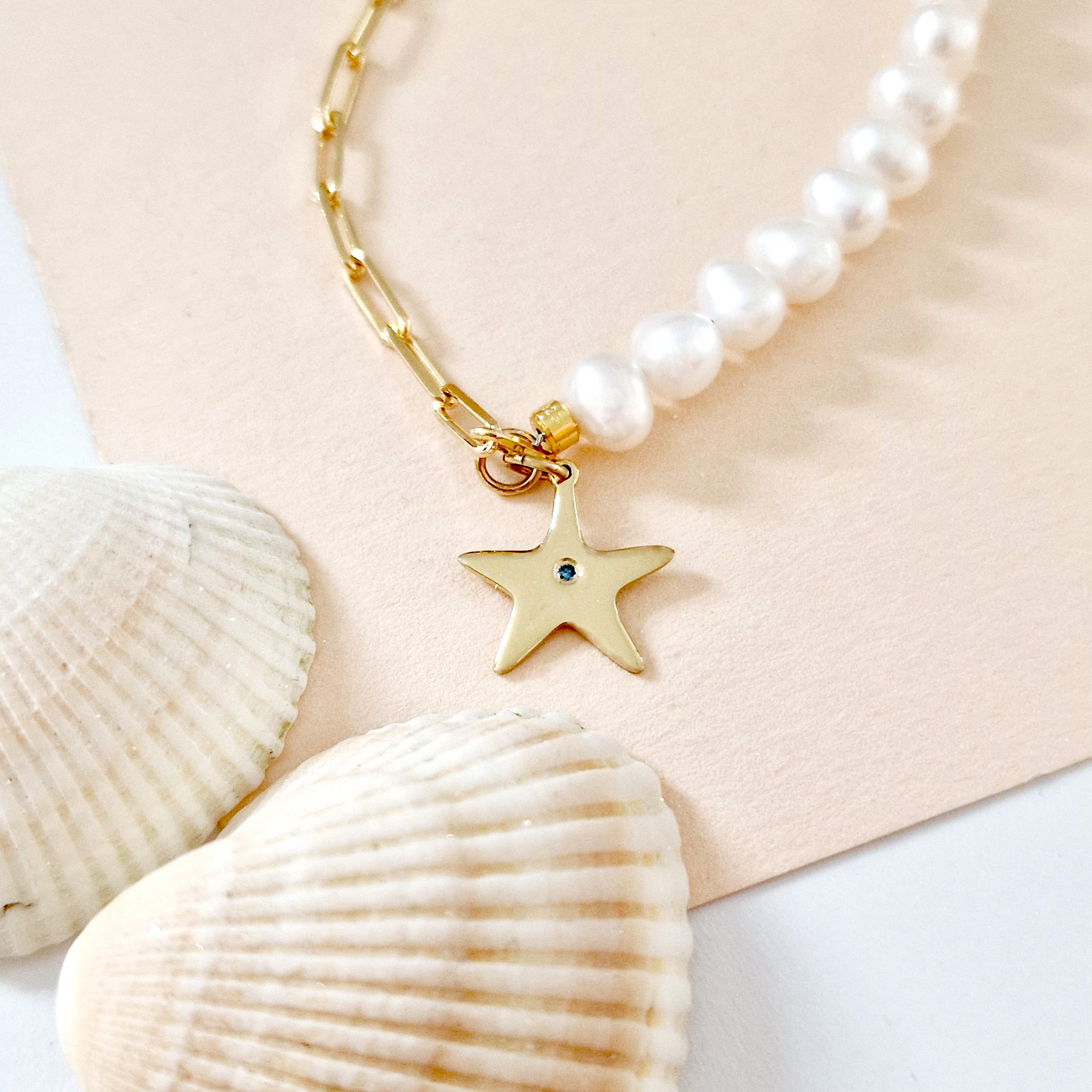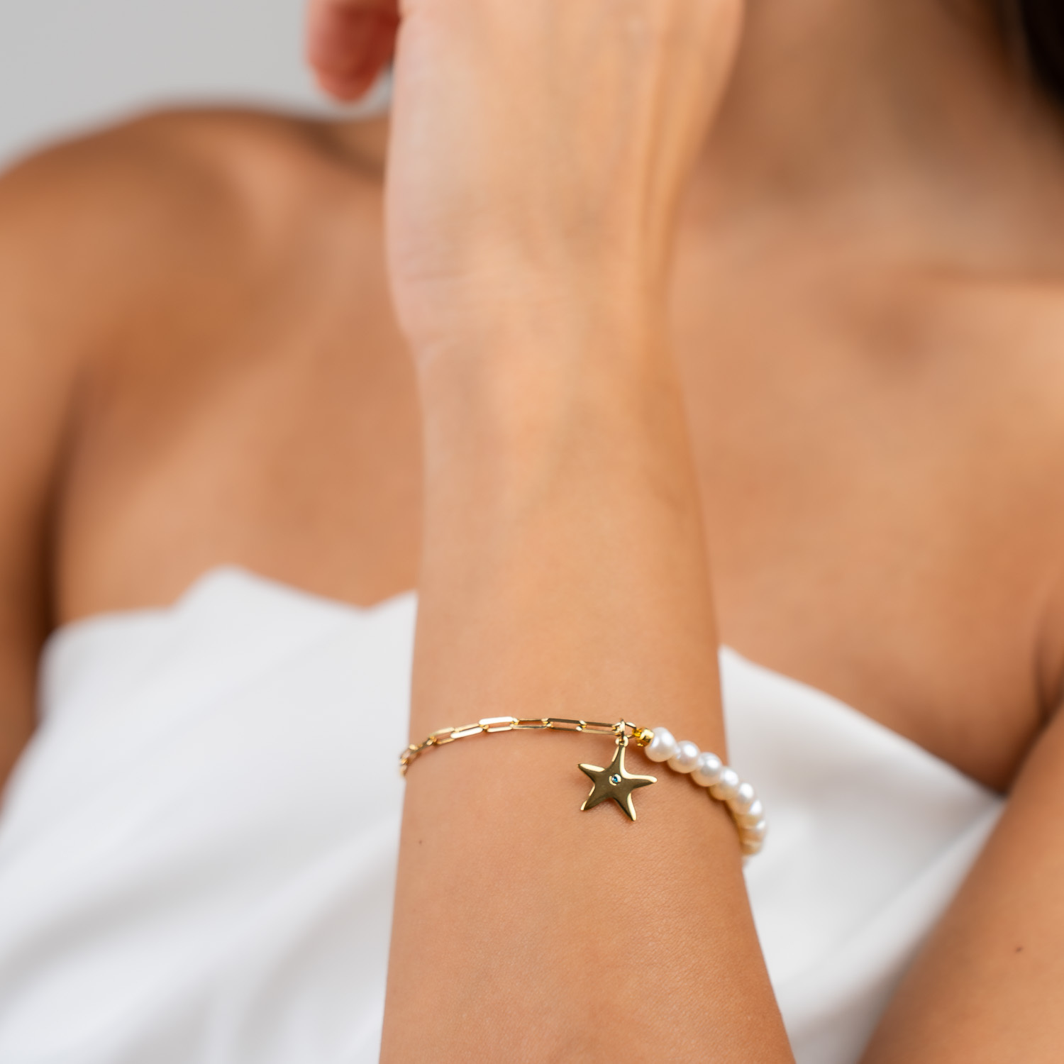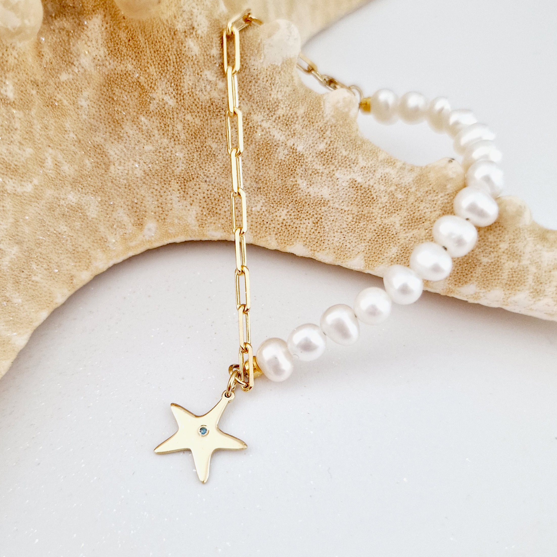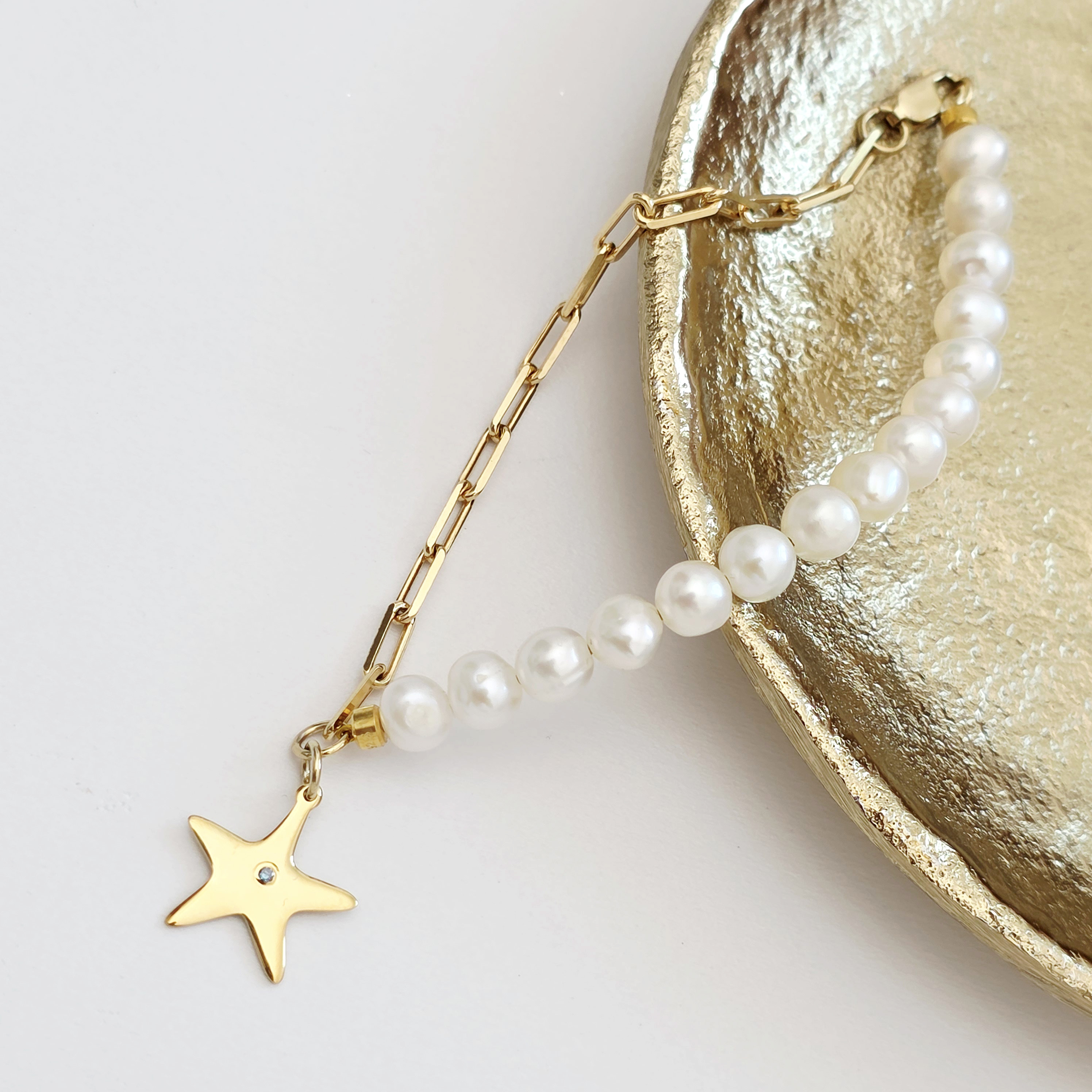 Bratara cu Perle si Diamant natural - Stella Marina - Model combinat cu perle si lantisor zale - Argint 925 placat cu Aur Galben 18K