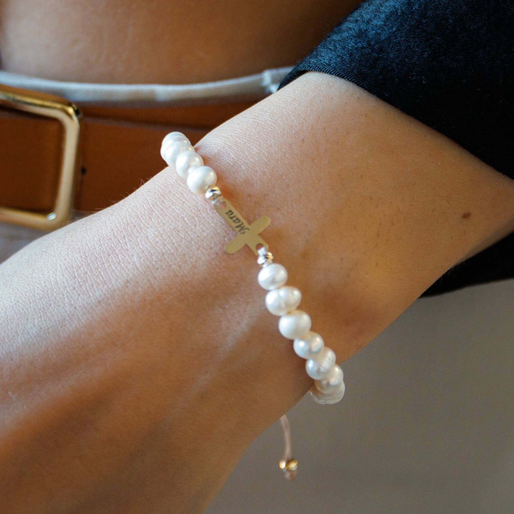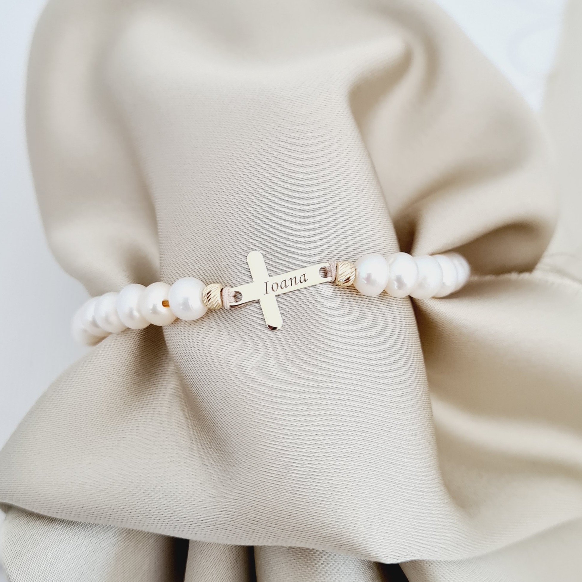 Bratara Perle - Cruce personalizata din Aur Galben 9K - Model cu sirag perlat si snur reglabil