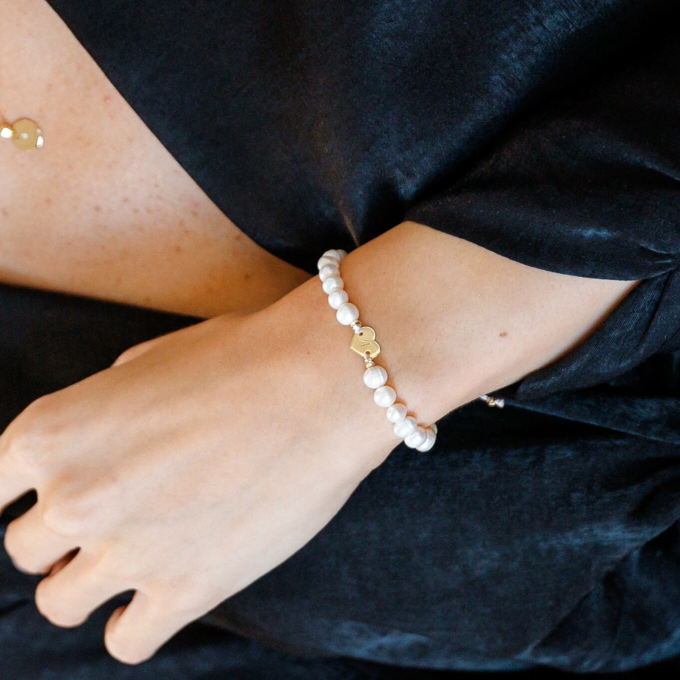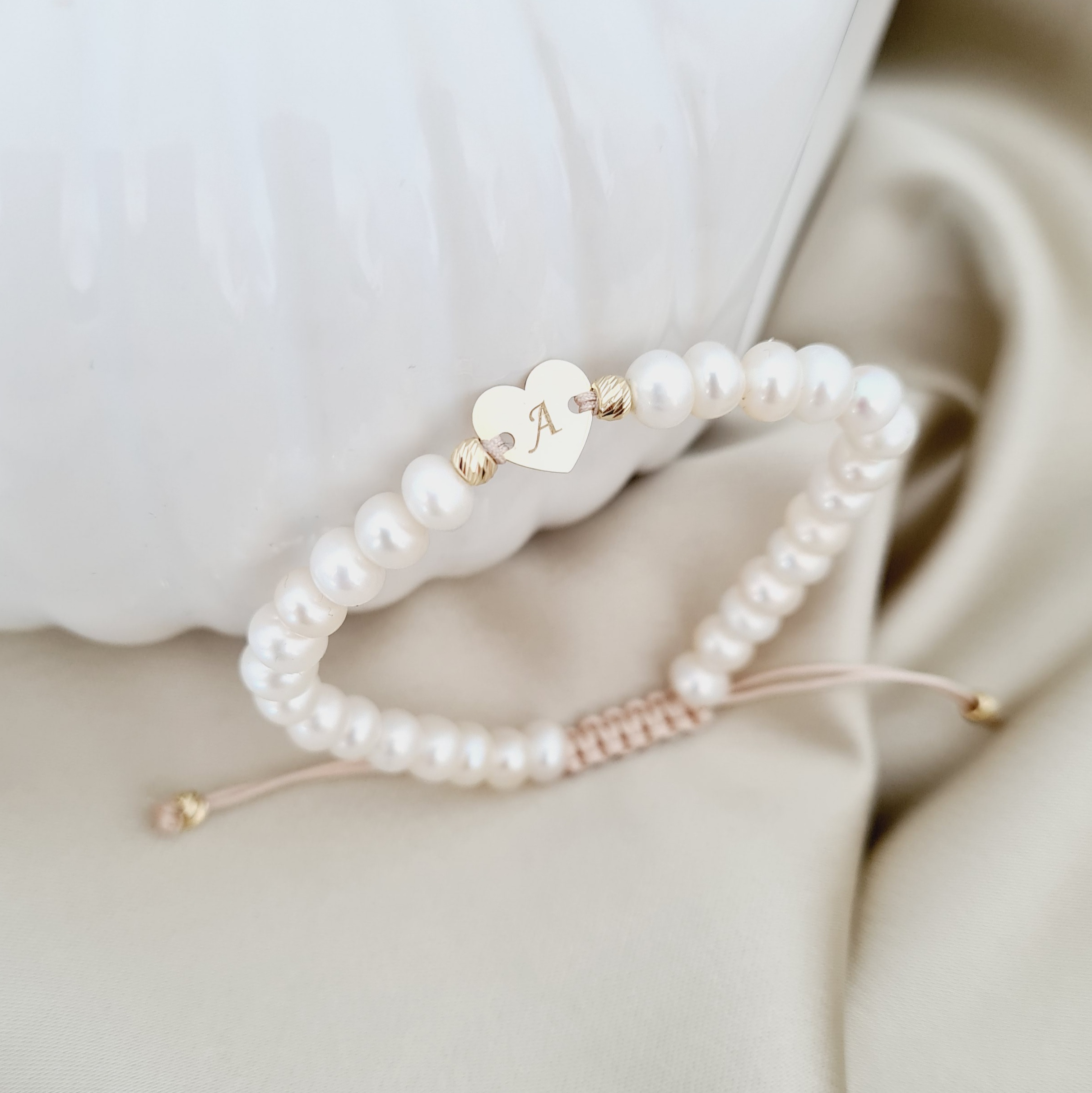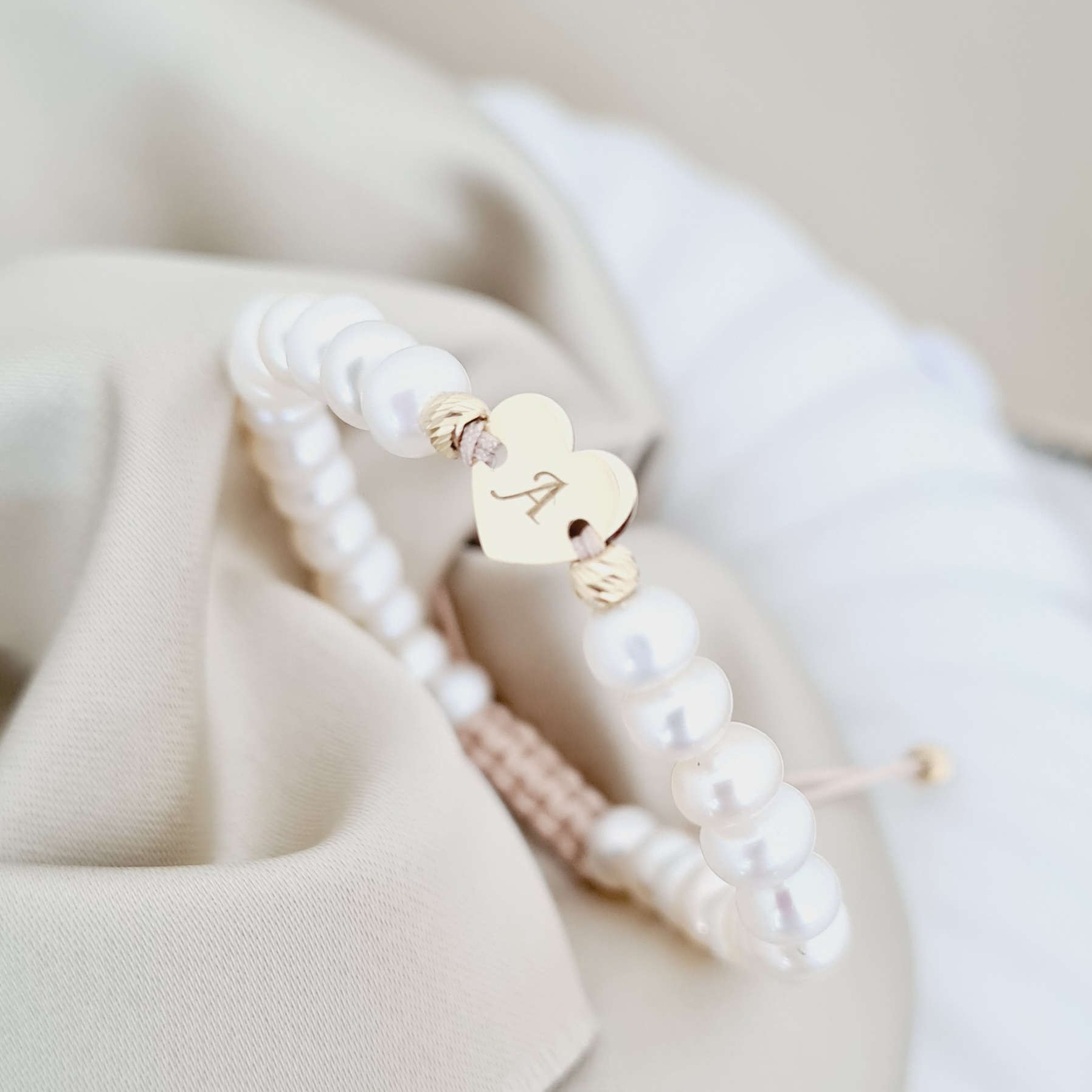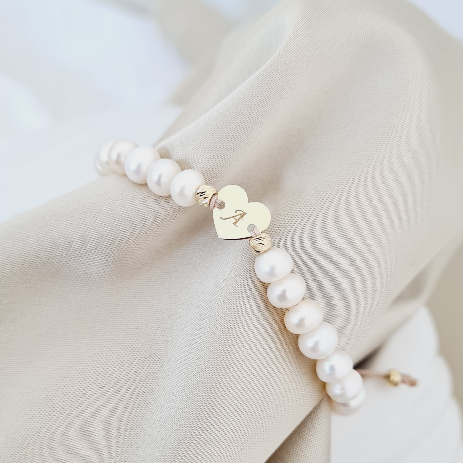 Bratara Perle - Inima personalizata din Aur Galben 9K - Model cu sirag perlat si snur reglabil